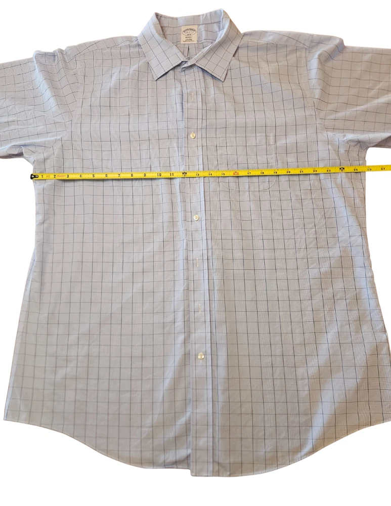 Brooks Brothers 1818 Regent Fit Non-Iron Dress Shirt in excellent pre-owned condition. Classic light blue base with sophisticated navy windowpane check pattern—perfect for the office or dressed down on weekends. The Regent fit offers a comfortable, traditional cut through the body. Non-iron finish means this shirt comes out of the dryer ready to wear with minimal touch-up. Made from 100% cotton for breathability and all-day comfort.