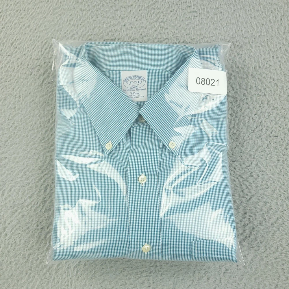 Brooks Brothers 346 Dress Shirt Mens 17 Blue Gingham Slim Non Iron Cotton Brand: Brooks Brothers Style: Mens long sleeve 346 collection dress shirt with slim fit silhouette and button-down collar. Color: Light blue and white micro gingham check pattern. Size on tag: Mens 17, slim fit. Material: 100% cotton non-iron woven shirting fabric. Made in Malaysia. Features: The Original Polo Shirt branding from the Brooks Brothers 346 line, button-down collar, full front button placket with white buttons, single chest pocket, back box pleat for ease of movement, long sleeves with adjustable barrel cuffs, non-iron finish designed to resist wrinkles and minimize ironing, versatile styling appropriate for business office, professional, or smart casual wear. Measurements are included in the photos, compare measurements with your item to ensure proper fit. Items are added daily click here to Visit My Store Combined shipping for US customers is 1.99 for each additional item Items are cleaned per eBay standards & policies
