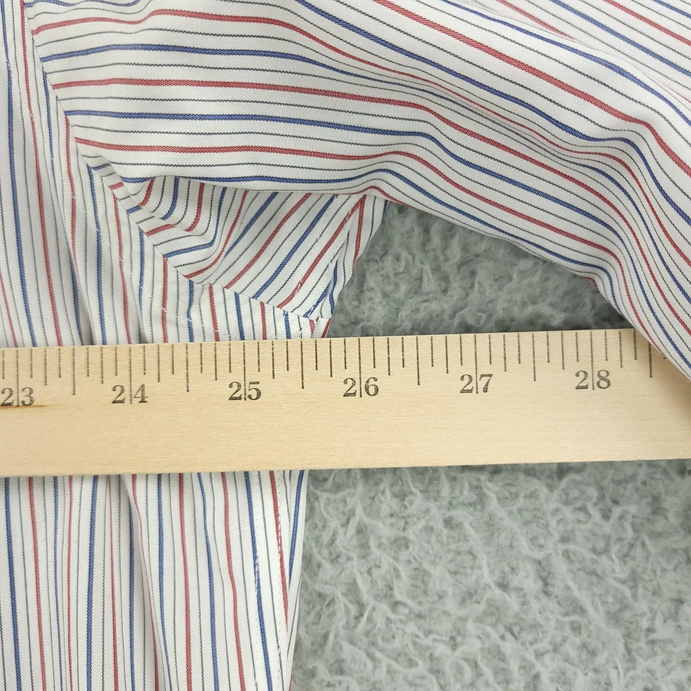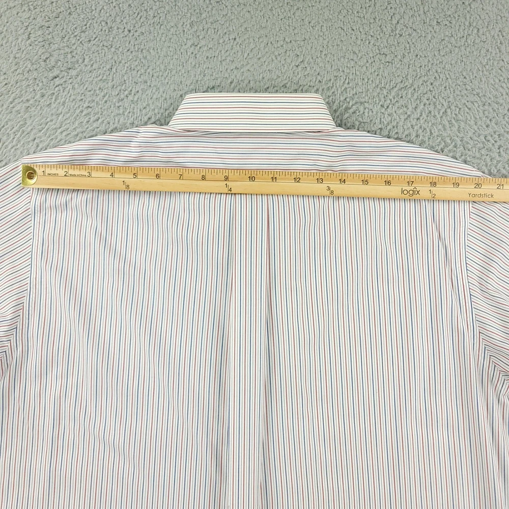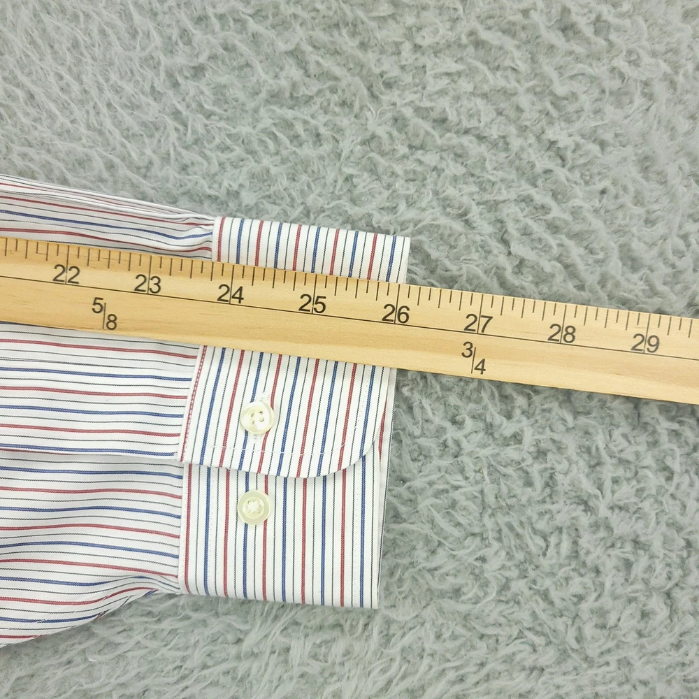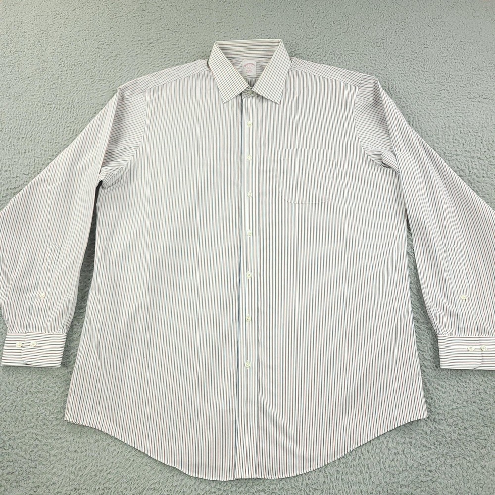Brooks Brothers 346 Dress Shirt Mens 17 White Stripe Non Iron Cotton Brand: Brooks Brothers 346. Style: Mens long sleeve button-up dress shirt with a full button front and point collar. Color: White base with narrow vertical blue, red, and black pinstripes. Size on tag: Mens 17 Material: 100% cotton woven fabric. Made in China. Features: Regular fit silhouette with non-iron finish for easy care, single chest patch pocket, full button front placket with pearlized buttons, long sleeves with double-button barrel cuffs and sleeve plackets, back yoke with center box pleat for ease of movement, curved shirttail hem designed to be worn tucked, interior neck label with Brooks Brothers 346 branding, size, fit, fabric, and country of origin details. Measurements are included in the photos, compare measurements with your item to ensure proper fit. Items are added daily click here to Visit My Store Combined shipping for US customers is 1.99 for each additional item Items are cleaned per eBay standards & policies