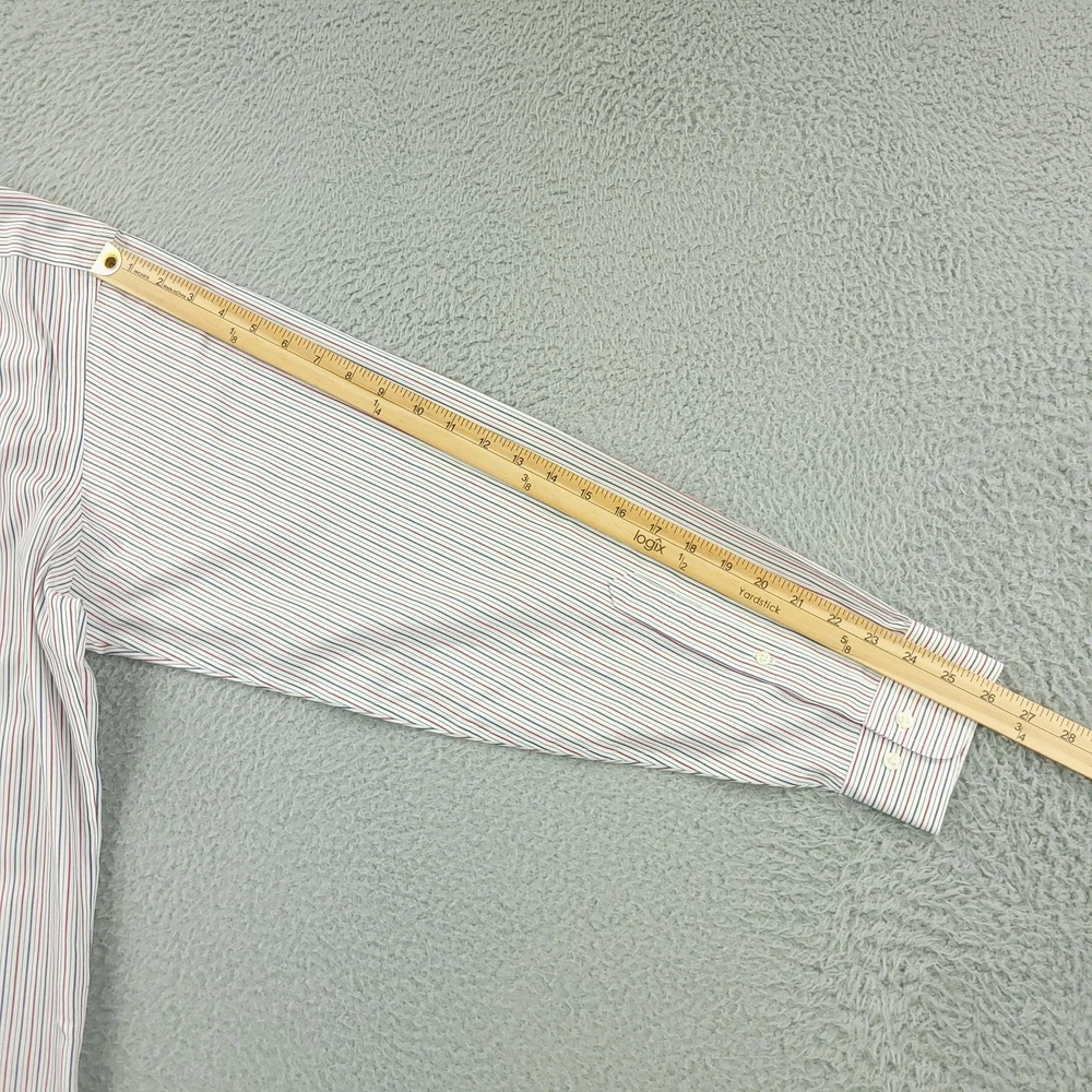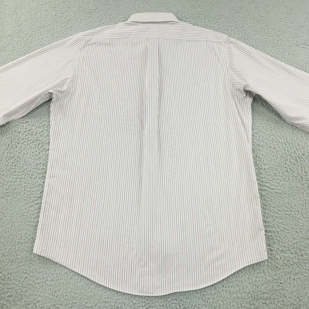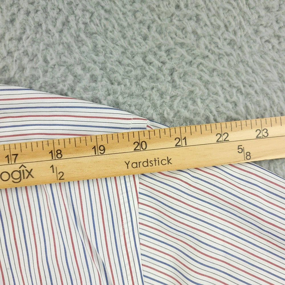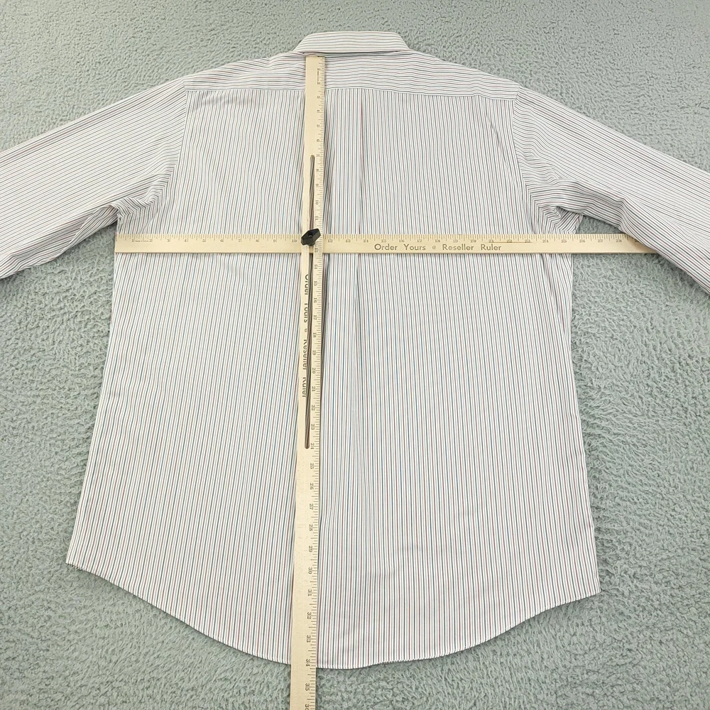 Brooks Brothers 346 Dress Shirt Mens 17 White Stripe Non Iron Cotton Brand: Brooks Brothers 346. Style: Mens long sleeve button-up dress shirt with a full button front and point collar. Color: White base with narrow vertical blue, red, and black pinstripes. Size on tag: Mens 17 Material: 100% cotton woven fabric. Made in China. Features: Regular fit silhouette with non-iron finish for easy care, single chest patch pocket, full button front placket with pearlized buttons, long sleeves with double-button barrel cuffs and sleeve plackets, back yoke with center box pleat for ease of movement, curved shirttail hem designed to be worn tucked, interior neck label with Brooks Brothers 346 branding, size, fit, fabric, and country of origin details. Measurements are included in the photos, compare measurements with your item to ensure proper fit. Items are added daily click here to Visit My Store Combined shipping for US customers is 1.99 for each additional item Items are cleaned per eBay standards & policies