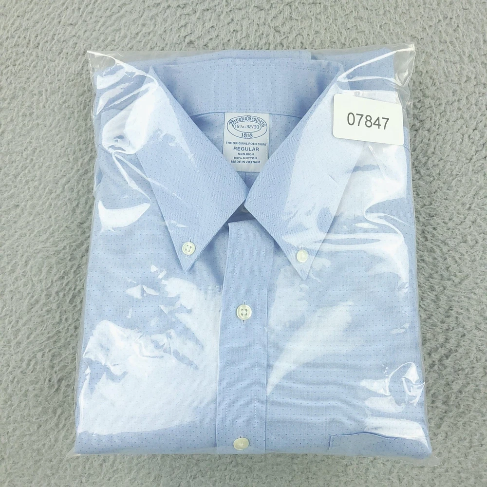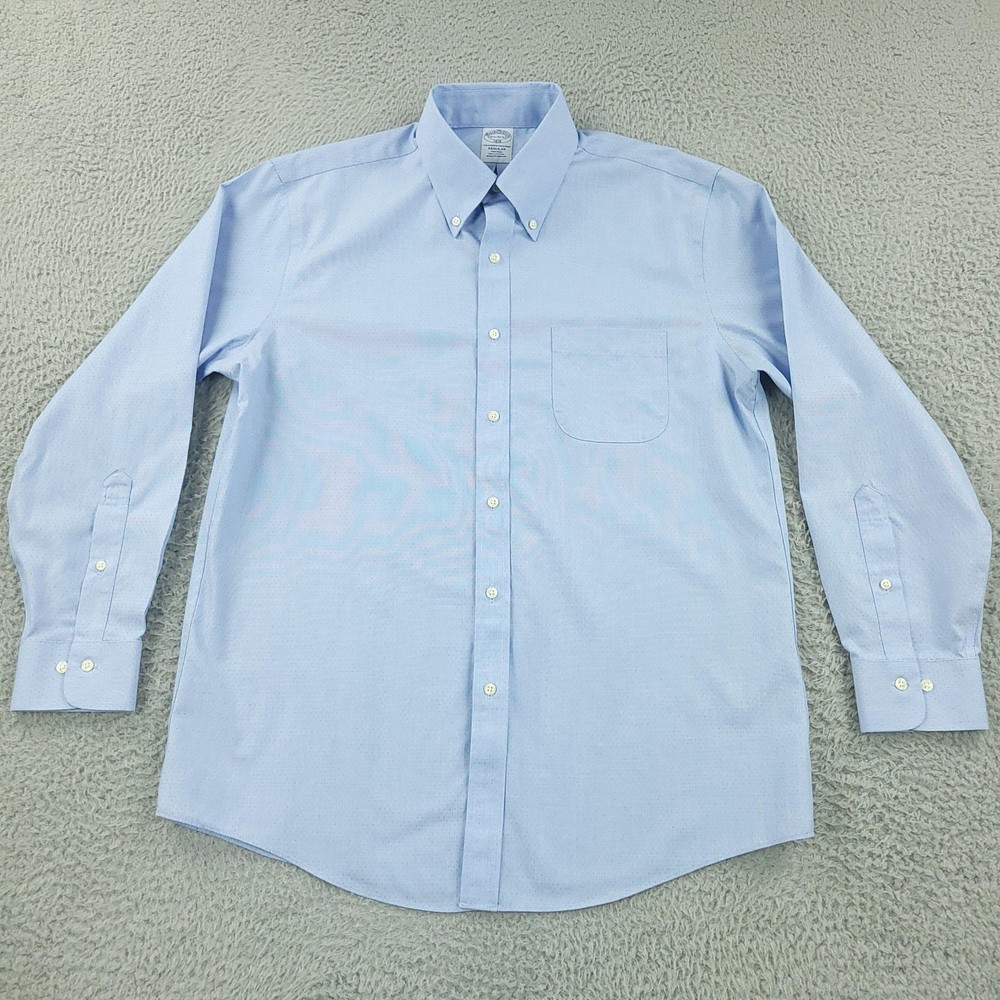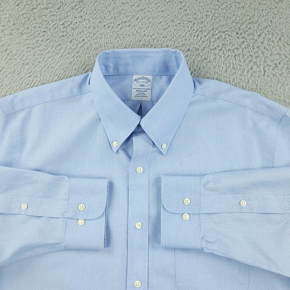 Brooks Brothers Dress Shirt Mens 15.5 Regular Blue Geometric Non Iron Cotton Brand: Brooks Brothers Style: Mens long sleeve button-front dress shirt with a button-down collar and regular fit silhouette. Color: Light blue base with subtle micro geometric dot pattern. Size : Mens 15.5 Material: 100% cotton non-iron woven fabric. Made in Vietnam. Details: Inner neck label with Brooks Brothers 1818 branding and The Original Polo Shirt wording, full front button placket with white buttons, button-down collar points, single left chest pocket, barrel cuffs with adjustable buttons plus sleeve placket button, back yoke with center box pleat, and curved shirttail hem. Features: Easy-care non-iron construction designed to resist wrinkles, breathable cotton fabric suitable for all-season wear, classic button-down collar for a polished look, and versatile style ideal for business, office, or smart casual occasions. Measurements are included in the photos, compare measurements with your item to ensure proper fit. Items are added daily click here to Visit My Store Combined shipping for US customers is 1.99 for each additional item Items are cleaned per eBay standards & policies