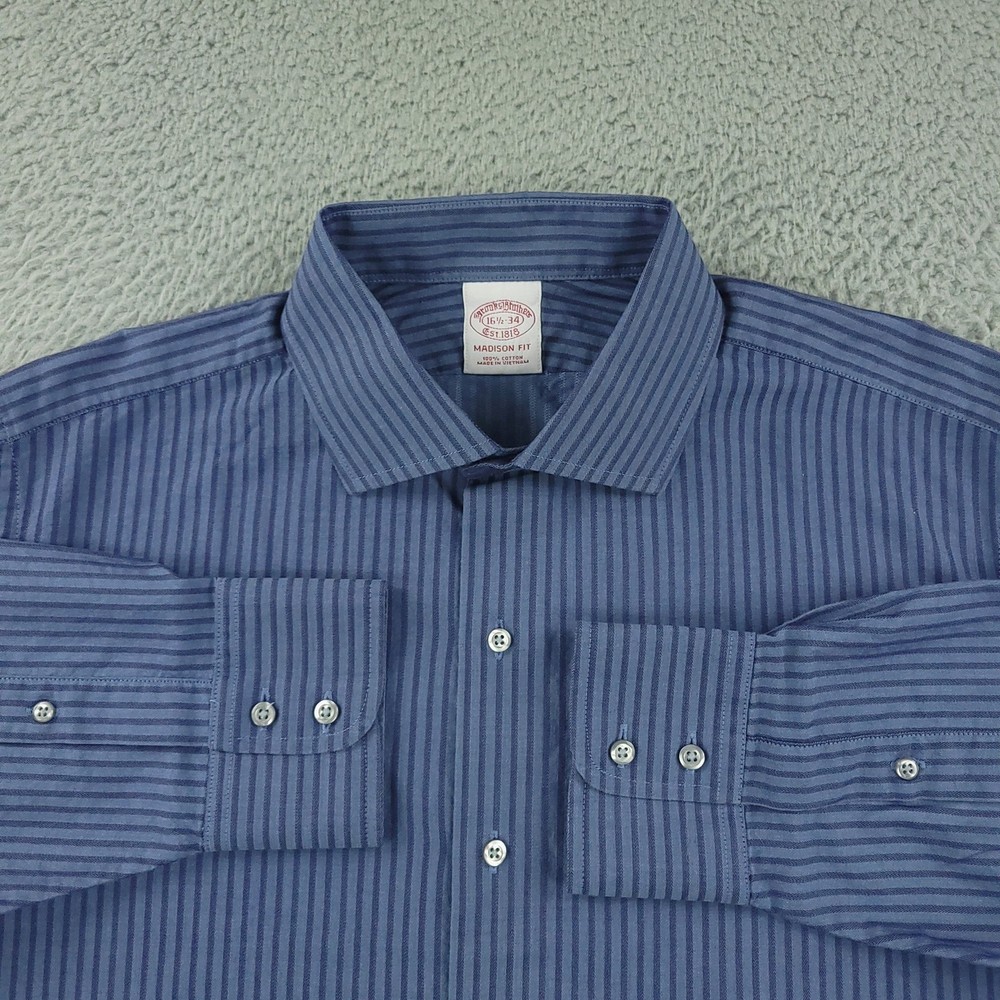 Brooks Brothers Dress Shirt Mens 16.5 Blue Stripe Madison Fit Cotton Brand: Brooks Brothers Style: Mens long sleeve dress shirt with full button front placket, spread collar, and classic Madison fit silhouette. Color: Blue with tonal vertical stripe pattern. Size on tag: Mens 16 1/2 Material: 100% cotton woven fabric. Made in Vietnam. Features: Classic dress shirt styling suitable for business or office wear, crisp spread collar, barrel cuffs closure and sleeve placket button, shirt-tail hem designed to be tucked in, subtle textured stripe for a polished professional look. Measurements are included in the photos, compare measurements with your item to ensure proper fit. Items are added daily click here to Visit My Store Combined shipping for US customers is 1.99 for each additional item Items are cleaned per eBay standards & policies