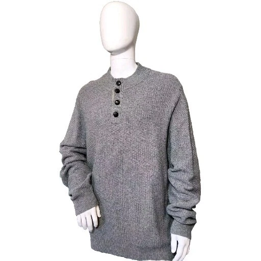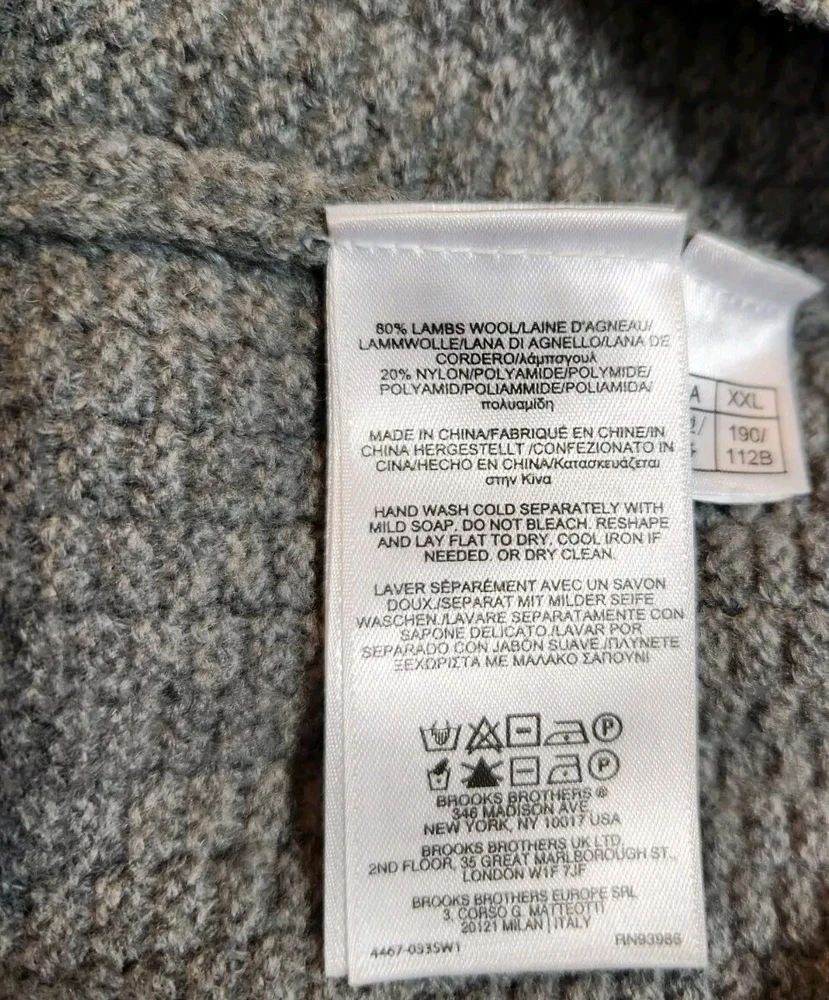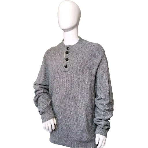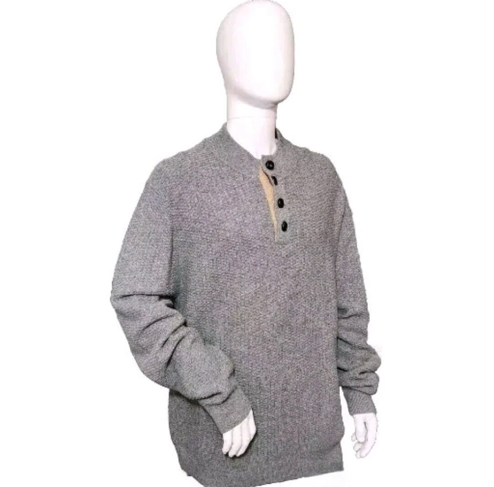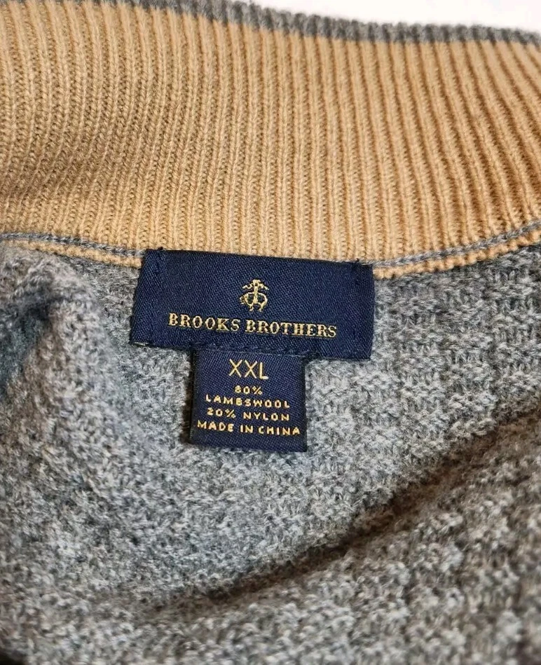 Brooks Brothers Gray Lambswool Nylon Blend 4 button Pullover Sweater Men's size 2XL XXL. Brown leather woven buttons. Textured thick sweater. Measurements: Chest: 25" pit to pit; Shoulder to shoulder; 20.5"; Sleeve: 29.75"; Length: 30" from center back of neck to back hem; *Note: mannequin is a size small Material: 80% Lambswool; 20% Nylon Hand wash