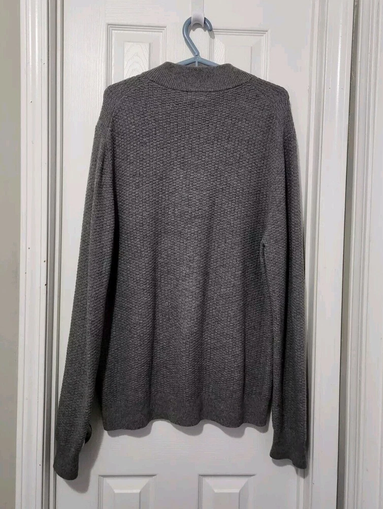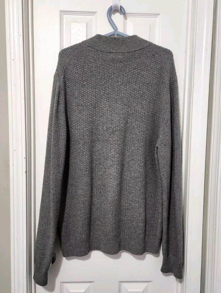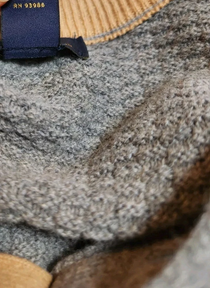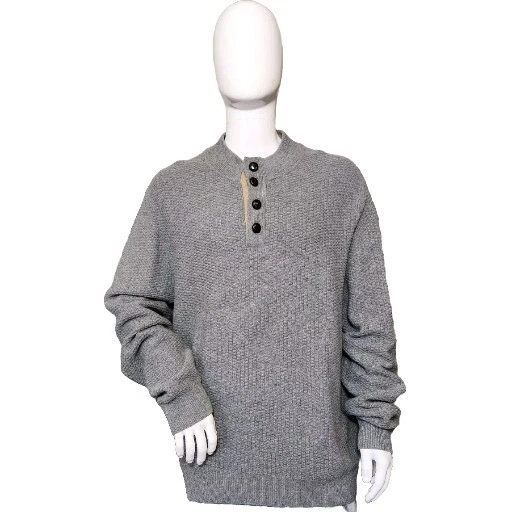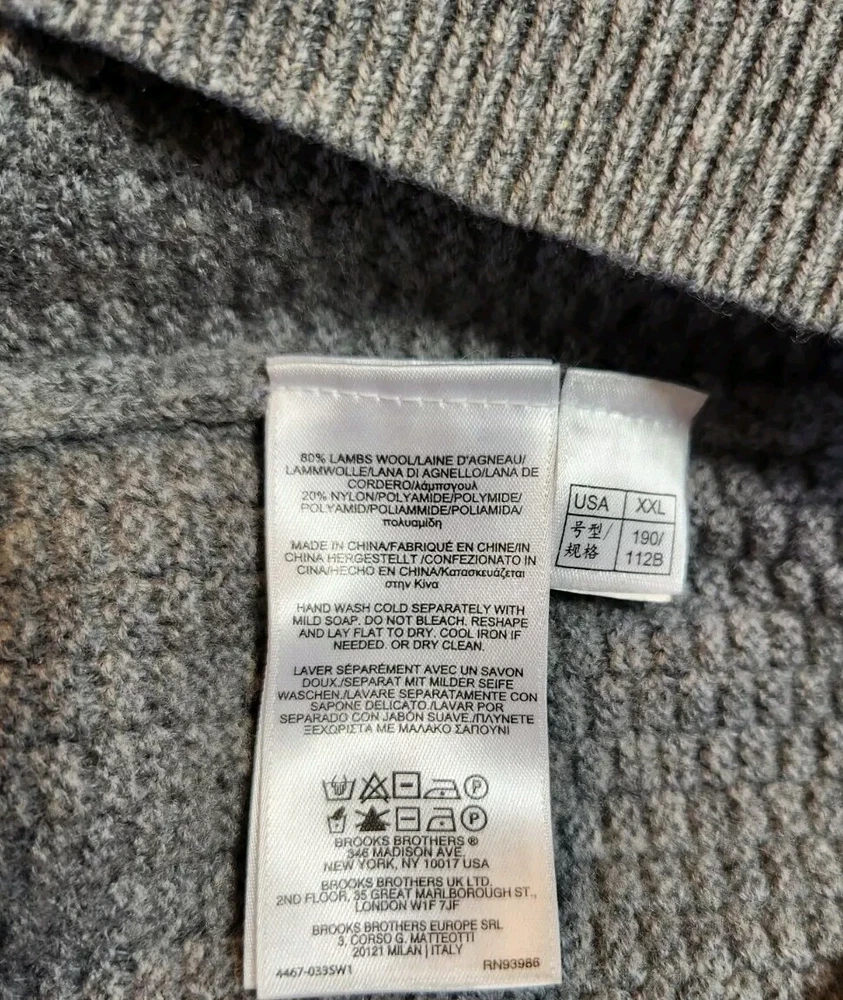 Brooks Brothers Gray Lambswool Nylon Blend 4 button Pullover Sweater Men's size 2XL XXL. Brown leather woven buttons. Textured thick sweater. Measurements: Chest: 25" pit to pit; Shoulder to shoulder; 20.5"; Sleeve: 29.75"; Length: 30" from center back of neck to back hem; *Note: mannequin is a size small Material: 80% Lambswool; 20% Nylon Hand wash