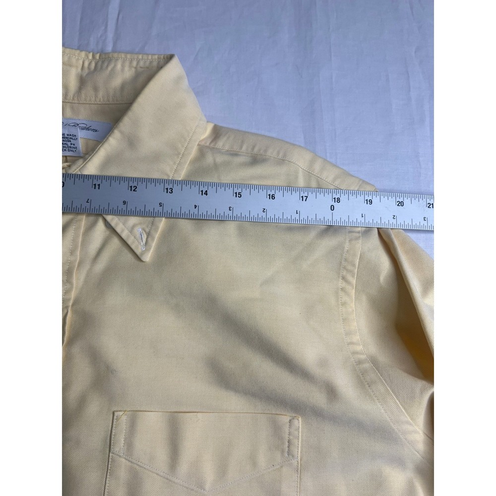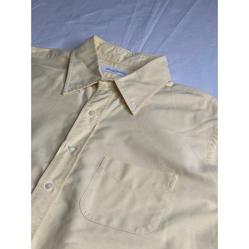 Classic sophistication defines this Brooks Brothers dress shirt, ready to elevate your wardrobe. A timeless piece, this shirt offers a clean, polished look with a single chest pocket. Perfect for business meetings, sophisticated dinners, or simply adding a touch of class to your everyday attire. Measurements: • Neck: 17 inches • Sleeve Length: 34 inches • Length: 32 inches • Pit to pit: 24 inches Department: Men Neck Size: 17 in Fit: Regular Sleeve Length: Long Sleeve Pattern: Solid Type: Dress Shirt Material: 100% Cotton, Cotton Collar Style: Button-Down Top Cuff Style: Barrel Cuff Features: Easy Care Neckline: Collared Keywords: Brooks Brothers, dress shirt, men's shirt, yellow shirt, long sleeve shirt, cotton shirt, button down shirt, business casual, office wear, menswear, classic, vintage, 17-34