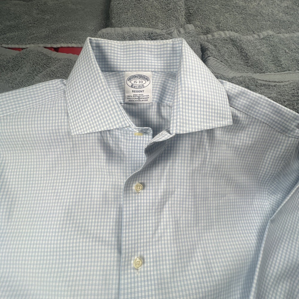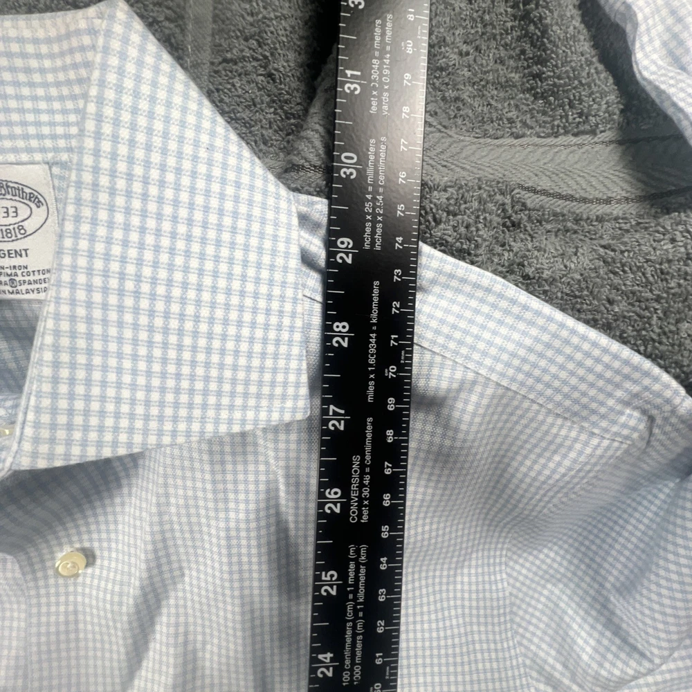 The Brooks Brothers Men's Regent Dress Shirt in size 15 with a non-iron, wrinkle-free feature is a premium quality garment made from 100% cotton Supima. This stylish shirt is perfect for any occasion, featuring a check pattern in a classic blue color. With a collared neckline, long sleeves, and a spread collar style, this regular fit shirt is easy to care for and suitable for all seasons. Perfect for the modern man looking for a sophisticated and convenient dress shirt option.