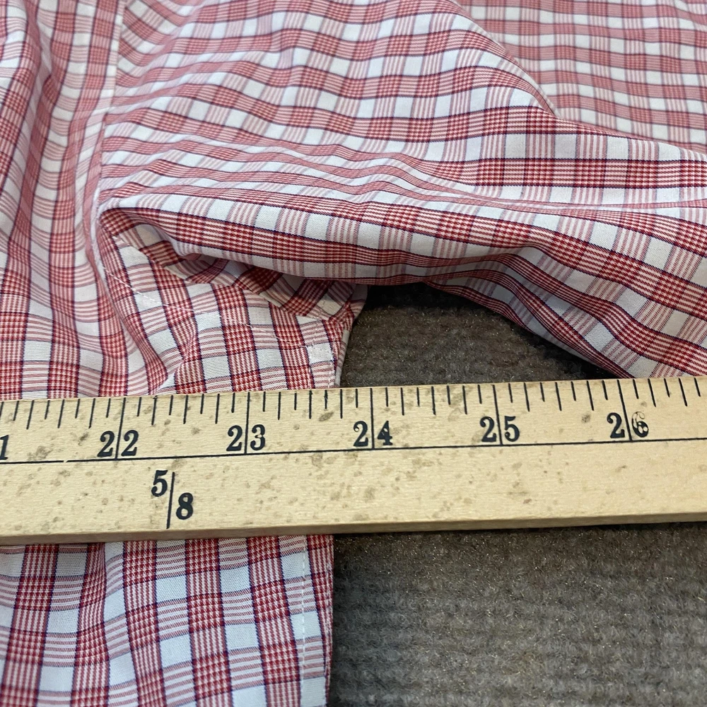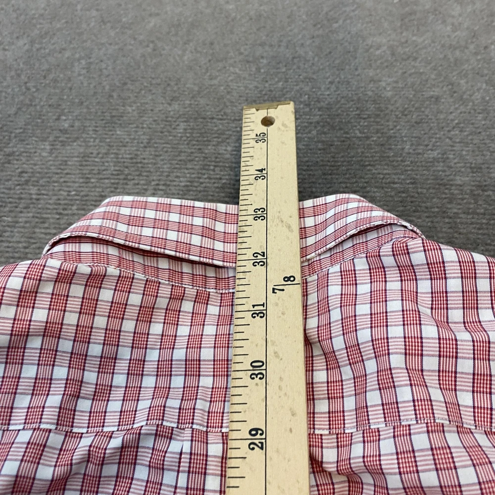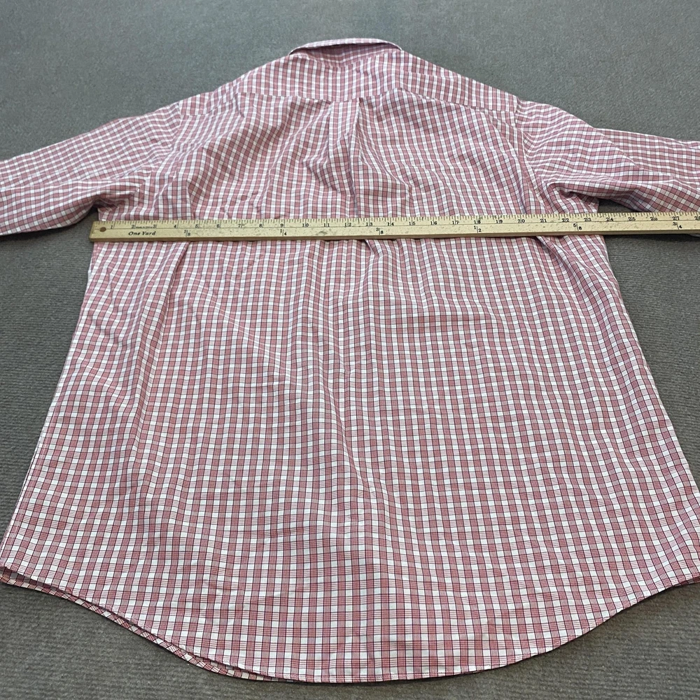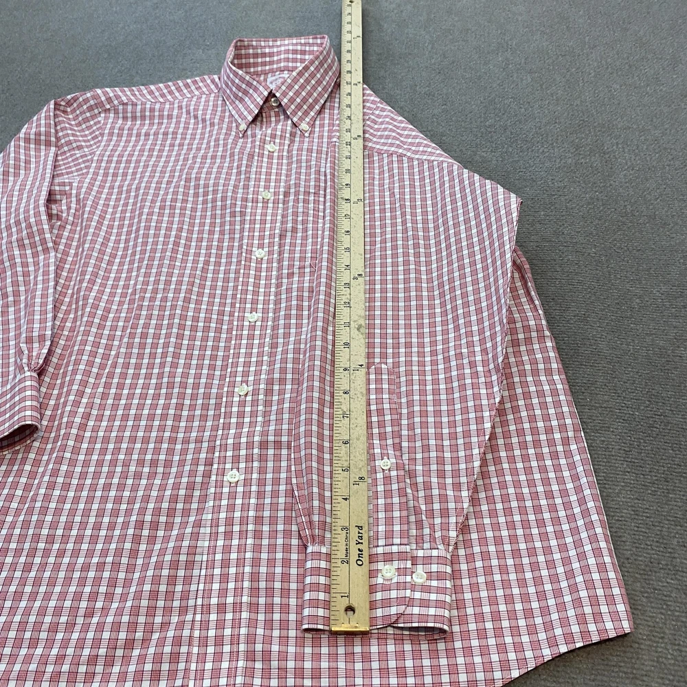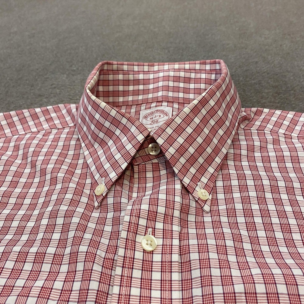 Brand: Brooks Brothers (346 line) Gently worn, no visible flaws. Buttons intact and functioning; collar and cuffs clean with no fraying observed. No stains, holes, or tears noted on inspection. Tag reads: 16-2/3 Line/Label: 346 The Original Polo Shirt Fabric: All Cotton Finish: Non-Iron Made in Malaysia (per tag) Color/Pattern: Red and white check plaid Style: Long-sleeve dress shirt with button-down collar and full button front Details: Two-button adjustable barrel cuffs; back box pleat; curved shirttail hem Notes: Classic Brooks Brothers styling suitable for office, business, or smart casual wear