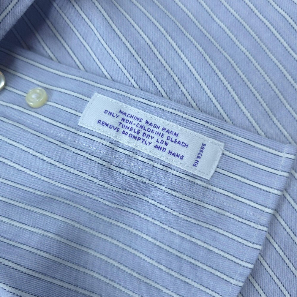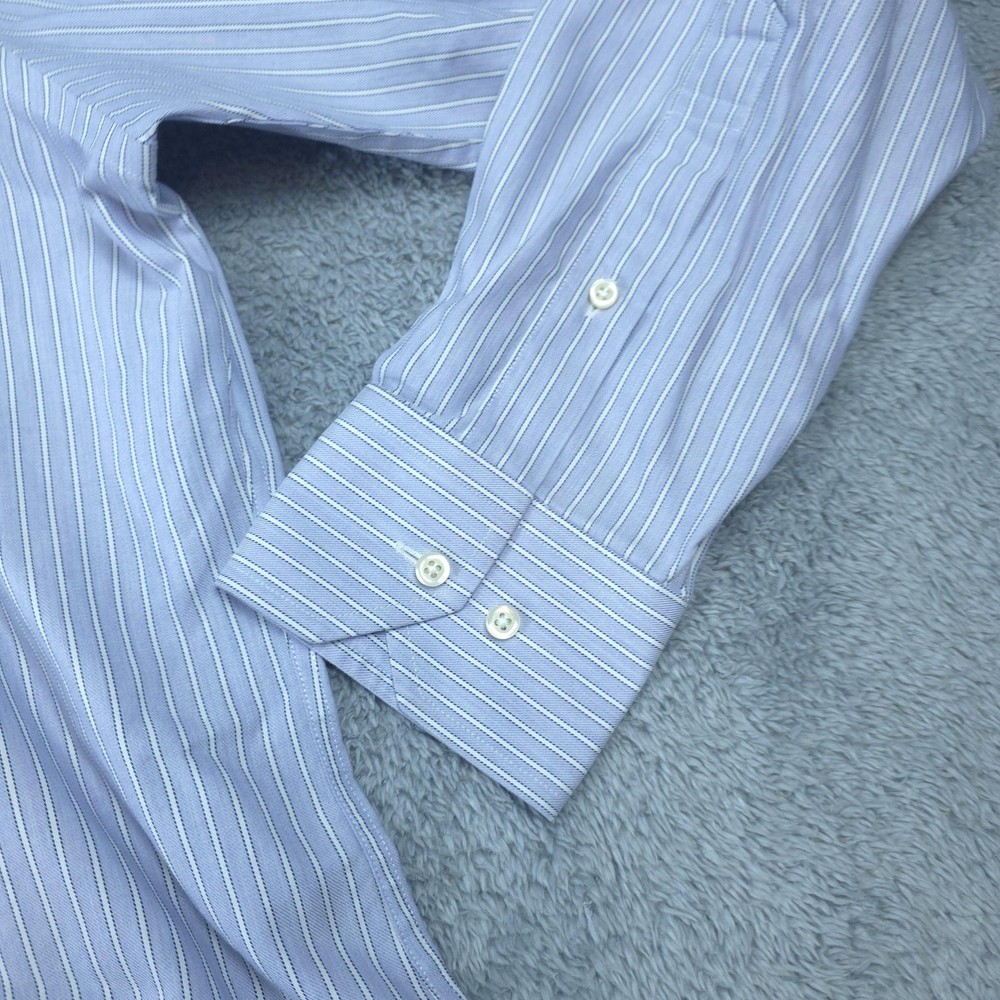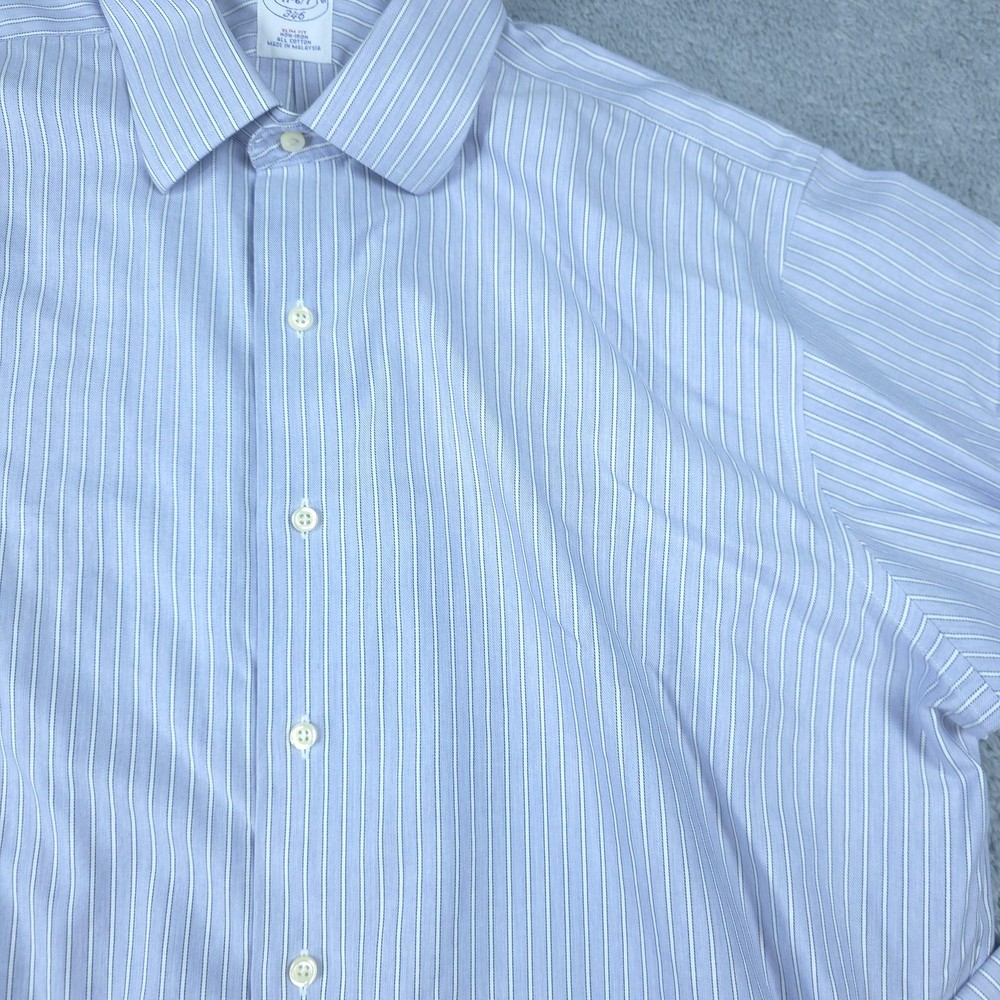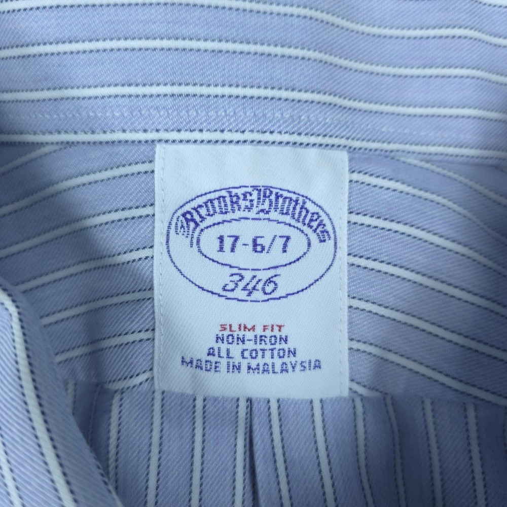 Brand: Brooks Brothers Style: Men's long sleeve striped non-iron dress shirt from the Brooks Brothers 346 collection in a slim fit. Color: Light blue with white and navy vertical pinstripes. Tag size: 17 neck, 36/37 sleeve (men's slim fit sizing). Material: 100% all cotton per inner neck label. Features: Point collar, full button front placket, long sleeves, two-button adjustable barrel cuffs, back yoke with center box pleat, and a curved shirttail hem designed to stay tucked during wear. Branding: Woven Brooks Brothers 346 neck label with size and fit callouts plus interior care label with laundering instructions. Country of origin: Made in Malaysia. Use: Classic non-iron dress shirt ideal for business, office wear, formal events, and polished everyday outfits. Item is in gently worn pre-owned condition. Item may contain normal signs of wear, blemishes, discoloration, creases and/or other signs of distress. Photos depict the exact item you will receive including measurements . Please refer to photos for full details prior to purchasing. If need be please measure against a similar clothing item you own. Items are cleaned in accordance with eBay's policies and standards and stored in a smoke free weather controlled environment. Fast USPS Shipping - 30 Day Free Returns - Hats Ship in a Box