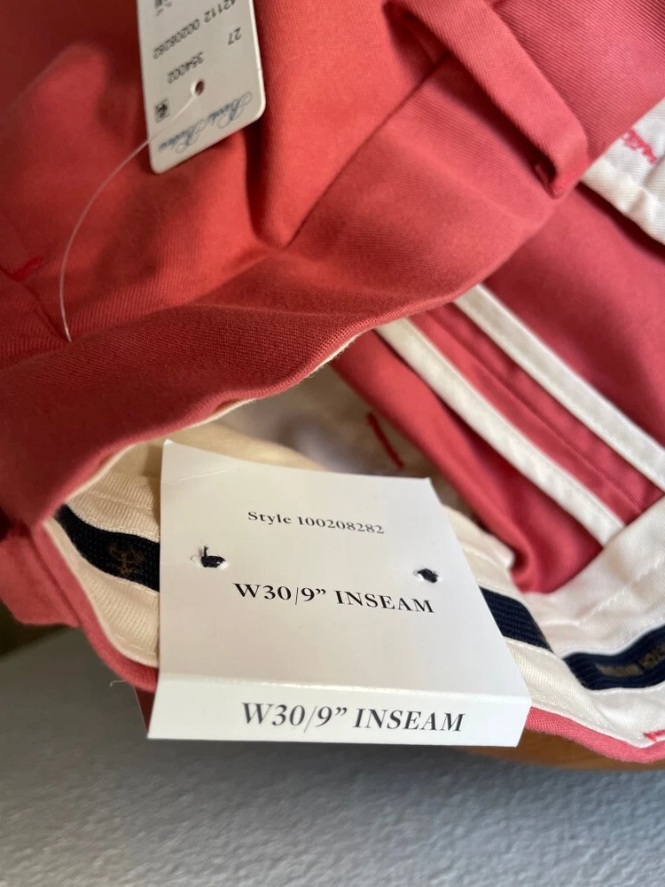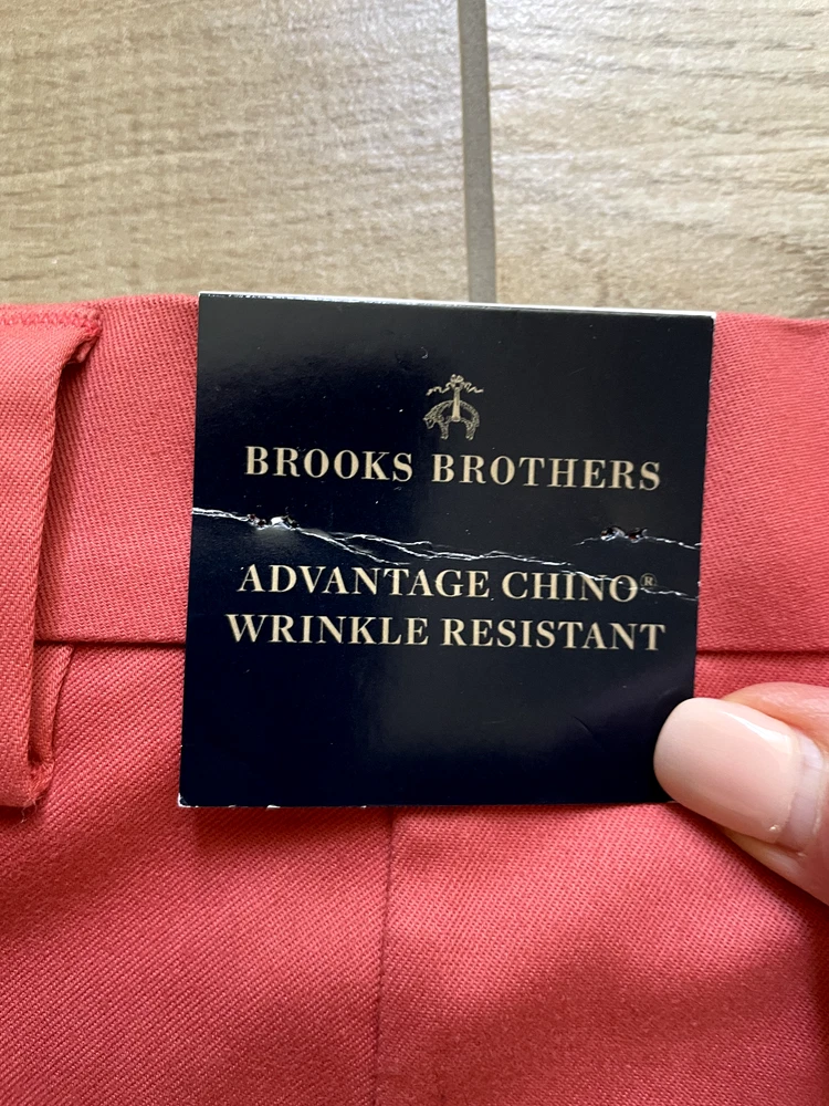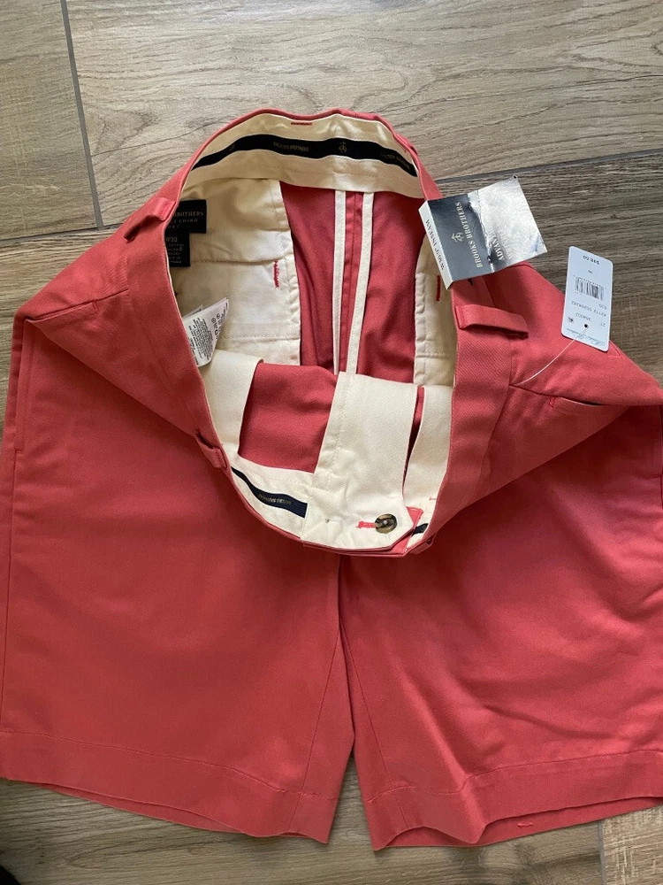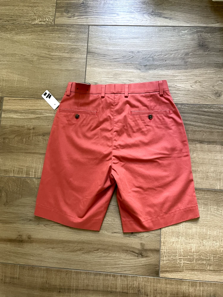 Brooks Brothers Advantage Chino Short Style: 9" Flat front classic Short Color: Dusty red pink Fabric: 97% Cotton, 3% Lycra Features: Zip & button fly, slit pockets, buttoned back pockets, flat front Approximate flat measurements: Waist 15 1/2", Rise 10 1/2", Inseam 9" Condition: New with tags, originally $98 Size: Tag size 30