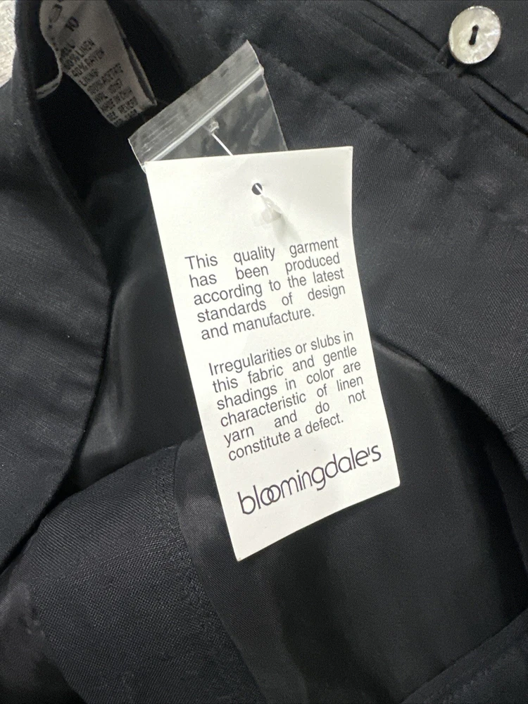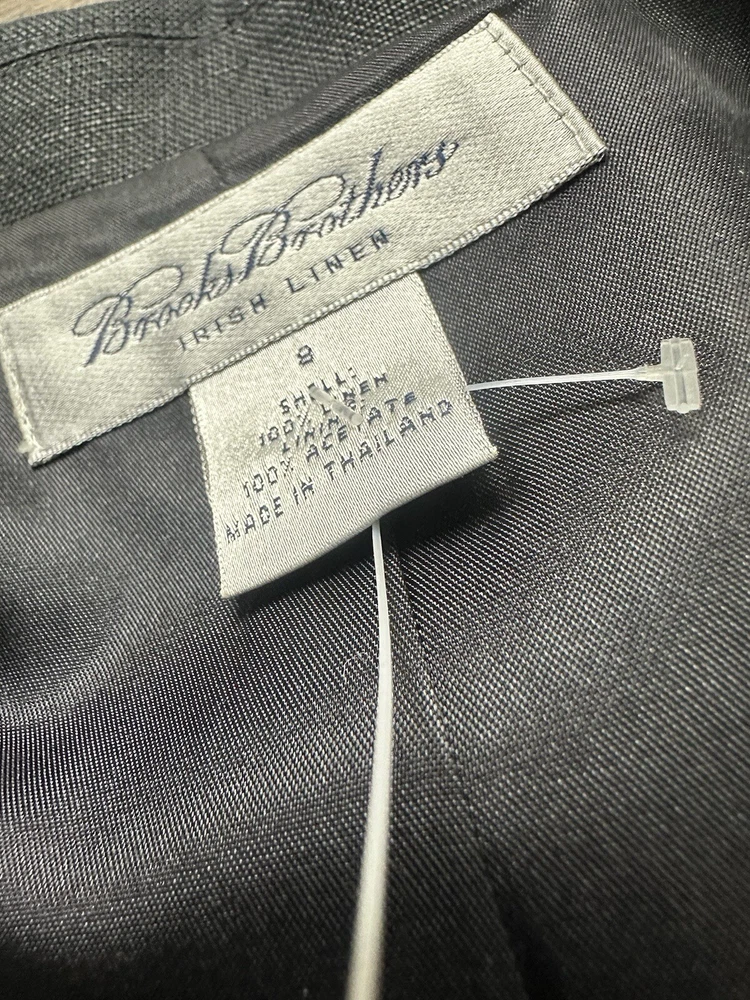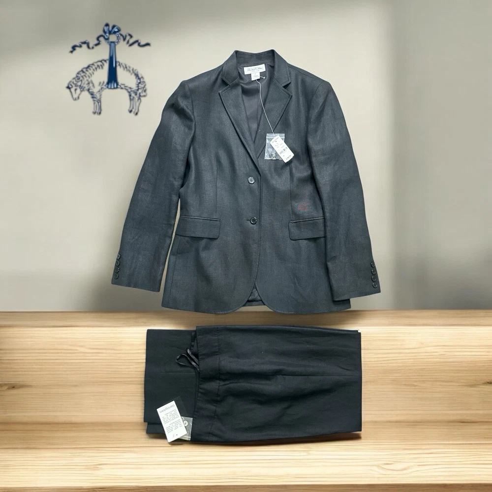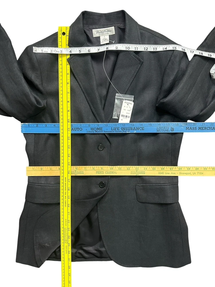 Please see pictures for an accurate description. Same-day business shipping. Pet loving smoke free. Should be home. Thank you so much for your interest. If you have any questions, please feel free to ask. Elevate your professional wardrobe with the Brooks Brothers Irish Linen 2 Piece Pant Suit in a classic black color. This suit is perfect for business occasions, interviews, or professional gatherings. The jacket features a single-breasted cut with a two-button front button style, notch lapel style, and three-button sleeve length. The pants are new by Bloomingdale’s linen blend and have a relaxed fit with a 33-inch inseam and 31-inch waist size, making them comfortable to wear for extended periods. The suit is made of high-quality linen material with stretch features, making it breathable and comfortable to wear during summer and spring. The lining material is acetate, and the set includes both the jacket and pants. This vintage suit has a solid pattern and is suitable for women in the regular size type. Made in Thailand, this Brooks Brothers suit is a must-have for any professional wardrobe.