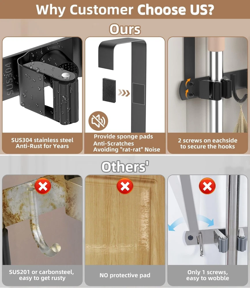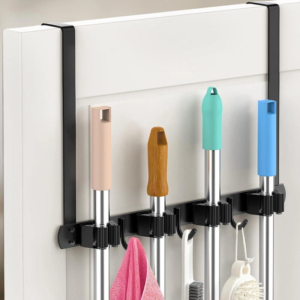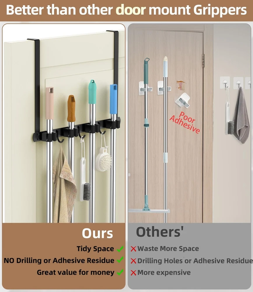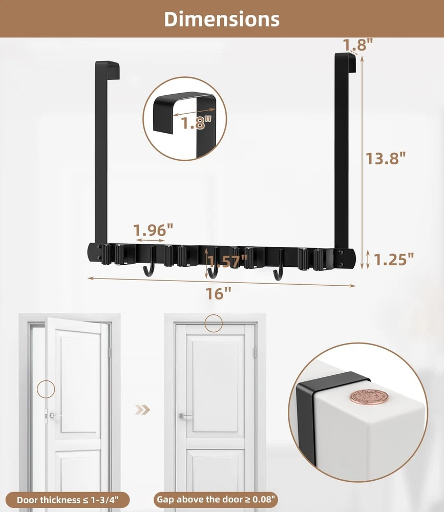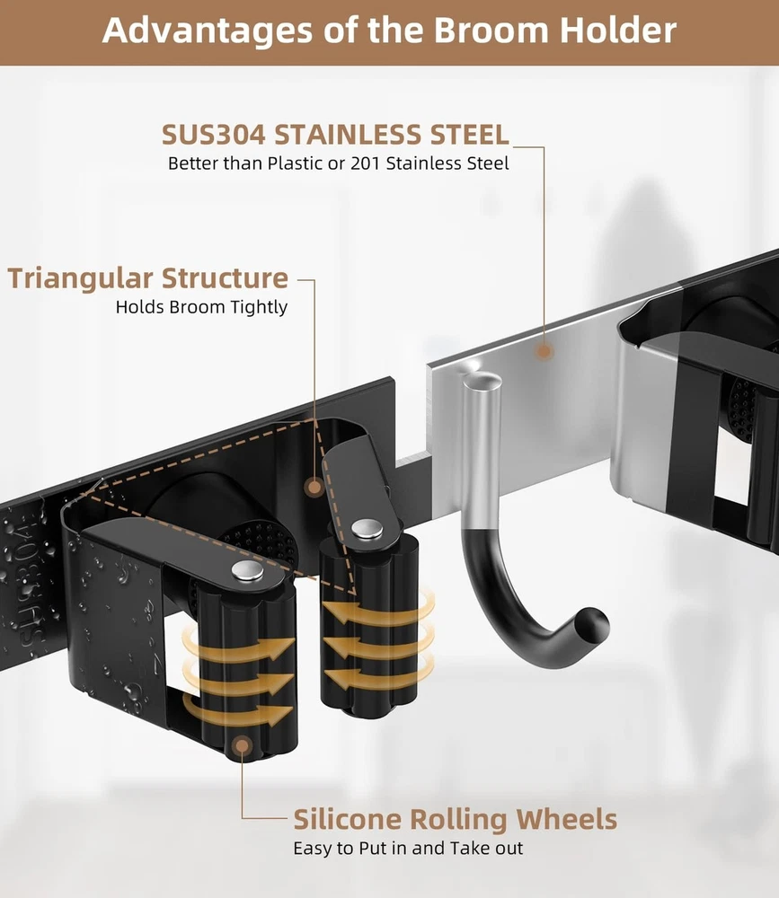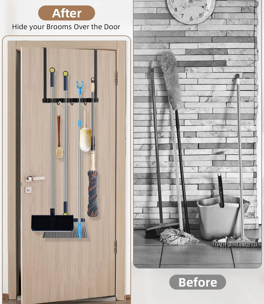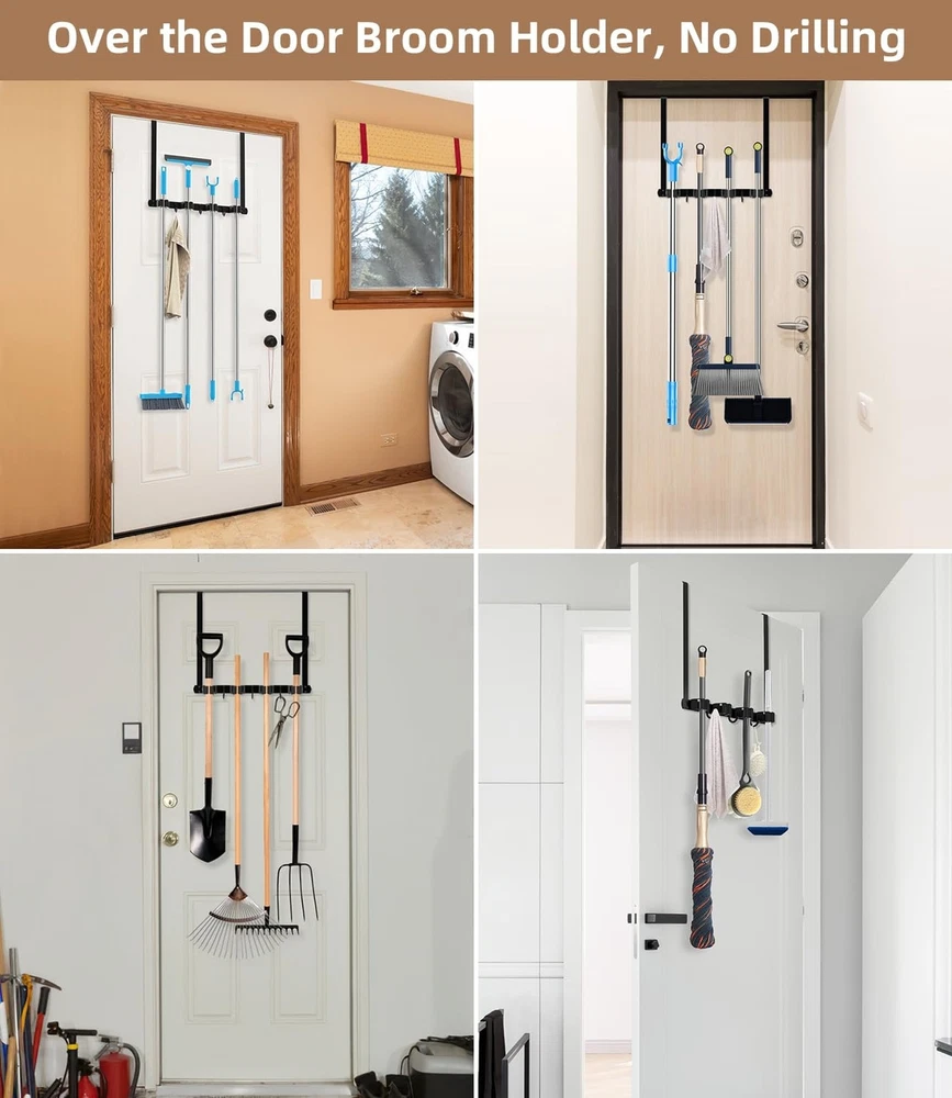 Broom Holder Over The Door - 304 Stainless Steel Mop and Broom Holder Wall Mounted or Hanging Over The Door with Hooks - Broom Hanger, Broom Storage Tool Organizer for Garage Closet Laundry Product Details Color: Black Item Package Quantity: 1 Brand: PrimZooty MPN: DrBroom304BLK-1PCS UPC: Does not apply EAN: Does not apply Material: Stainless Steel Color: Black Special Feature: Door Mount and Wall Mount, Anti-Rust 304 Stainless Steel Product Dimensions: 1.8"D x 16"W x 13.8"H Shelf Type: 4 Slots, 3 Hooks Material: Stainless Steel Color: Black Special Feature: Door Mount and Wall Mount, Anti-Rust 304 Stainless Steel Product Dimensions: 1.8"D x 16"W x 13.8"H Shelf Type: 4 Slots, 3 Hooks Number of Shelves: 4 Room Type: Laundry Room, Bathroom, Outdoor Finish Type: Powder Coated Assembly Required: Yes Mounting Type: Door Mount or Wall Mount Recommended Uses For Product: Broom Holder, Cleaning Tools Hanging Storage, Door Hangers, Closet Storage, Mop Hooks, Laundry Storage Included Components: Installation Guide, Broom Holder over the Door, Hardware and Anti-Scratch Pads for haning over the door, Screws and Anchors for Wall Mount Item Weight: 1.35 Pounds Brand: PrimZooty Style: Industrial Shelf Weight Capacity: 50 Pounds Manufacturer: PrimZooty Part Number: DrBroom304BLK-1PCS Item Weight: 1.35 pounds Country of Origin: China Item model number: 304BLK-1PCS Size: 1PCS Finish: Powder Coated Item Package Quantity: 1 Maximum Weight Capacity: 50 Kilograms Special Features: Door Mount and Wall Mount, Anti-Rust 304 Stainless Steel Batteries Included?: No Batteries Required?: No Date First Available: January 9, 2024 [Patent] HIDE YOUR TOOLS BEHIND THE DOOR: This specially designed Over-the-Door Broom Holder comes with two over-door hooks, eliminating the need for drilling. This drill-free design allows you to utilize the space behind the door, making it a versatile and damage-free solution. Maximize efficiency and eliminate floor clutter by organizing brooms, mops, and other cleaning tools. (This metal broom holder also comes with Anti-Scratch self-adhesive SPONGE PADS to reduce Rat-Rat noice and protect your door.) 304 STAINLESS STEEL , ANTI-RUST & STURDY: The mop and broom holder wall mount is made of 304 stainless steel, making it corrosion-resistant, moisture-proof, and waterproof. Compared with plastic broom racks, it is stronger and more premium quality. This garage organization can hold up to 30 pounds when installed with screws, and the hook can also support your steam mop. EASY TOPUT IN AND TAKE OFF TOOLS: Simplify your cleaning routine with our user-friendly design. Easily insert and remove brooms with a single hand, thanks to rubber rollers that securely hold handles without causing damage. Unlike plastic holders with spring-loaded rollers, our mop broom holder allows handles to slide in from the front, ensuring a tight grip. Its large enough to hang your brooms, mops, racks, rags, brushes, gloves, and many other tools with handles diametaer within 1.3''. TWO INSTALLATION OPTIONS AVAILABLE: Aside from hanging over the door, this broom holder can be installed on the wall. Perfect for various wall surfaces and behind door space. Suitable for the kitchen, bathroom, garage, laundry, broom closet, washing storage. Enjoy a tidy and organized living environment with the convenience of easy access to your cleaning tools whenever you need them. Note: You need to drill 4 holes if you choose to mount this broom holder on the wall. Adhesive or stickers are not included in the package. HASSLE-FREE PURCHASE: PrimZooty stands behind our product. Each product undergoes at least five quality inspections before leaving the factory to ensure the best quality.