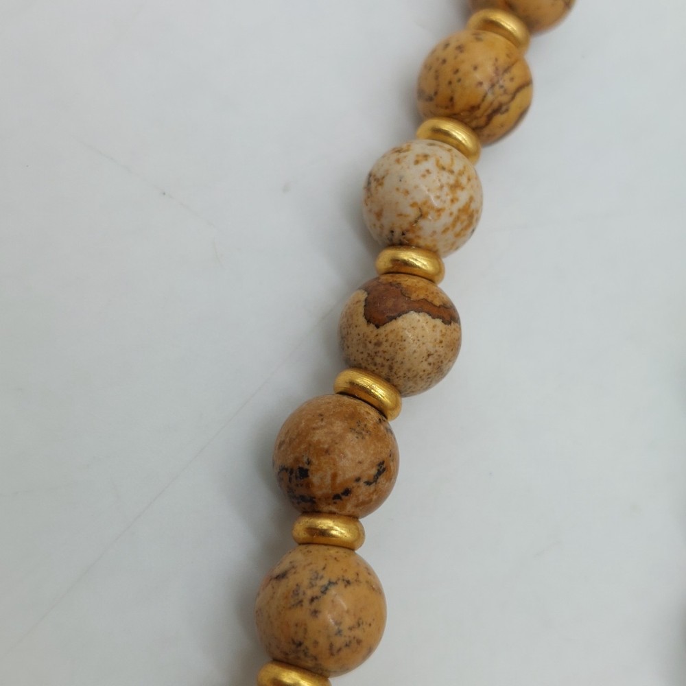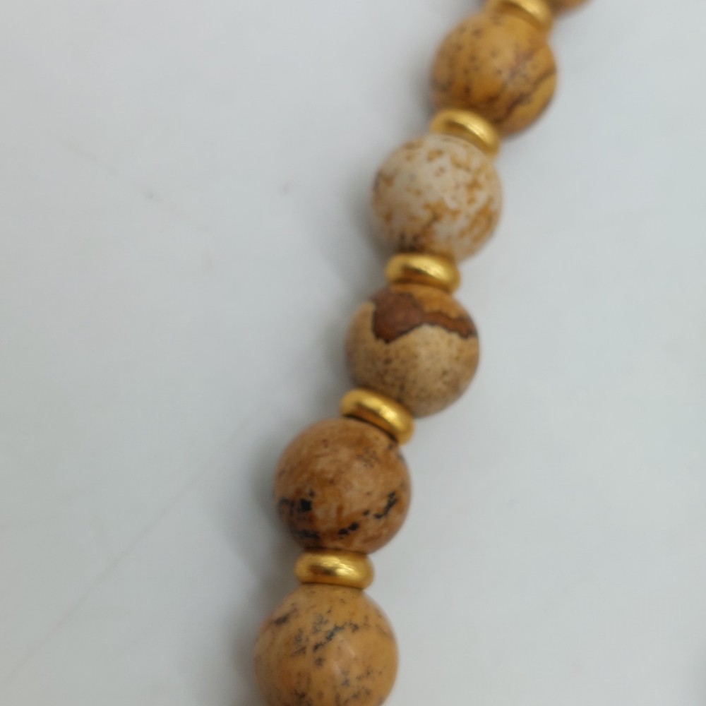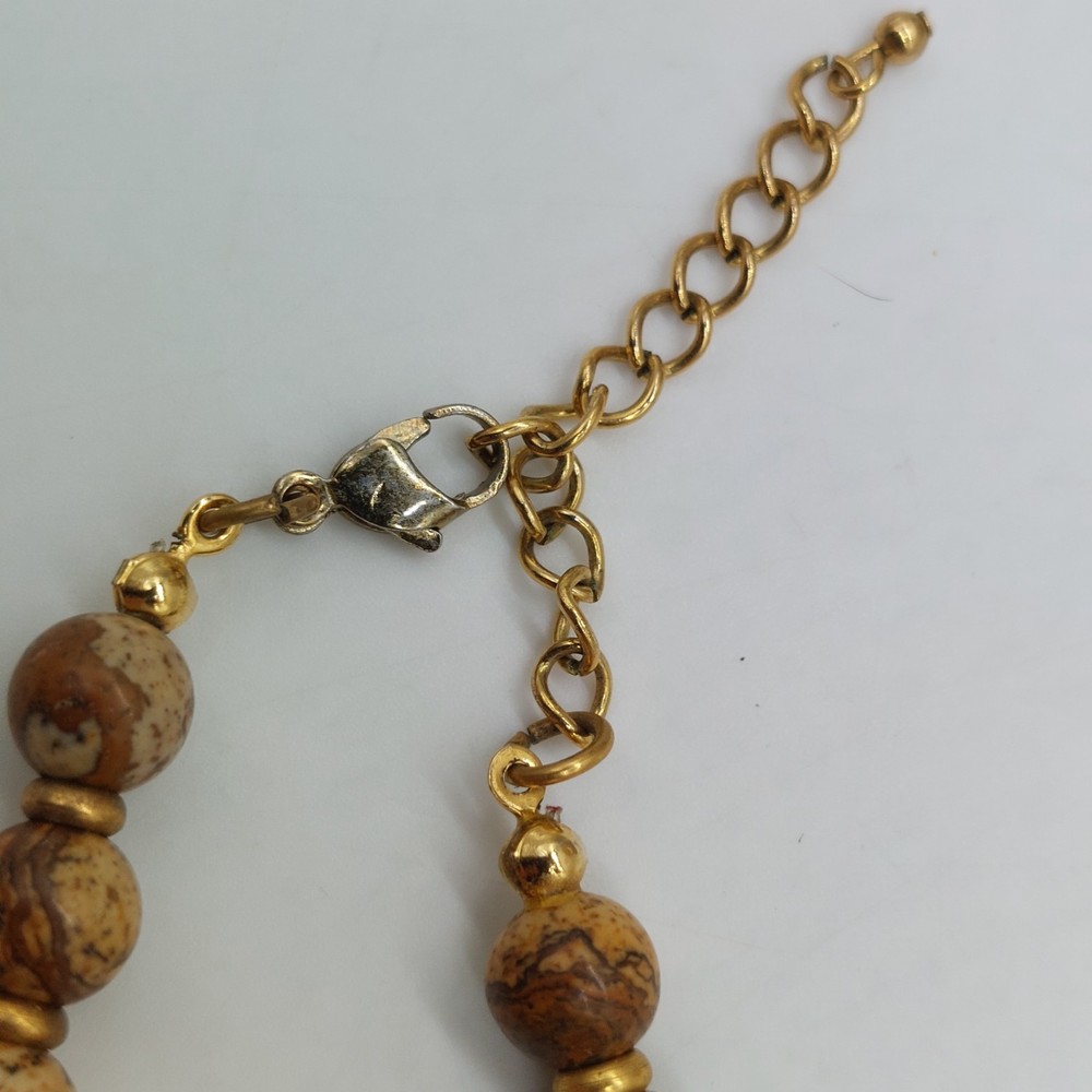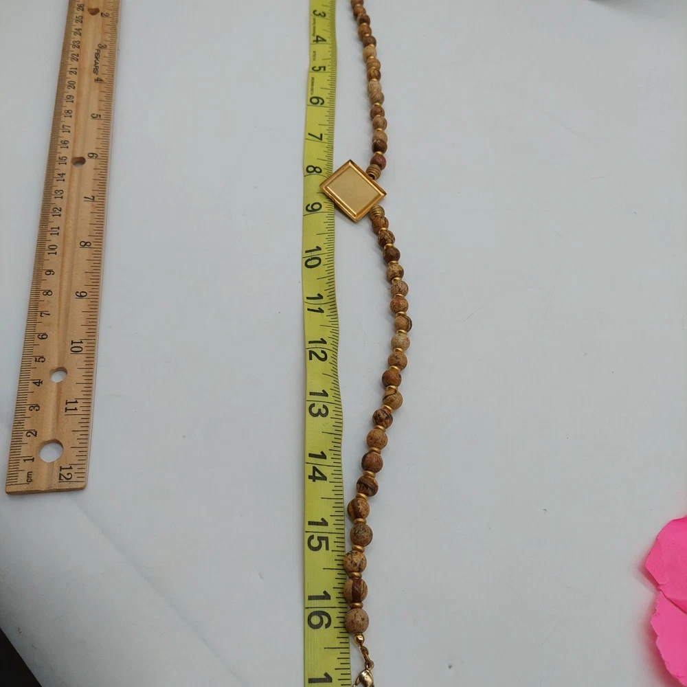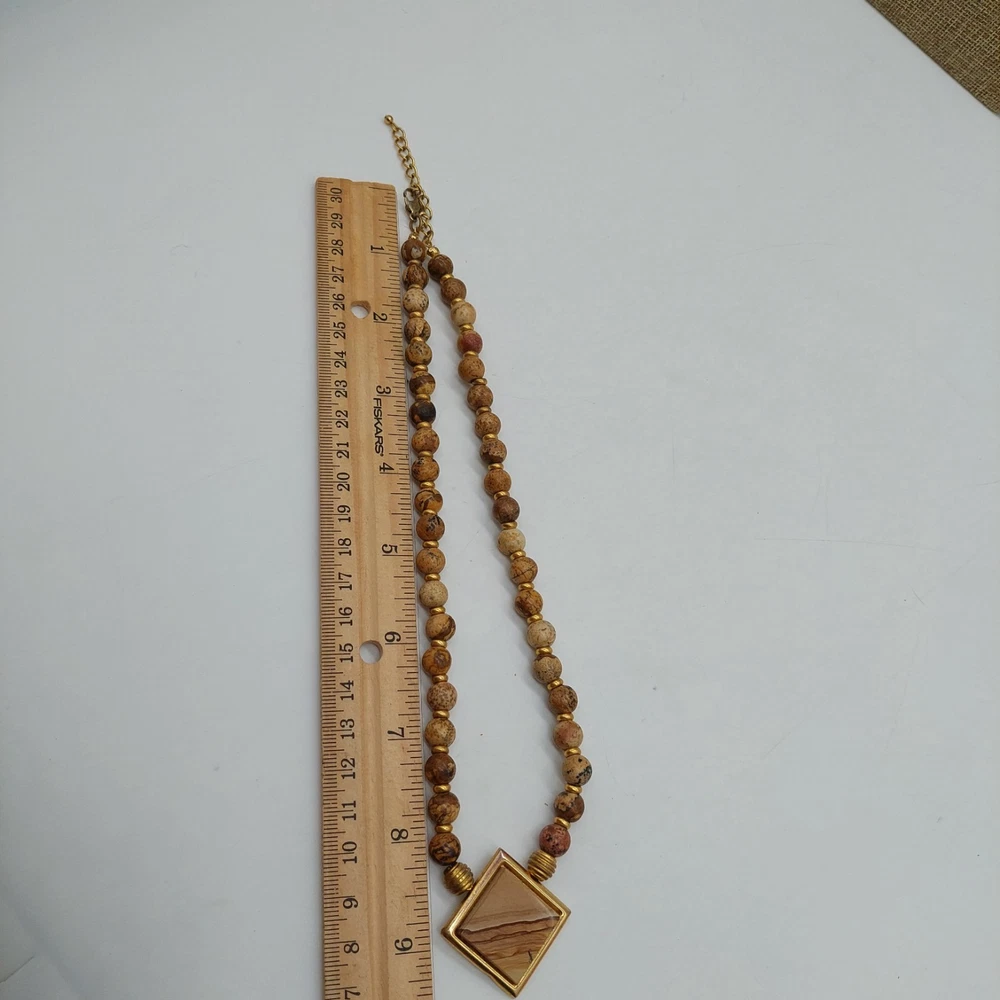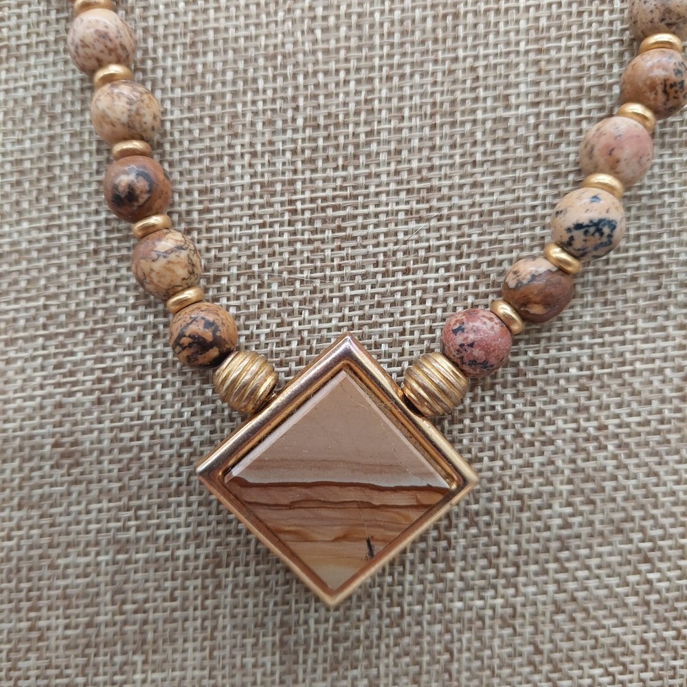Brown And Gold Tone Beaded Necklace Choker Diamond Shaped Pendant