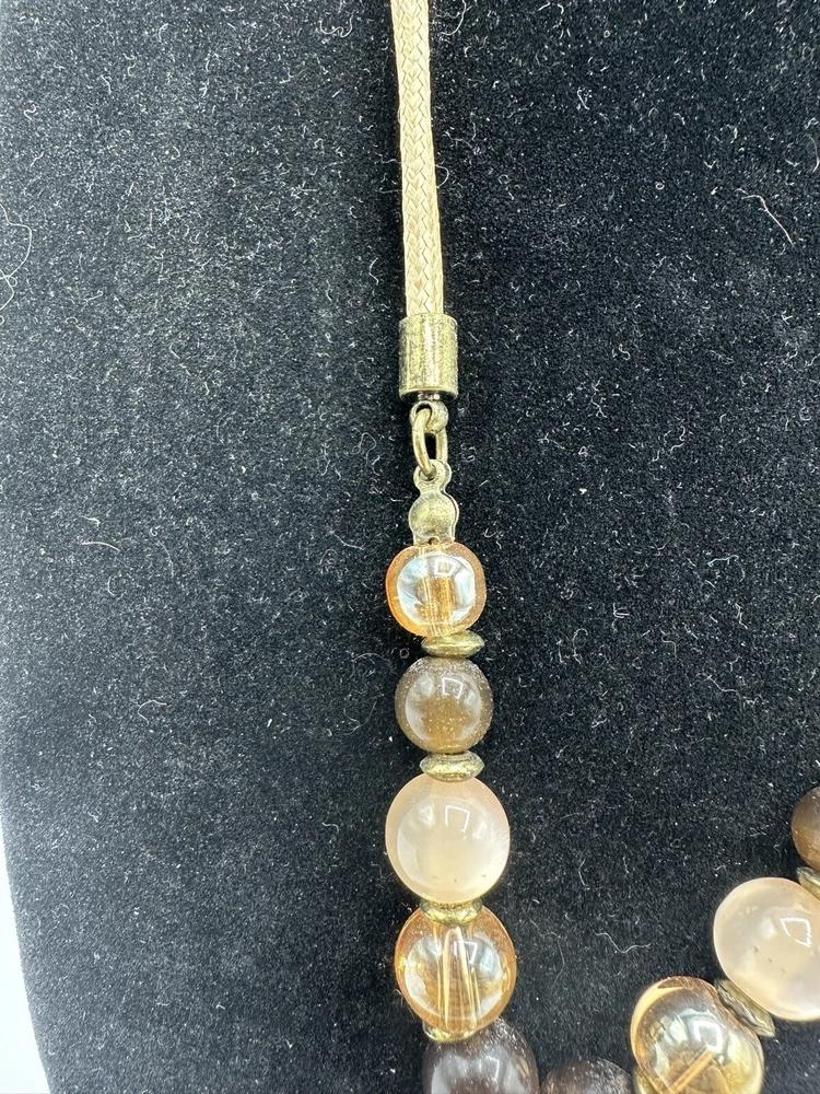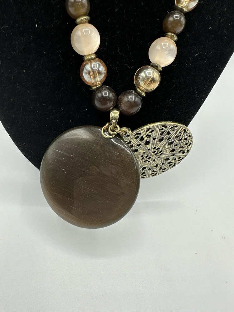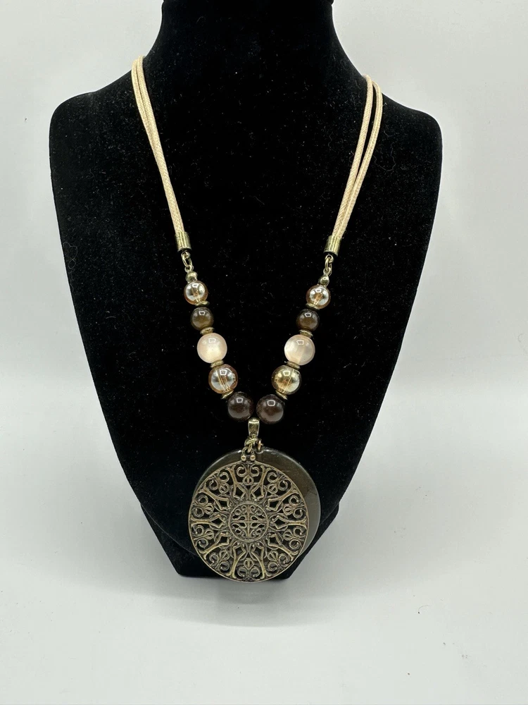 Add a touch of bohemian beauty to your fashion with this stunning necklace. The pendant is round in shape and features a unique brown color that will complement any outfit. The necklace is beaded and has a corded design that adds a touch of elegance to the piece. The material is made of glass, and the metal purity and type are unknown, adding an element of mystery to the necklace. This necklace is perfect for those who love to add a pop of color to their jewelry collection and make a statement.