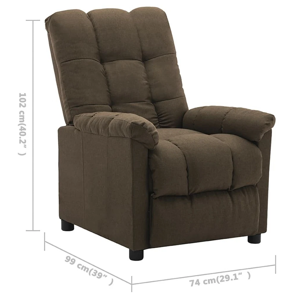 Settle in and relax in this comfortable fabric recliner. Adjustable backrest & footrest: The recliner chair is equipped with an electric motor for reclining function. You can easily adjust the backrest and footrest with the included hand control as per your comfort. Durable upholstery & thick padded: The fabric features a simple and clean look, and is breathable and durable. The thick-padded seat, backrest and armrests is highly comfortable. Convenient design: This recline chair is designed with a side pocket, which allows you to keep small items within reach. Easy to assembly: Each product comes with an assembly manual in the box for easy assembly. Color: Brown Material: Fabric (100% polyester), plywood, iron Filling material: Sponge, PP cotton Overall dimensions: 29.1" x 39" x 100.8" (W x D x H) Seat dimensions: 21.7" x 22.8" x 18.9" (W x D x H) With an electric motor for automatically adjusting backrest and footrest Input: 100 - 240 V~, 50 - 60 Hz Output: DC 28 V Adjustable headrest and footrest Assembly required: Yes California Proposition 65 WARNING: California's Proposition 65