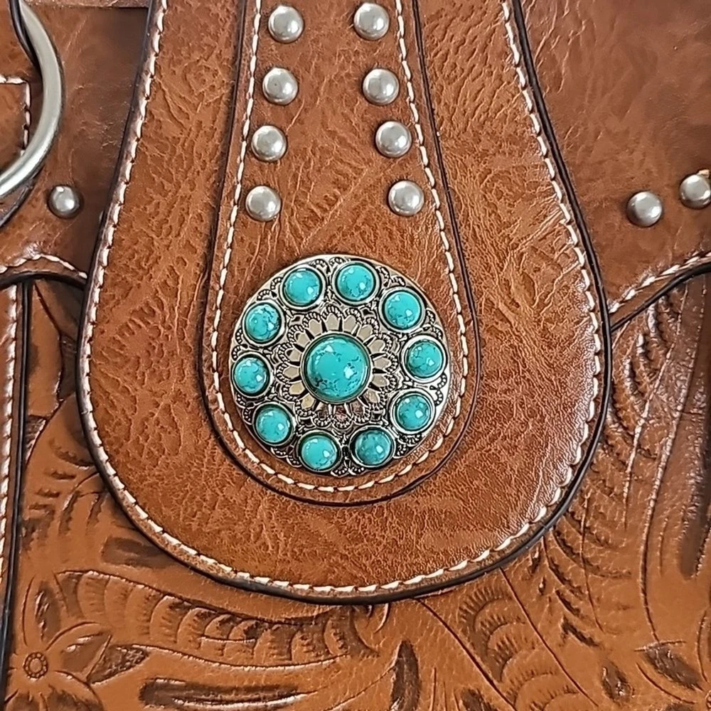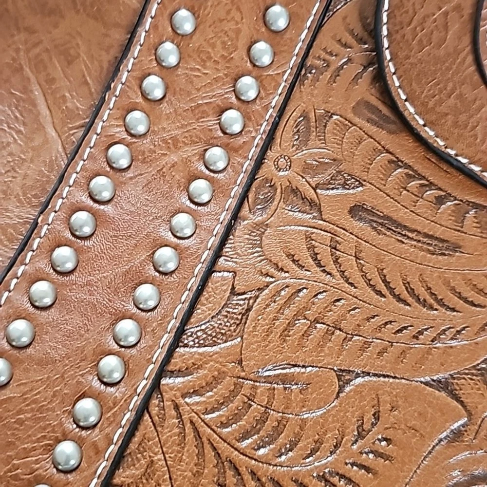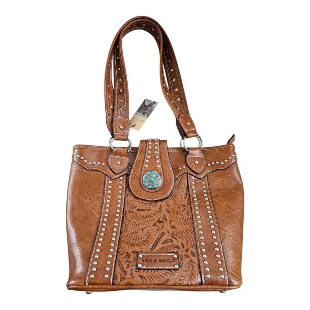 Rein & Bridle Brown Faux Leather & Gemstone Embossed Studded Southwestern Shoulder Bag BNWT MSRP: $99.00 2 interior slip pockets 2 interior zip pockets Top zip closure Front button snap closure Silver tone hardware Beige lined interior Approximate measurements: height: 10.5" drop: 11: width: 14: depth: 4: tags: boho bohemian southwest western cowgirl rodeo festival gift gifts for her spacious high quality trendy vegan stylish