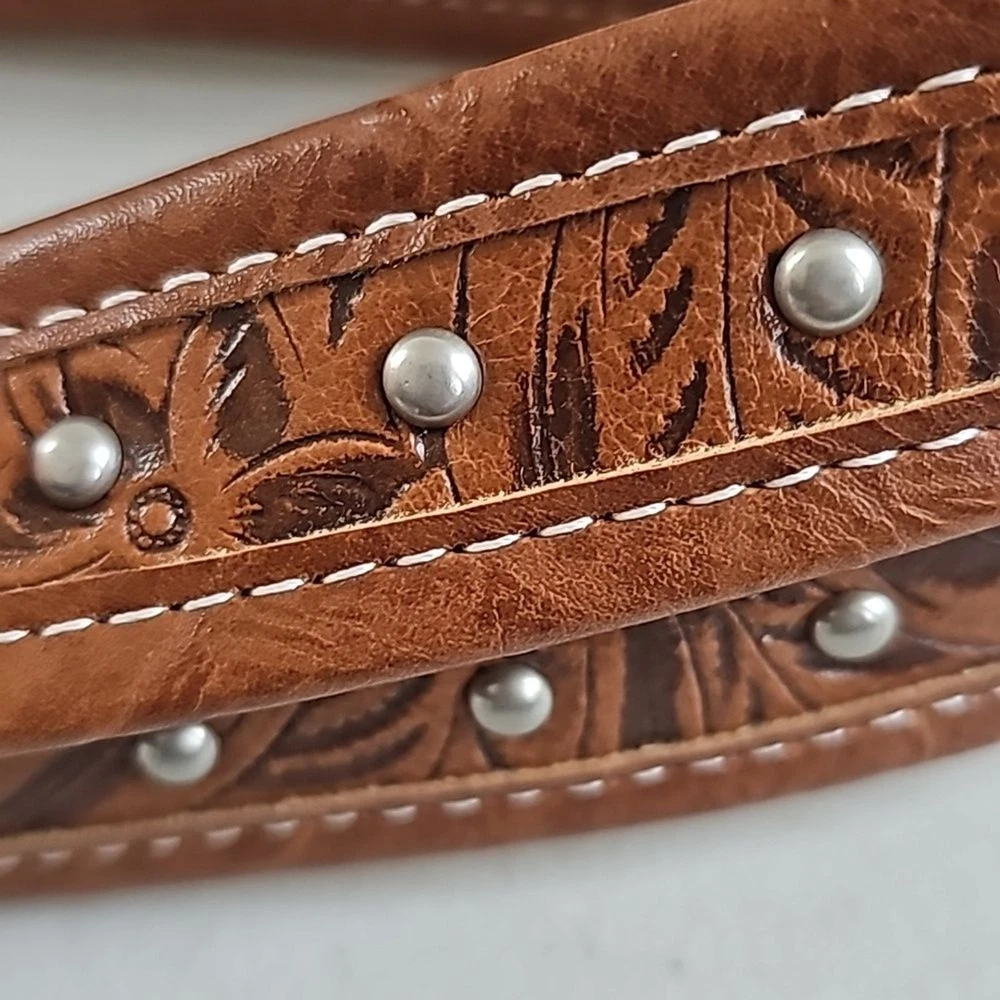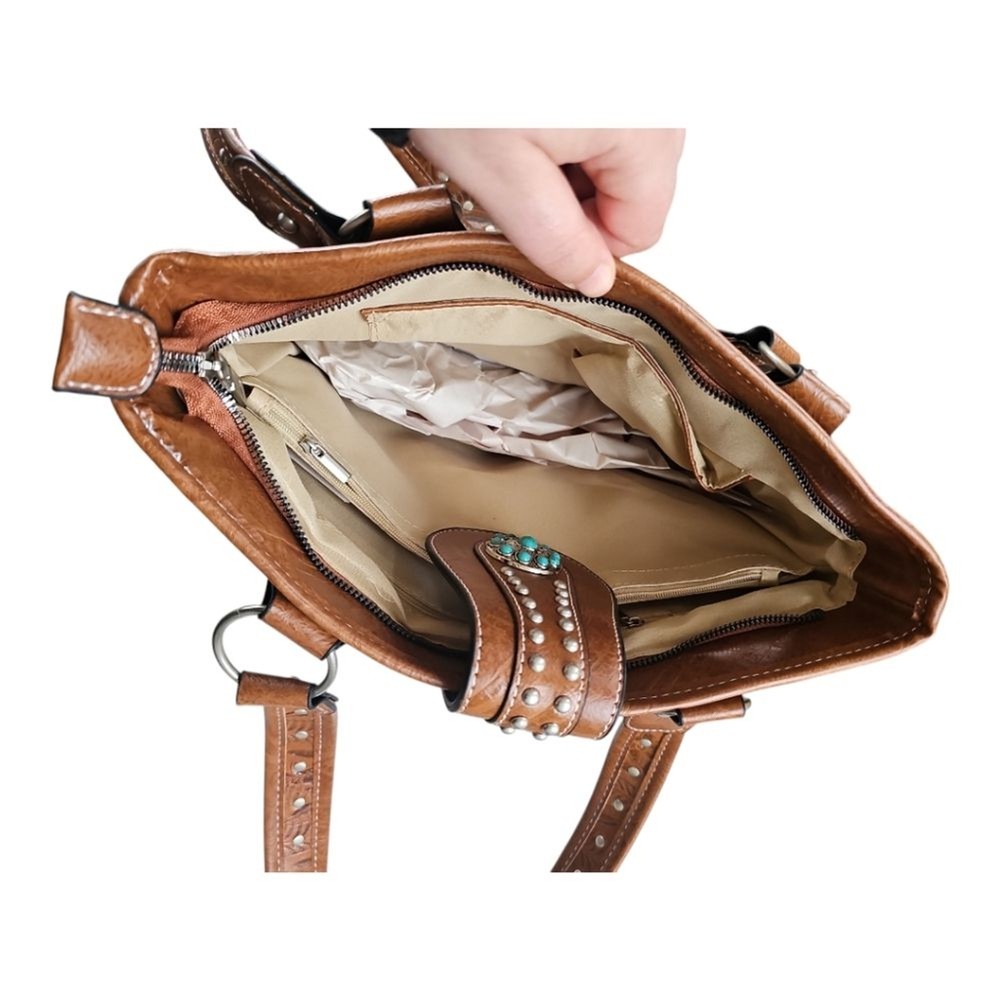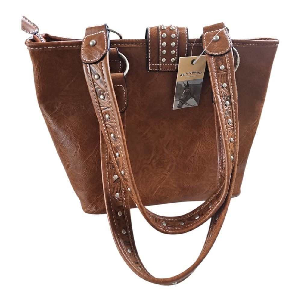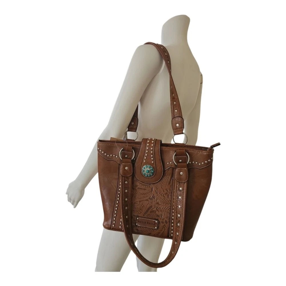 Rein & Bridle Brown Faux Leather & Gemstone Embossed Studded Southwestern Shoulder Bag BNWT MSRP: $99.00 2 interior slip pockets 2 interior zip pockets Top zip closure Front button snap closure Silver tone hardware Beige lined interior Approximate measurements: height: 10.5" drop: 11: width: 14: depth: 4: tags: boho bohemian southwest western cowgirl rodeo festival gift gifts for her spacious high quality trendy vegan stylish