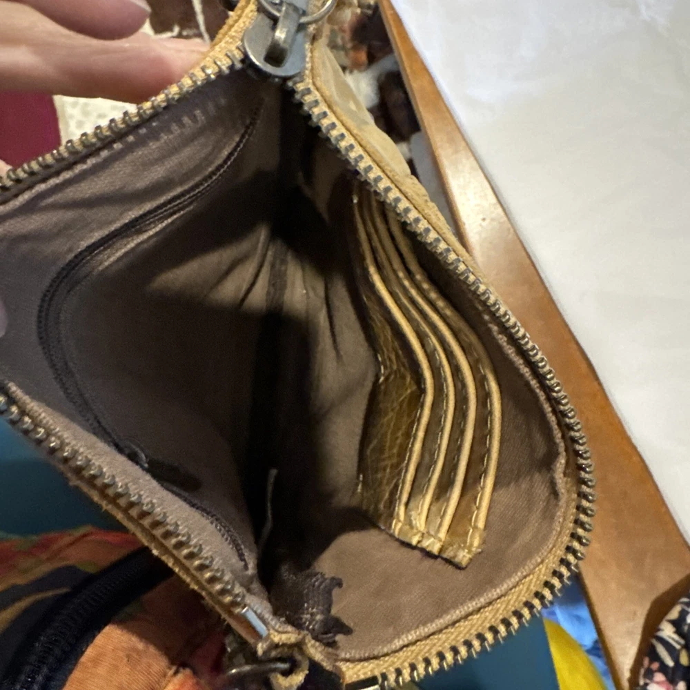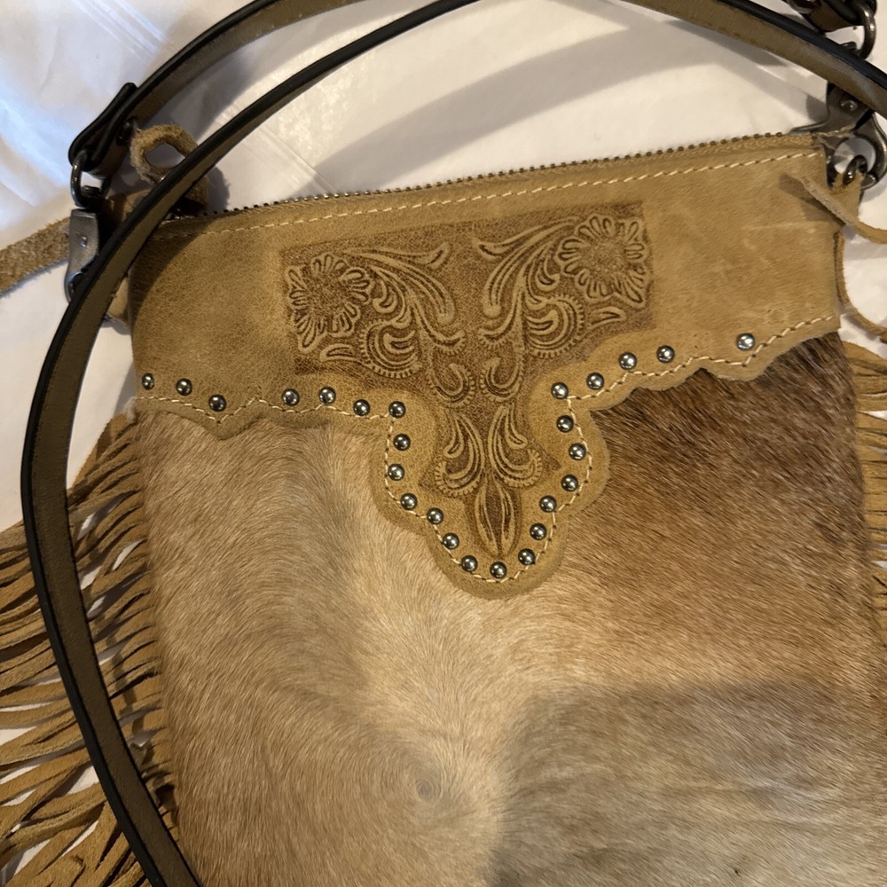 This is a stylish brown leather small purse designed for women. The purse features fringes and studs for a trendy look. It has a rectangular shape with a zip closure, making it convenient to access your belongings. The purse has brown handles/straps and a matching brown lining, complementing the exterior color. With a crossbody style, this purse is practical for on-the-go use and adds a touch of edgy sophistication to any outfit.