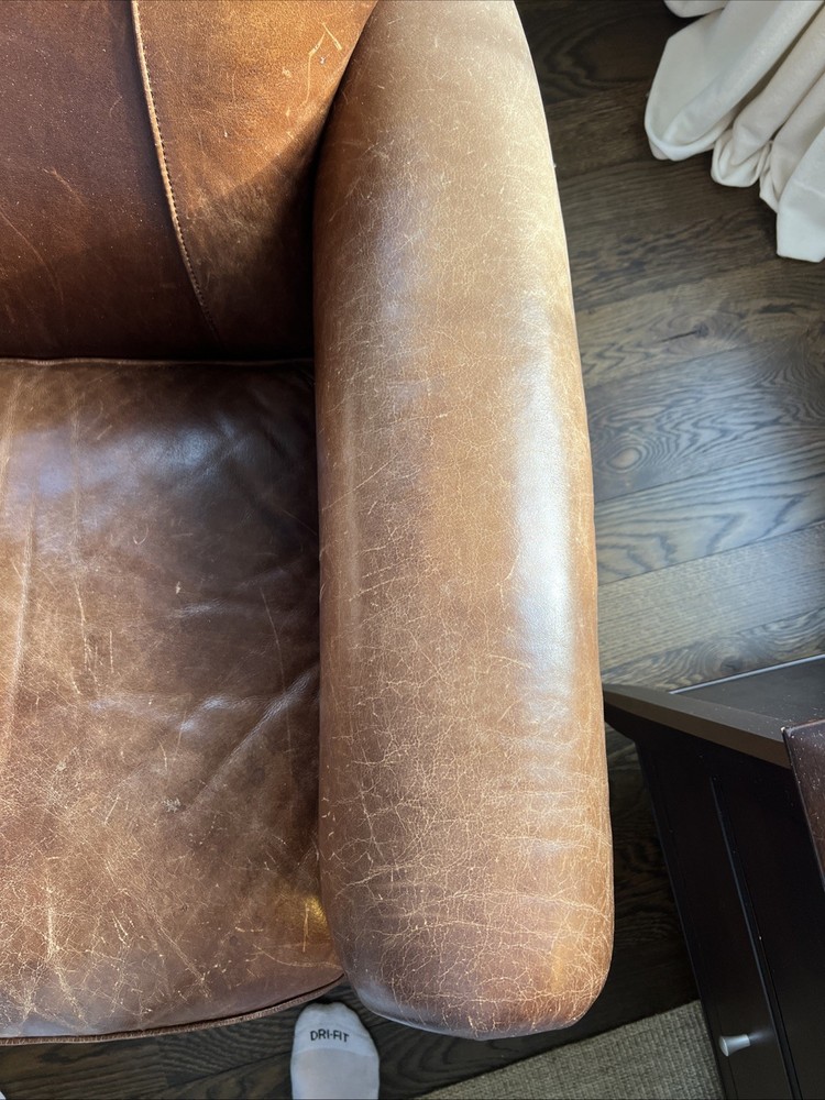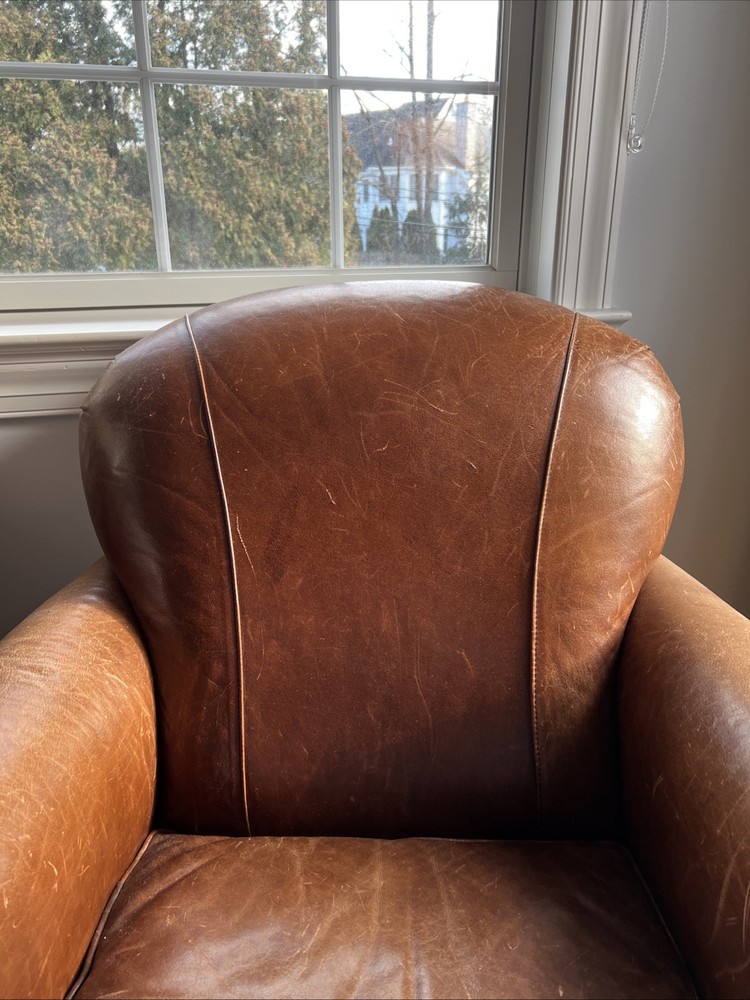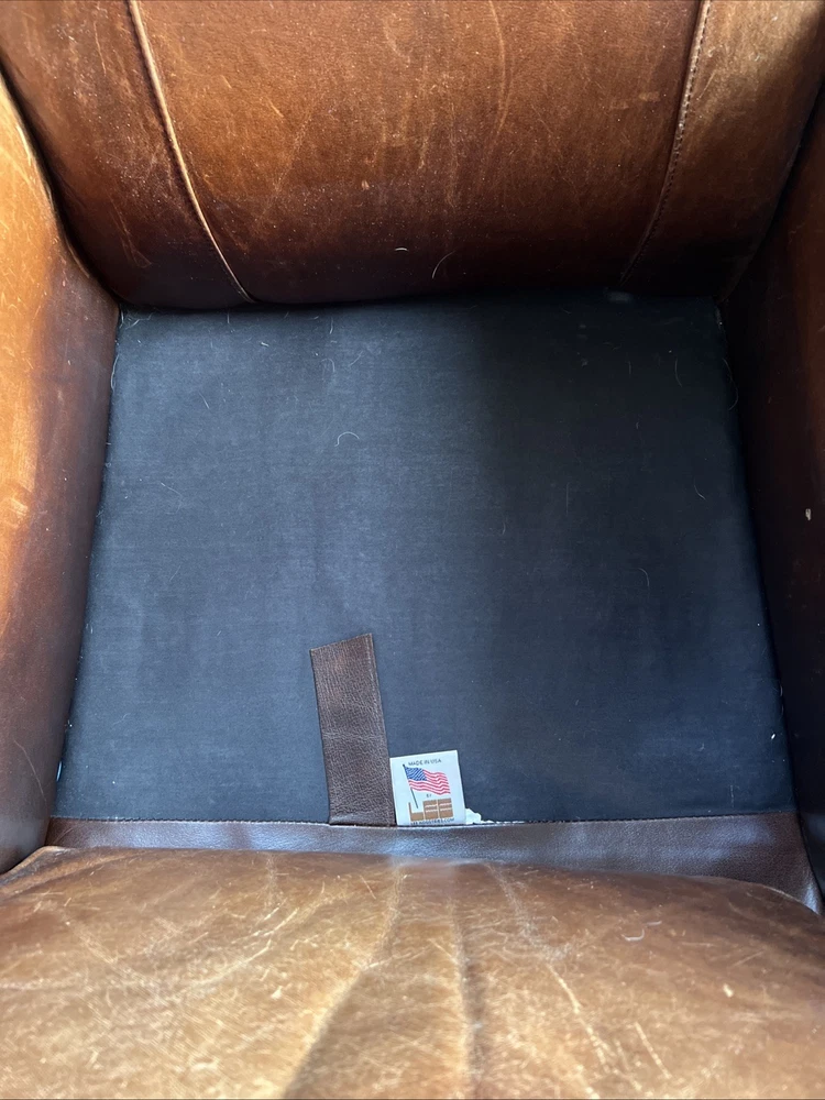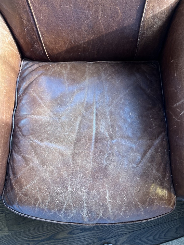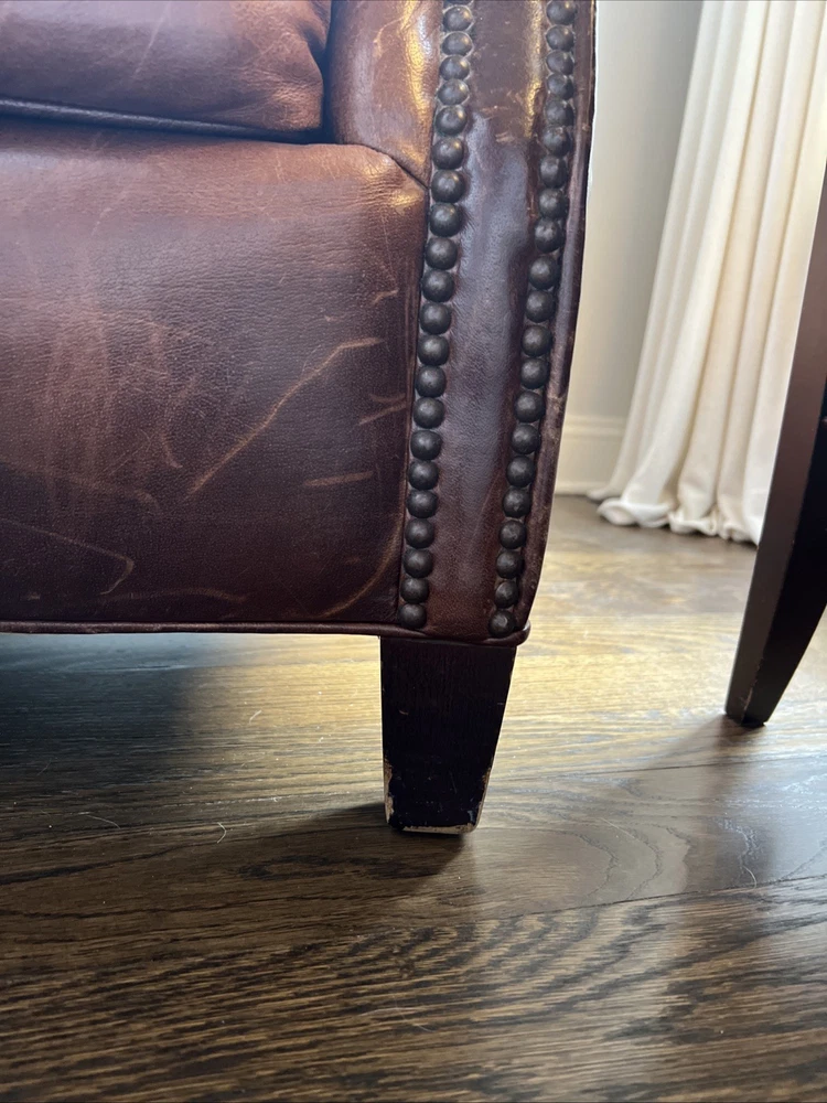 The Crate and Barrel Trevor Brown Leather Chair is a stylish and elegant accent chair perfect for adults. With its dark wood oak frame and brown leather upholstery, this chair adds a touch of sophistication to any room. The nailhead detail gives it a unique and luxurious look, making it a versatile piece that can be placed in the living room, bedroom, entryway, or home office/study. Fully assembled and requiring no additional assembly, this chair is a comfortable and timeless addition to any indoor space.