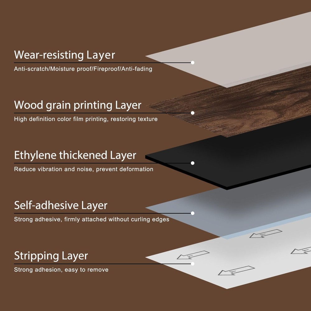Peel and Stick Floor Tiles 【Size】:Peel and stick floor tiles measure 36“ x 6” each and are 1.5mm thick, with the entire package covering 54 square feet 【Material】:Brown wood plank is made of high-strength vinyl that has been specially treated to be waterproof, durable, abrasion-resistant, tear-resistant, and won't crimp, even after prolonged use 【Easy to Install】:Vinyl floor tiles are easy to install and remove, no extra glue or tools needed, just cut as needed and peel off the back sticker. Better results when pressed 【Multi-Scenario Application】:Self-adhesive tiles are both aesthetically pleasing and protective, making them ideal for use in bedrooms, bathrooms, living rooms, kitchens, toilets and more 【Warm Tips】:Vinyl wood planks should have a flat and dry surface before pasting, otherwise it will affect the pasting effect. Please buy enough quantity at one time and make sure it comes from the same batch to avoid color difference