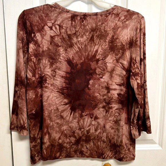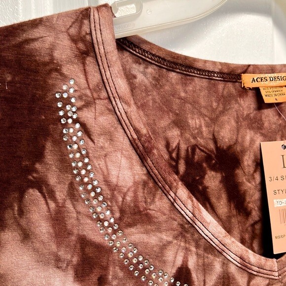 Look stylish and comfortable in this Aces Design brown tie-dye blouse. It features a V-neckline, 3/4 sleeve, and casual sleeve type, making it perfect for travel, casual wear, and work. The blouse is made of polyester and spandex and has a jersey fabric type. The top has lovely accents of beaded detailing and is unlined, lightweight, and stretchy. It is easy to maintain as it requires hand wash only and fits perfectly well with its regular fit. The blouse is a size L and has a designer, hippie, and city theme. This blouse is perfect for any woman who wants to look trendy and comfortable at the same time. 95% polyester 5% spandex super soft stretch fabric hand wash 17’ across shoulders 17.50’ long sleeves 20.50’ across chest 42’ around bottom 24’ long from collar seam to bottom front nice for casual wear