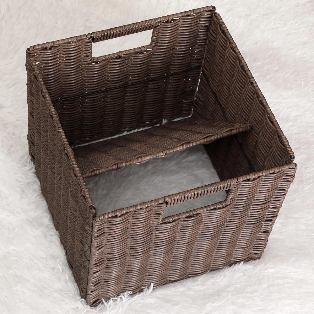 BUILT-IN HANDLES:Our 10.5 in cube wicker baskets with cut out handles which makes these baskets easy to carry from room to room, and its collapsible design makes them easy to store when not in use Material:Handwoven with plastic material, durable and strong bearing capacity.We recommend storing baskets when not in use, they fold for easy storage Size:10.5"L x 10.5"W x 10.5"H, suitable for kallax cabinets with an inner diameter of 10.75 inches or more. (Please know the size of the basket before purchasing to avoid that do not match your shelves and cause you the trouble of returns.) Multipurpose Use:These wicker storage bins are brilliant for storage under tables, or as drawers for square shelves & Kallax. They can store many household items, such as food & snacks in your kitchen, or pillows and clothes in the bedroom. Please Note:please allow a 1/4" measurement tolerance; Suitable for indoor or outdoor use .