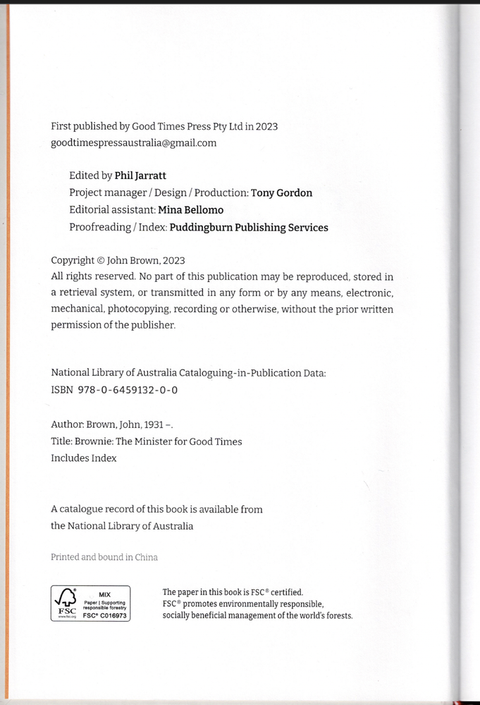 Brownie - The Minister for Good Times ; SIGNED by John Brown - NEAR NEW HC Book Brownie - The Minister for Good Times ; SIGNED by John Brown - NEAR NEW HC Book This copy is NEAR NEW. No dust-jacket, as issued. The printed boards and binding are in excellent order. The author has signed the first, free endpaper. The pages DO NOT have any other names, inscriptions or marking of text. Click here to visit PATRICK ANDREAS QUALITY BOOKS Store Home Page . Listing and template services provided by inkFrog