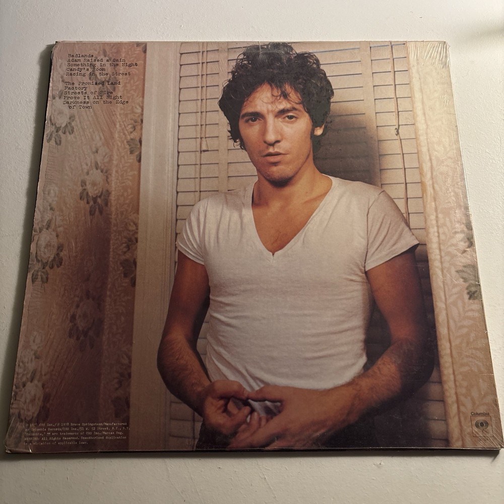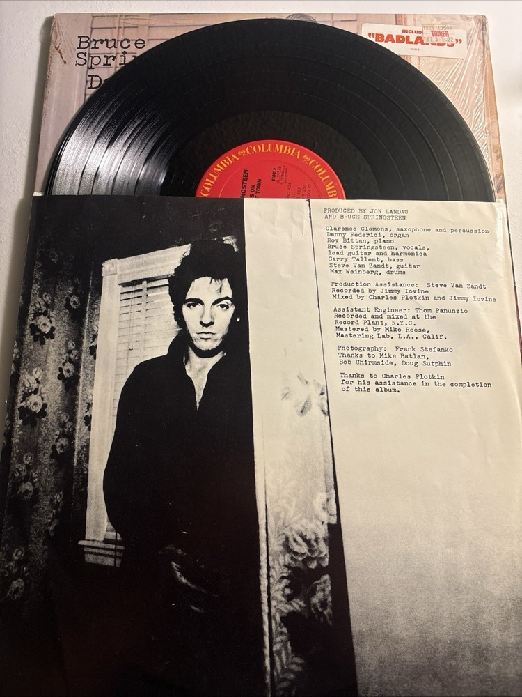 The product is a 1978 vinyl LP by Bruce Springsteen titled "Darkness on the Edge of Town." Released by Columbia, the record features classic rock music in stereo format. The 12" vinyl comes in a cardboard sleeve with original inner sleeve and insert, and is in very good condition. This vintage release from the United States is a must-have for any fan of Bruce Springsteen's music.
