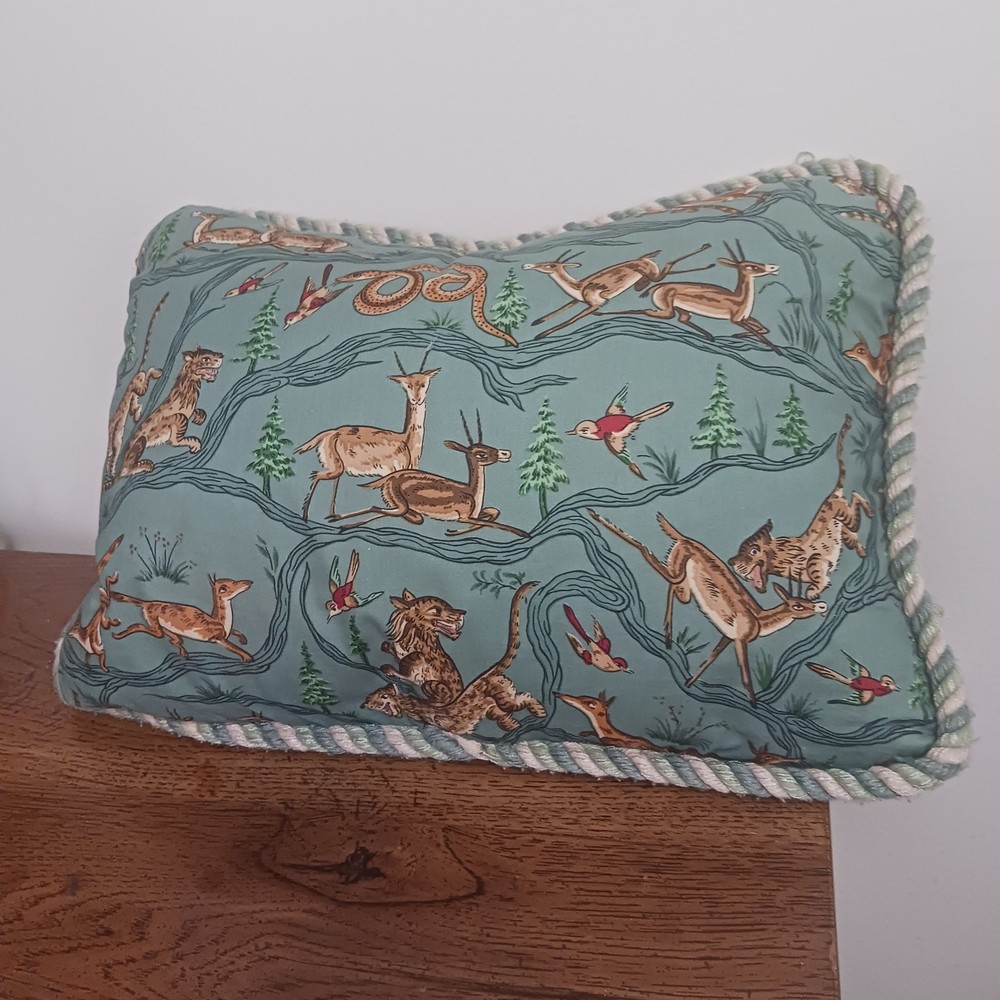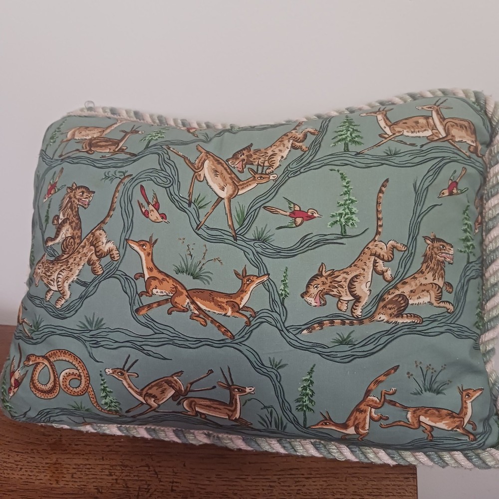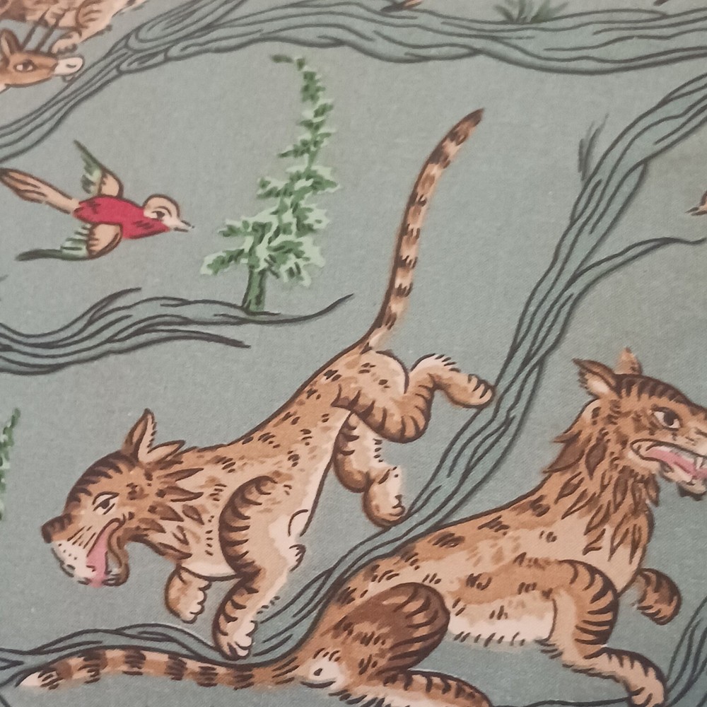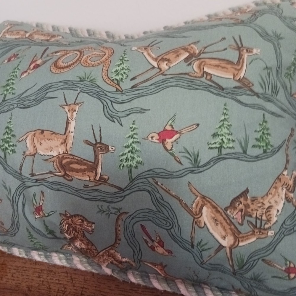 Smoke-free petfree Fantasy forest animals, birds, snakes and trees Green and off white cord border No holes rips tears or stain Measurements are approximate