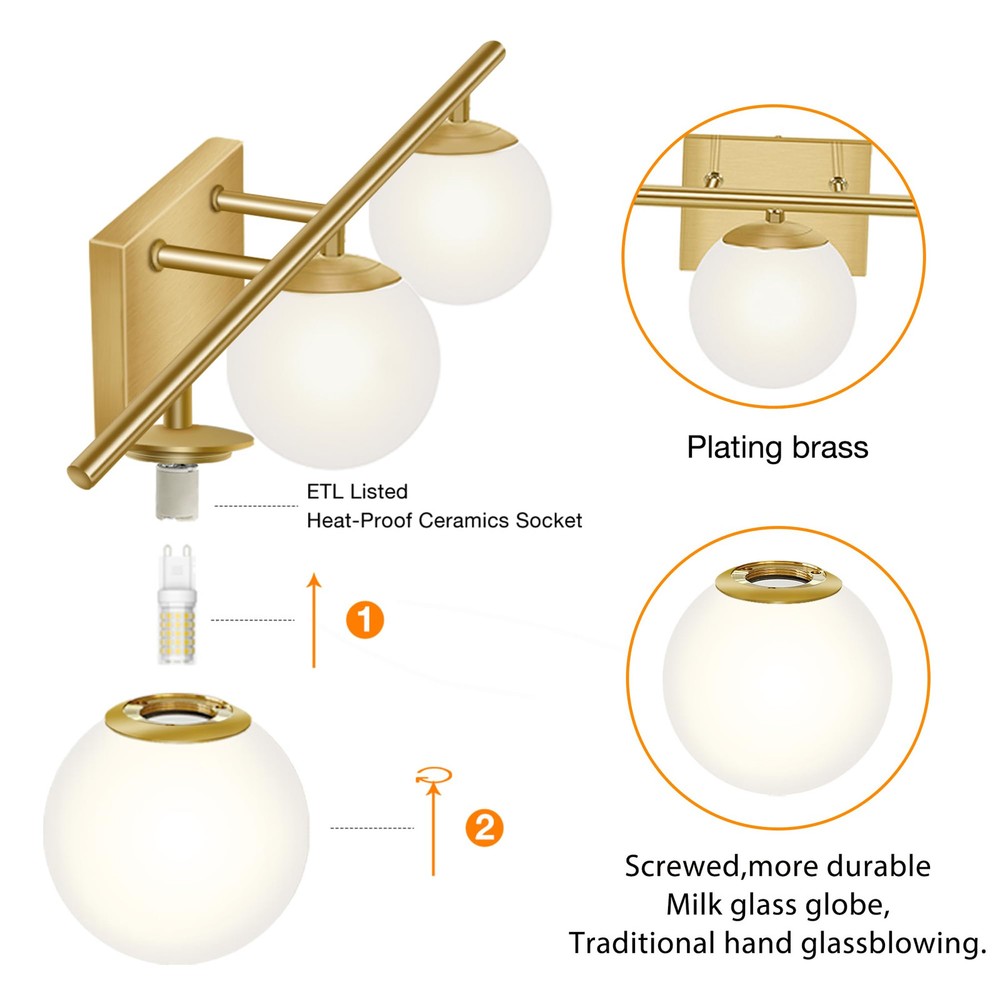 【Own US Patent Certificate】The brushed brass bathroom light fixtures feature a sleek brushed brass finish lamp body accompanied by milk glass shades. This exquisite bathroom vanity light is suitable for various decoration styles, making it the perfect choice to enhance your home lighting.IP44 Waterproof; 【Dimensions and Safe Use】3 lights,24in wide, The install size is 5.9*4.3 inch; the bathroom vanity light also features a strong and robust metal lamp pole that does not bend or become crooked during use or transportation. The metal ring is more durable and keeps the glass shades securely in place, ensuring both safety and durability for prolonged use., 【About Bulb】Max 40W for each bulb, could work with most bulbs with G9 bases. Suitable for Dimming & Non-Dimming G9 bulb (Not Included) Our brushed brass bathroom lights over the mirror feature a heat-resistant ceramic socket that can effectively withstand the heat generated by long-term bulb use. This durability significantly reduces the need for frequent bulb replacements, making our bathroom lights over the mirror a cost-effective and safer option with an extended lifespan 【Easy for installation 】 No switch or cord on the light. JUST Connect to the reserved wire directly,Suitable US junction box standard. This versatile brushed brass vanity lights for the bathroom can be installed in either an upward or downward direction, giving you the freedom to customize the lighting to suit your preferences. After-Sales Service】 When you receive products have any questions, Glass shade is fragile. Please contact us when there is a problem with the globe. we will give you the best solution within 24 hours, allowing you to rest assured.