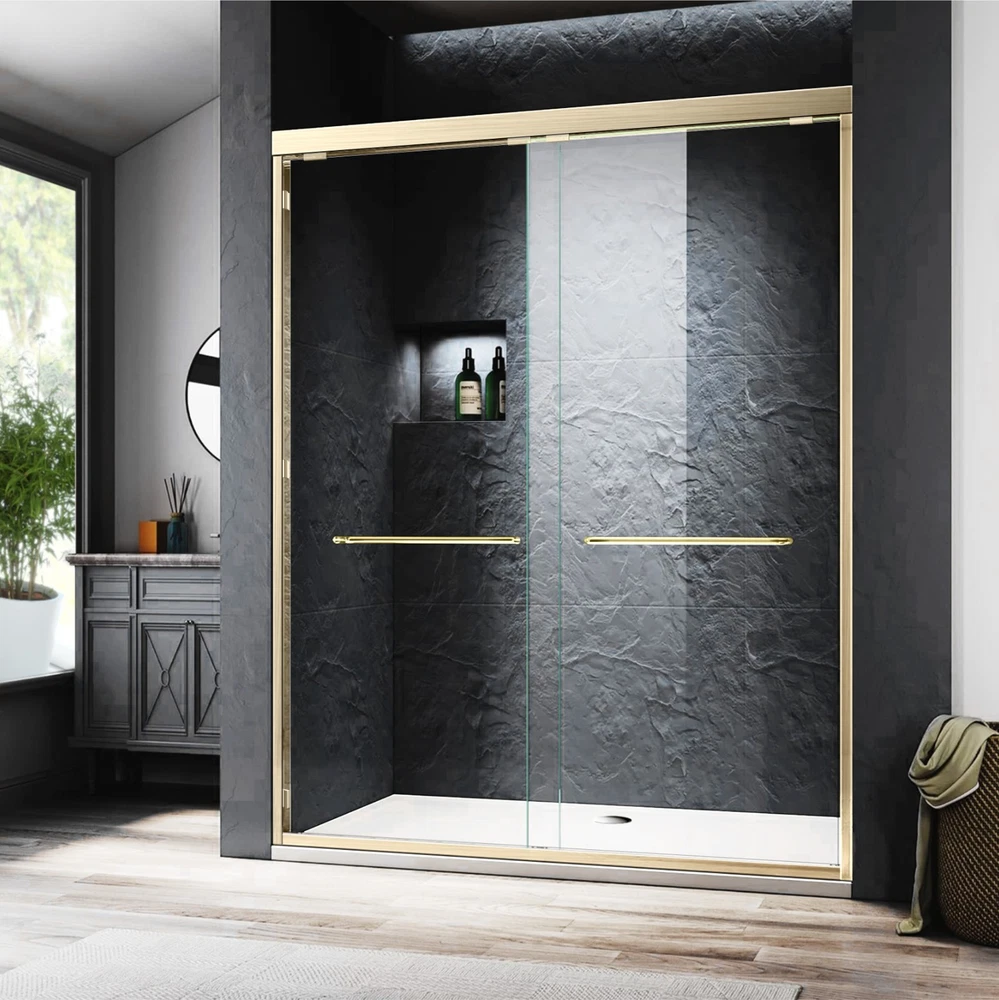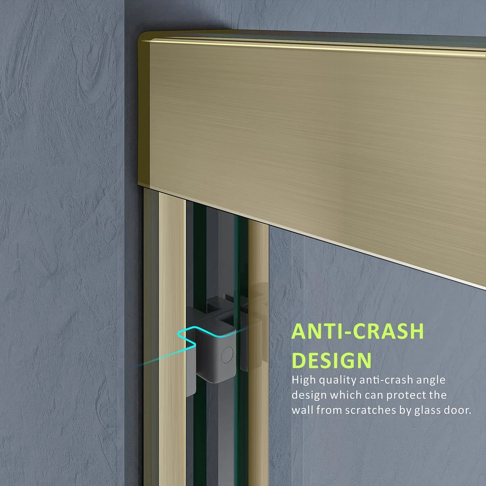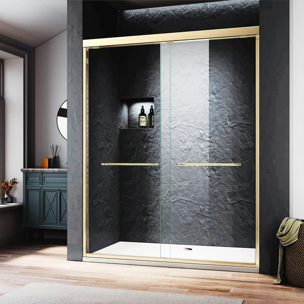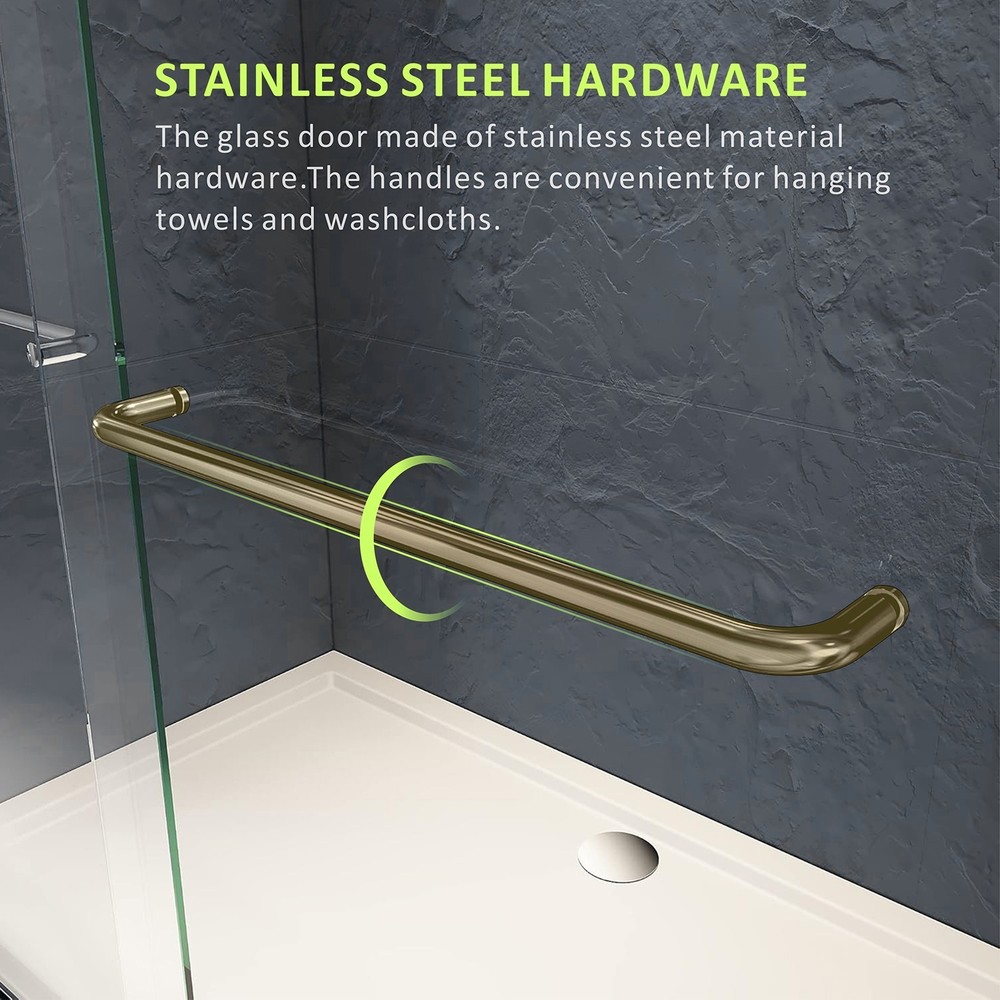 Framed Shower Door 54" W x 72" H; Width Adjustment Range: 50 in. to 54 in. by cutting guide; Color: Brushed Gold. Splash-Proof Design The brushed gold walk in shower adopting high-quality materials and structural design to enhance waterproofness, the splash-proof structural design at the bottom can effectively prevent water leakpage, and glass door look both sides are covered with a waterproof sealing strip to effectively prevent water splashing and leakage, thus keeping the rest of the bathroom dry. Double Sliding Design The framed shower door has two long handles that let the glass panels glide open and shut smoothly and easily.The aluminum alloy material makes them more sturdy and resistant to rust. Safety Clear Glass Brushed gold walk in shower door with 1/4" (6mm) tempered glass is certified by ANSI, not easy to break, making your bathroom safer and less stressful. Easy Assembly The framed shower door can be installed left and right, with an illustrated instruction and all necessary fixings supplied, easy to install. Professional installation is recommended. DOUBLE SLIDING GOLD SHOWER DOOR TEMPERED GLASS SHOWER DOOR ADVANCED DETAILS DESIGN As a professional bathroom product manufacturer, we always provide you with better products and more efficient services, but the following service terms need to be known to you: 1: If you find some problems with the product after receiving the goods, please do not discard the product, because we need you to provide pictures or videos of the relevant faults to better serve you. 2: Please note that we do not bear the installation/assembly costs. If you find a fault during the installation of the product, we will not bear or reimburse this cost because we stipulate that all parts must be checked before booking. 3: Delivery within the United States only, excluding Alaska/Hawaii, Puerto Rico, Guam, Saipan, APO/FPO, US Protectorates and PP Box. Usually the delivery time is 1 to 7 business days. If you still have not received the goods after 7 business days, please contact us immediately and we will track the order for you. 4: If your goods are damaged when delivered, you must refuse the order and describe the damage on the receipt. Just fill in "the goods are damaged". If you accept the goods and the damage is not noted on the receipt, we reserve the right not to refund or replace your goods. If you are not satisfied with your purchase, please contact us within 7 days. Please note that there is a 20% restocking fee and all shipping and handling charges are the responsibility of the buyer.