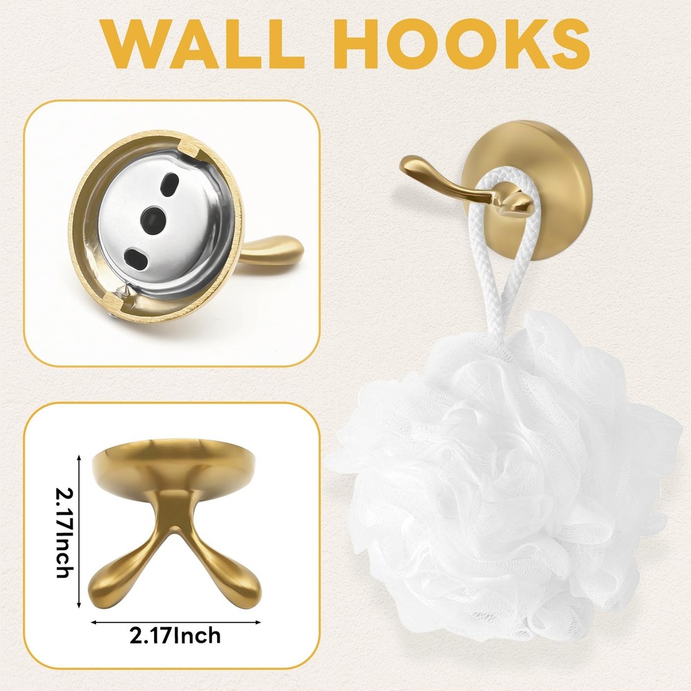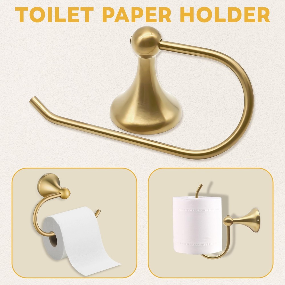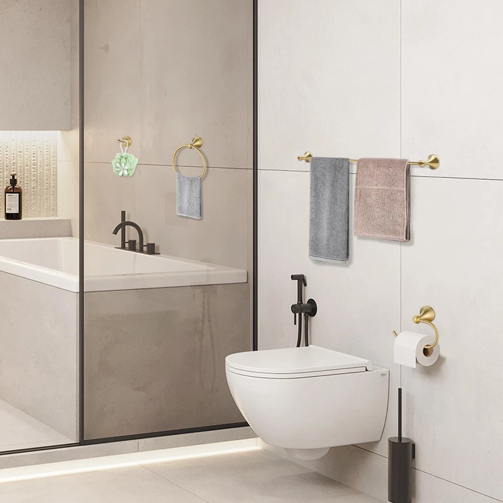 HIGH QUALITY: 4 pieces brushed gold bathroom hardware set are made of SUS304 stainless steel, anti-rust and anti-corrosion, ensuring durability and dependability NICE LOOK & KEEP NEW: Gold bathroom hardware kit prevents rust and corrosion for long lasting durability, make your bathroom more luxury, nicely matches with your gold fixtures. BEAUTIFUL APPEARANCE: Modern design, classy style. Concealed screws design. makes it clean looking. Perfect for use the pieces individually in other bathrooms, kitchen or bedroom. 4-PIECES BATHROOM ACCESSORIES SET: Package includes includes: 23.6 inch towel bar, Hand Towel Holder, toilet paper holder, robe hooks. EASY INSTALLATION: Come with all the mounting accessories needed for easy installation 4-Piece Bathroom Accessory Set: Gold bathroom hardware set includes 60cm towel bar, towel ring, toilet paper holder and towel hook, meet daliy bathroom using High Quality Material. Brushed gold bathroom accessory set is made from high quailty stainless steel and zinc, solid structure and rustproof Well Designed: Classy style and smooth surfaces, concealed screws design wall mounted make it clean looking Easy Installation. Come with all the mounting accessories needed for easy installation, just follow the directions to install Multi-Function: This gold hardware set not only perfect for bathroom but also fit for room or kitchen, which can save more space in your home