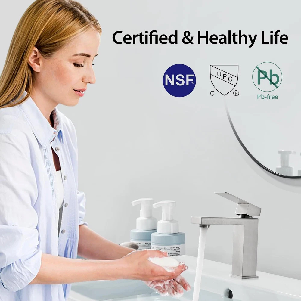 【cUPC Certified】— Bathroom faucets for sink 1 hole is made of premium quality lead-free stainless steel,which offers excellent corrosion resistance for long-lasting durability and safe for . It is also designed with cUPC certified supply lines for added safety and reliability 【Modern Design】— Vessel Sink faucet Brushed Nickel finish creates a modern look to resists water spots and fingerprint, requiring less cleaning.Its square geometric shape and minimalist design add a modern touch to any bathroom,lavatory,restroom,RV,farmhouse or vanity bar 【Single Handle & Pop-Up Drain】— RV Bathroom faucet single handle for easy adjustments to the stream and water temperature, which is suitable for daily use.The Pop-Up design only needs to press lightly, and the pop-up drain will quickly sprinkle water. 10% faster than traditional drain plugs. And the sturdy bouncing core can ensure you press more than 50,000 times 【Leak Proof & Water Saving】— RV bathroom vanity faucet adopts a ceramic disc cartridge,a high seal performance cartridge valve provide you a smooth stream and low probability of leakage. And the service life can reach 500,000 times. The air bubbles provide effective limescale protection, keeping the water flow straight and soft without splashing,can save 30% of water 【Package Included】— With 5.9" deck plate,stainless steel bathroom faucet is designed for 1 or 3 hole 4 inch center sink installation.2 flexible Hoses(Hot and cold),and 3/8" female compression thread with adapters included for an easy install. 【CEC Information】: Model Number:20301BN Manufacturing:KaiPingShi KeRui WeiYu YouXian GongSi Brand:.