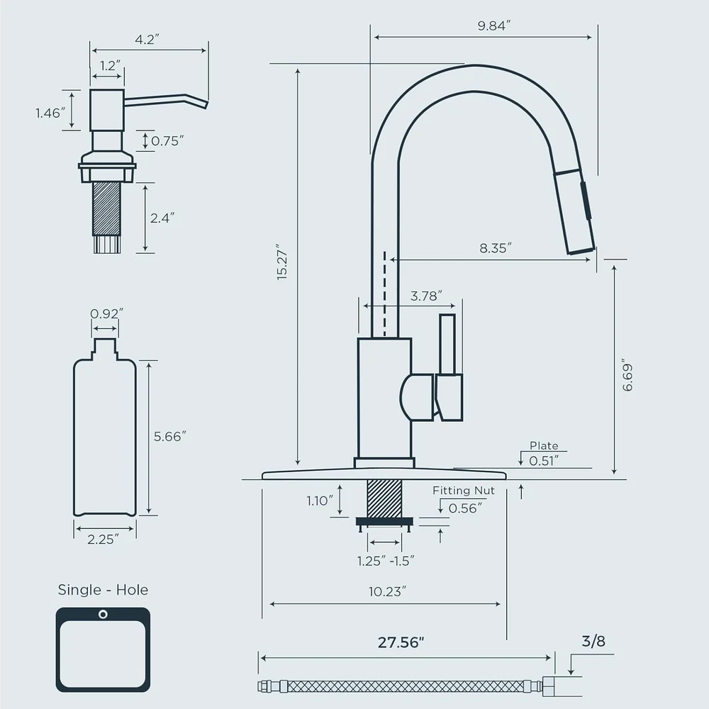 Valve Type: Cartridge Valve Is Electric: No Hole Count: 1 Color: Stainless Steel Handle Type: Lever gtin13: 711181382464 Mounting Type: Deck Mount Model Name: Kitchen Faucet with Soap Dispenser-FF0043BN-SD Maximum Flow Rate: 1.8 Gallons Per Minute Handle Material: Stainless Steel Style: Modern Special Feature: Easy to Install, Pull Down Sprayer, 360 Swivel, Dual Function Spr Product Dimensions: 8.35"D x 10.04"W x 15.27"H Spout Reach: 8.26 Inches Brand: Does not apply Finish Type: Stainless Steel Recommended Uses For Product: Kitchen, Sink, Bar, Rv, Outdoor,Laundry, Farmhouse Batteries Included?: No Material: Stainless Steel Type: Does not apply Item Weight: 3.91 pounds Installation Type: Single Hole Warranty Type: lifetime Number of Handles: 1 Finish: Stainless Steel Hose Length: 18 Inches Spout Height: 6.69 Inches Item model number: FF0043BN-SD Series ID: FF00 Spout Design: High Arch Gooseneck UPC: 711181382464 Included Components: Aerator, Deck Plate, Installation Hardware, Instruction Manual, H Batteries Required?: No Warranty Description: lifetime parts replacement Handle Location: Center Special Features: Easy to Install, Pull Down Sprayer, 360 Swivel, Dual Function Spr