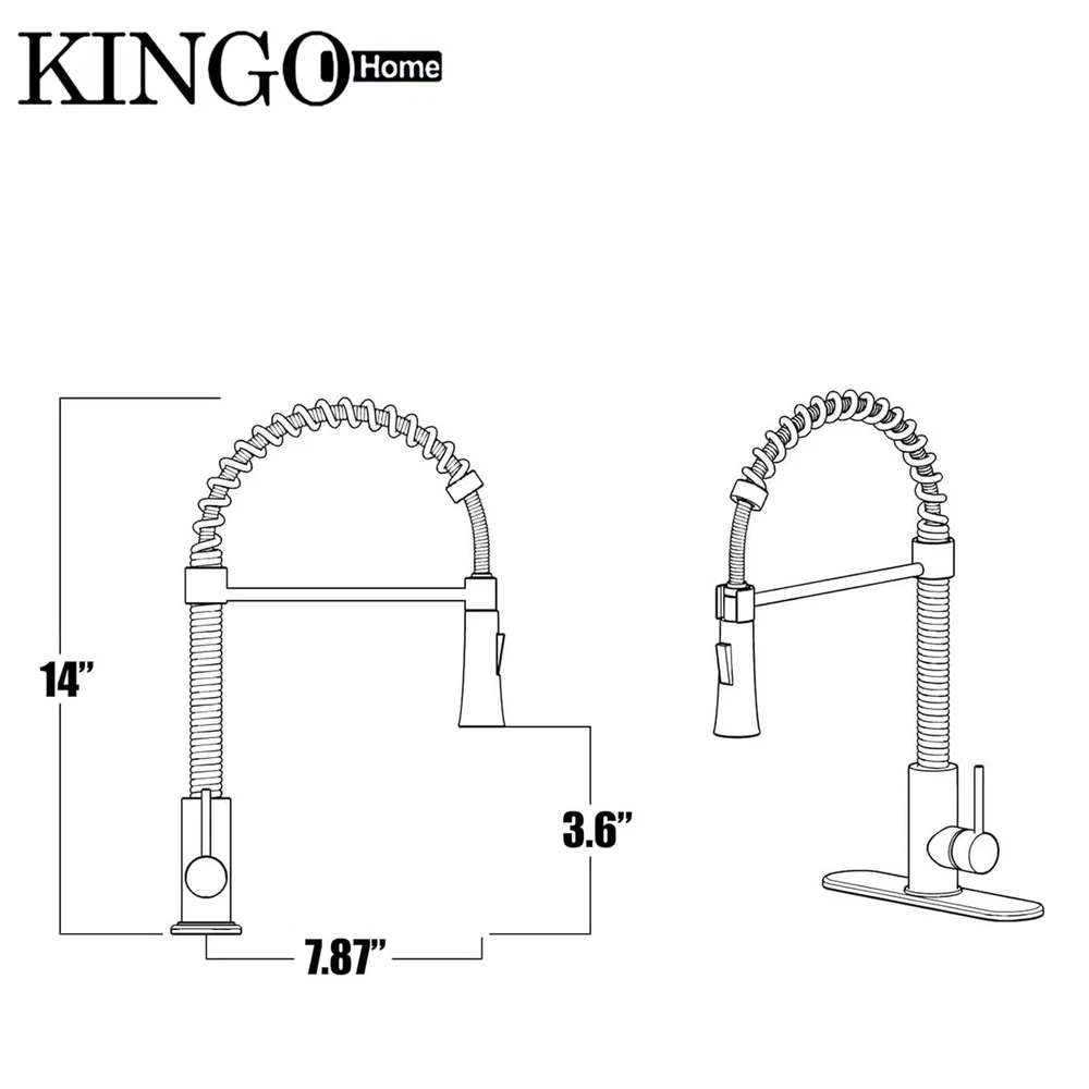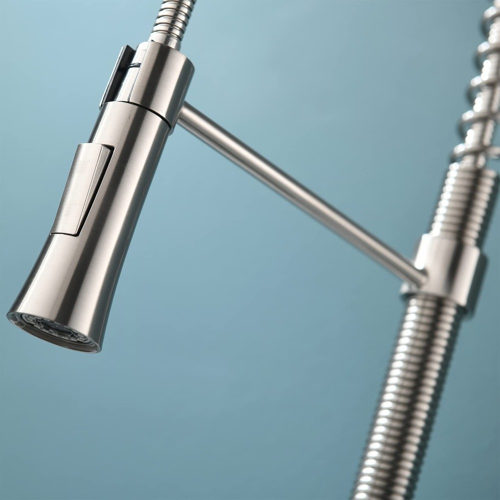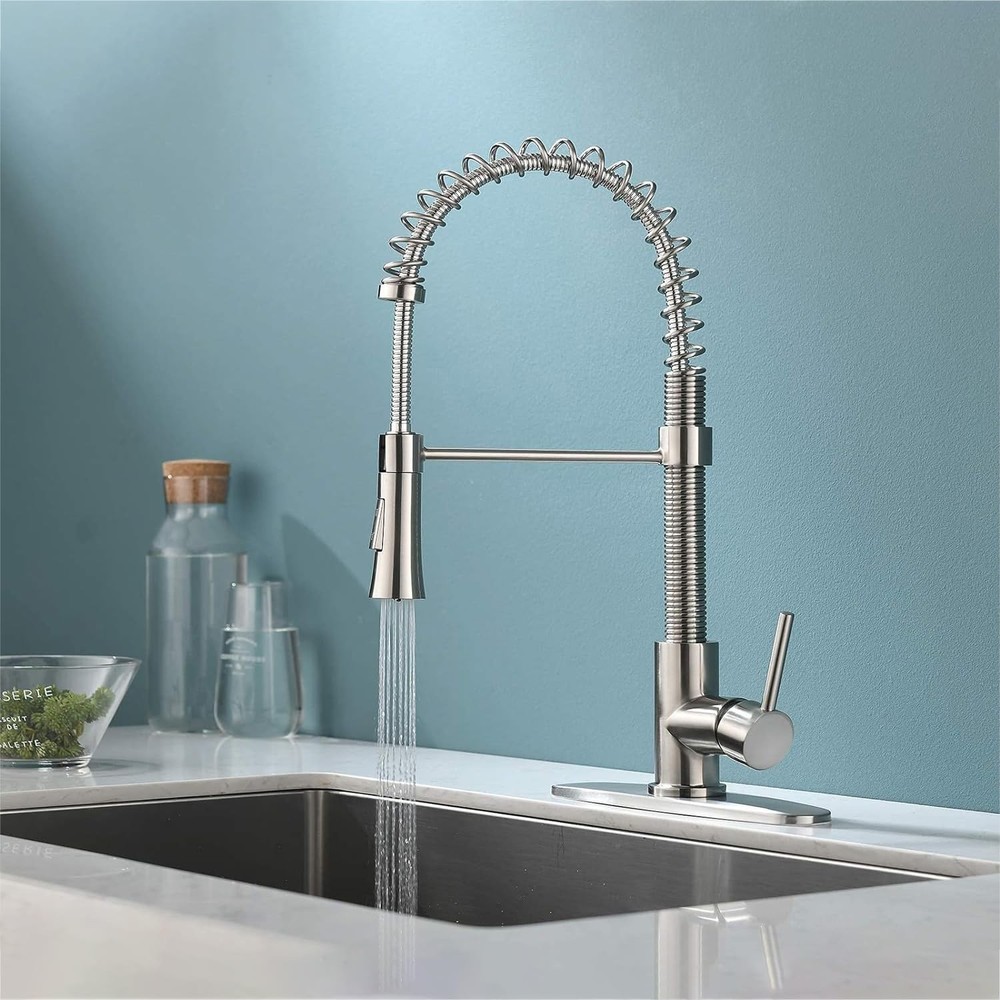 Color/Finish: Brushed Nickel Material: Main body material: Brass Valve: Ceramic valve Handle material: Stainless Steel Dimensions: Overall height: 14"; Spout Height:3.7"; Spout Reach:7.87" Installation: Installation Type: Deck Mounted Number of Holes Required: 1 Max Deck thickness: 1.38" Connection Type: both fit 3/8" and 1/2" system(adapter included) Feature: Water Mode: Stream/Spray Water Feature: Mix Hot and Cold Water Pressures: Minimum 0.5 bar, 1.0 bar recommended Package Content 1.Kitchen sink faucet 2.23.6 inch (60 cm) long Hot & Cold Water Hoses, 3/8" female compression thread with 1/2" adapters 3.Mounting hardware Why order from ? ★ Reliable Ceramic Cartridge -The ceramic disc cartridge can survive 500,000 times open & close test. Sophisticated ceramic engineering provides both convenience and control precision. ★ 100% Pressure Tested -Each faucet is tested at high water pressure to ensure high quality and long durability. ★ Hassle-free Installation -Faucet package includes water hoses with 3/8" female compression connector, U.S. standard size.Also a 1/2" adapter is included if you need. ★ 90-day Moeny Back Guaranteed -When you order today, you're protected by a 100% money back and a free no hassle lifetime replacement warranty! Pull Down Sprayer: The faucet features a convenient pull-down sprayer for easy use. Single Handle Design: The faucet has a sleek single handle design for comfortable use. Stainless Steel Construction: Crafted from durable stainless steel for long-lasting use. Commercial-Grade Quality: Built to withstand heavy use in commercial kitchens. Modern Farmhouse Style: Sleek and minimalist design complements modern farmhouse decor.
