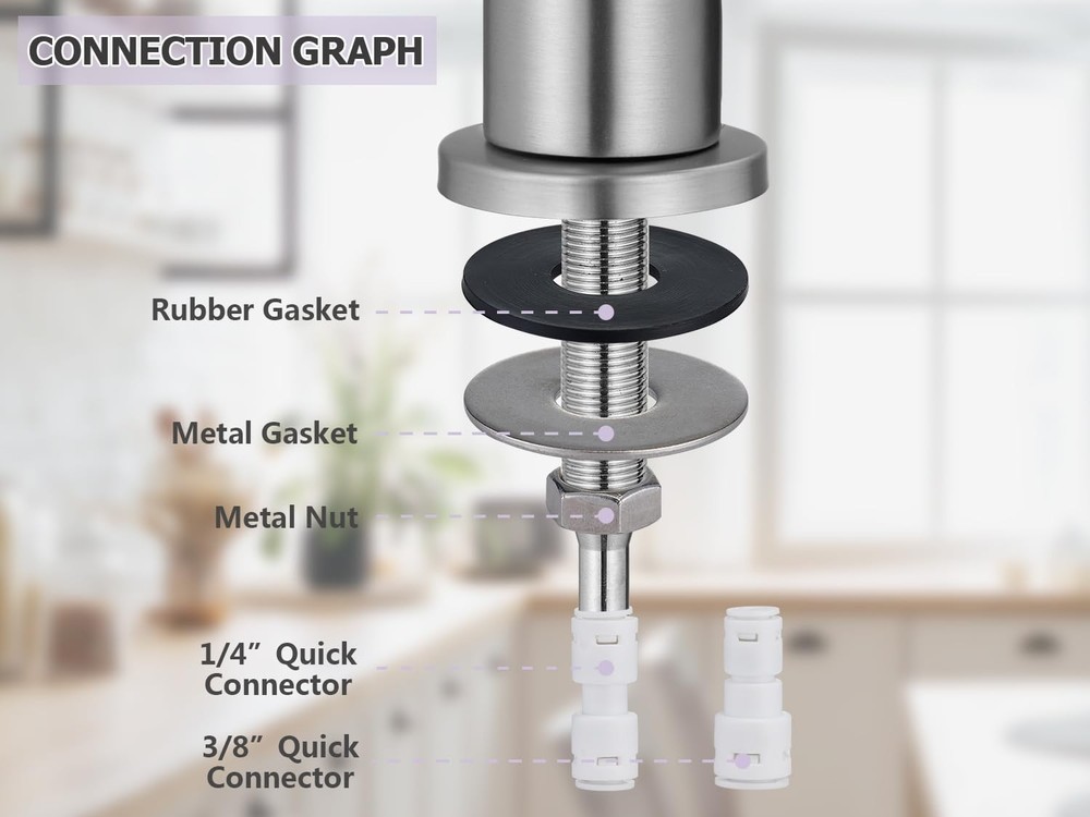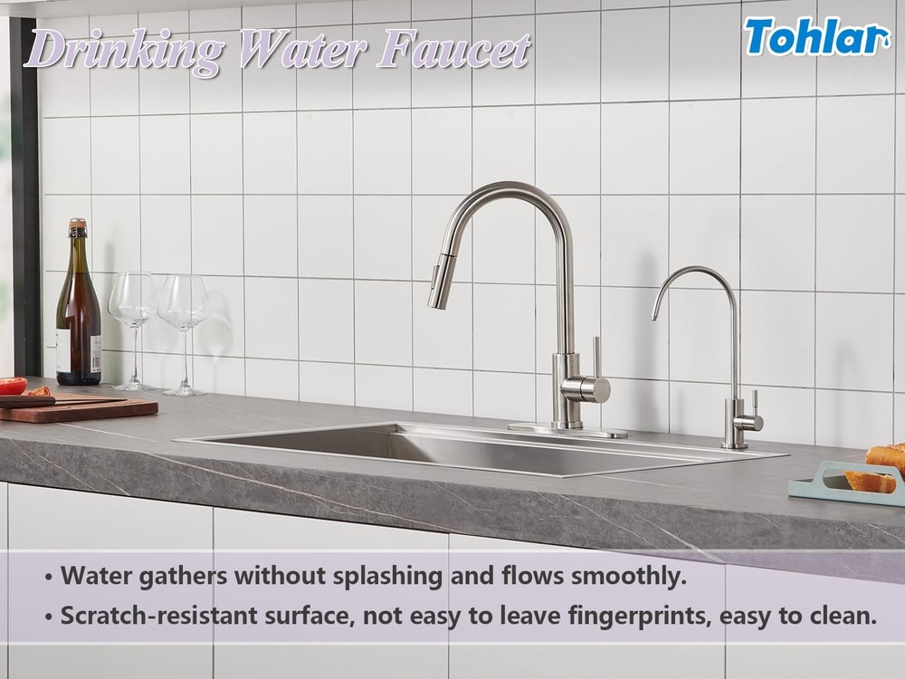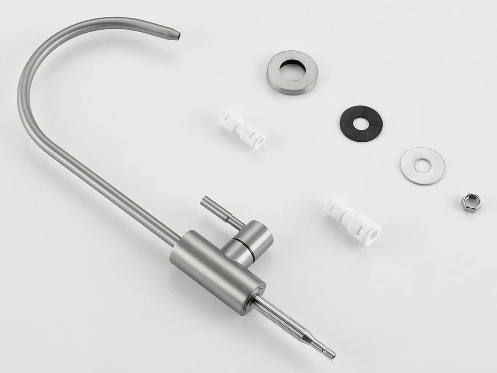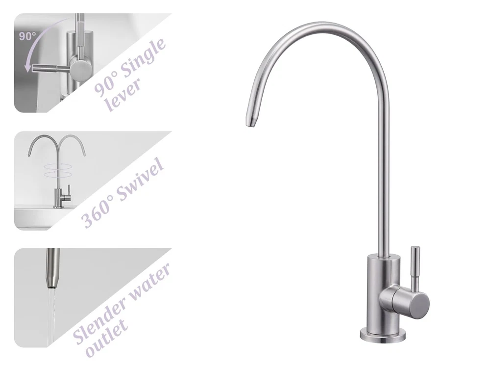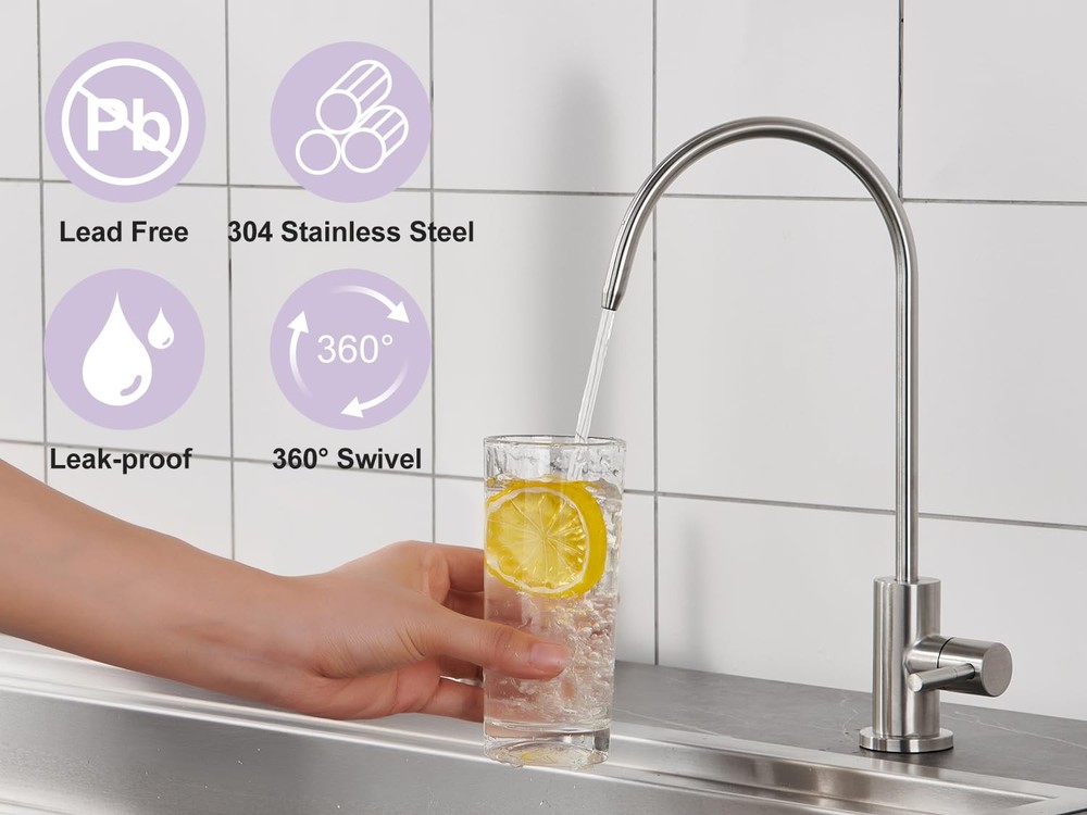 Drinking Water Faucet for Kitchen Sink LEAD-FREE STAINLESS STEEL CONSTRUCTION: filtered water faucet is made of lead-free stainless steel, which is sturdy, durable, rust and corrosion resistant. We prioritize the safety of the water you and your family drink. INNOVATIVE WATER FILTRATION SYSTEM: Provides clean, healthy filtered drinking water from your home faucet, eliminating the need to buy expensive bottled water or constantly change filters. Compatible with most reverse osmosis and simple filtration systems ( not included). DRIP-FREE DESIGN: Kitchen water filter faucet is made of high-quality ceramic cartridge (build to survive 500,000 open-close cycles), ensuring no leakage. The handle can be rotated 90° and the faucet can be swiveled 360°. SINGLE HOLE INSTALLATION: Reverse osmosis faucet includes 1/4" and 3/8" quick connectors for kitchen sink holes from 0.55 to 1.45 inches and countertops less than 2.15 inches thick. PRE-PURCHASE NOTES AND 30-DAY MONEY BACK GUARANTEE: Before purchasing, please check if it can be connected to your reverse osmosis unit or water purification system. If our drinking water faucet does not meet your expectations, we have a 30-day money back guarantee.