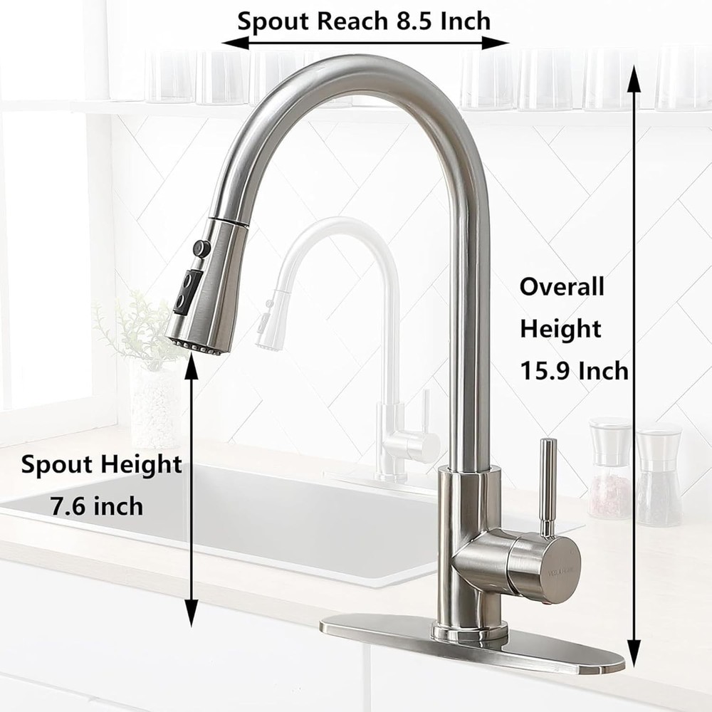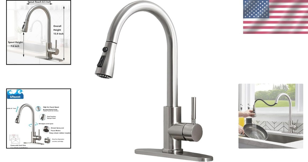 Brushed Nickel Pull Down Kitchen Faucet with 3 Function Sprayer for Versatility ‹ › ‹ › ‹ › ‹ › ‹ › ‹ › ‹ › ‹ › ‹ › ‹ › ‹ › Brushed Nickel Pull Down Kitchen Faucet Your kitchen deserves a touch of sophistication and functional elegance with this Brushed Nickel Pull Down Kitchen Faucet. Key Features: Pull-Out Design: Spout height of 7.6 inches with an 8.5-inch reach, providing a flexible spout that offers a wide range of motion. Easy to Operate: The single handle control allows for effortless adjustment of water temperature and flow volume. Full Access: High arc 360-degree swivel spout ensures complete washing access, while the sprayer head automatically retracts after each use. Quality Assurance: Crafted with durable metal construction, lead-free waterways, and a ceramic cartridge, guaranteeing lifelong leak-free performance. Superior Finish: The corrosion and rust-resistant finish enhances durability while maintaining a neat and polished appearance. Multifunctional Outlet Water: 3-way spray settings (STREAM, SPRAY, PAUSE) make it suitable for a multitude of tasks in your kitchen. Why Choose This Faucet? Upgrade your kitchen with our stylish and highly functional Brushed Nickel Pull Down Kitchen Faucet. Designed for versatility, it allows you to direct water exactly where you need it, making kitchen tasks a breeze. Durable and elegant, it's the perfect blend of form and function that will elevate your culinary space. Warranty: Enjoy peace of mind with our 90 days Money Back Guarantee and a free no-hassle lifetime replacement warranty. Transform your kitchen experience with a faucet that combines luxury and practicality. Order your Brushed Nickel Pull Down Kitchen Faucet today! Shipping Free & Fast Shipping - We offer free shipping to most of the USA with a normal delivery time of 3-10 businessdays. However, due to various situations, additional delivery time (up to 3 weeks) may be required for some items. Alternative Carriers - We may use alternative carriers (e.g. USPS, FedEx, UPS, etc.) to ensure your package arrives safely and on time. Due to the use of multiple carriers, we are unable to provide a tracking number automatically. Handling Time - Orders are processed and shipped within 1-5 business days of receiving cleared payment. Shipping Restrictions - Shipping to Alaska, Hawaii, Puerto Rico, Guam, and other US territories may incur shipping charges or delivery restrictions. Please contact us before ordering, or your order can be refunded/cancelled. State Restrictions - There may be restrictions based on your state of purchase. For example, certain items may not be shipped to California due to state regulations. Contact for Tracking Updates - If you require tracking updates or have any concerns about the delivery of your order, please feel free to contact us, and we will be happy to assist you. Return Please see our ebay return policy. We do not accept return on most products. This is to avoid customers mis-using ebay returns. All sales are final. Please be sure to check the return policy listed at the top of the listing. In rare cases, we may accept returns, if the buyer pays both ways shipping and 20% restocking fee. If you are un-sure of return policy of a particular item, please ask before buying. Payment We accept all major credit cards, PayPal, and Apple Pay for your convenience. Your payment information is secure and encrypted to ensure a safe and seamless transaction. Please complete your payment within 3 days of purchase to avoid any delays in shipping. Feedback Your feedback is extremely important to us. We strive to provide the best products and customer service possible. If you are satisfied with your purchase, please take a moment to leave us a positive review. If you have any concerns or issues with your order, please contact us before leaving negative feedback. We are committed to resolving any problems and ensuring your satisfaction. Contact Us If you have any questions or concerns, please feel free to reach out to our customer support team. You can contact us through the eBay messaging system. We are available Monday to Friday, 9:00 am to 5:00 pm EST, and we will do our best to respond to your inquiry within 24 hours. Buy it now and enjoy a pleasant shopping experience! UPC: Not Set Item Weight: 2.4 pounds Model: Not Set Unit Quantity: 1 Material: Stainless Steel Suitable For: Kitchen Sink,Kitchen,Laundry,Commercial Sink Features: Pull-Out,High Arc,360 Degree Swivel,Three Function Sprayer,Auto Retract Labels & Certifications: Not Set Room: Kitchen,Laundry Room Items Included: Sprayer Brand: Unbranded Type: Kitchen Faucet Finish: Brushed Number of Faucet Holes: 1 Color: Brushed Nickel Number of Faucet Handles: 1 Handle Type: Lever Faucet Mounting Type: Deck Mount Shape: High Arc Gooseneck Installation: Single Hole Item Height: Not Set Faucet Hole Spacing: 1 Item Width: Not Set Item Length: Not Set Spout Height: 7.6 Inches Manufacturer Warranty: Not Set MPN: Not Set Manufacturer: Not Set Product Line: Not Set Style: Modern Assembly Required: Not Set
