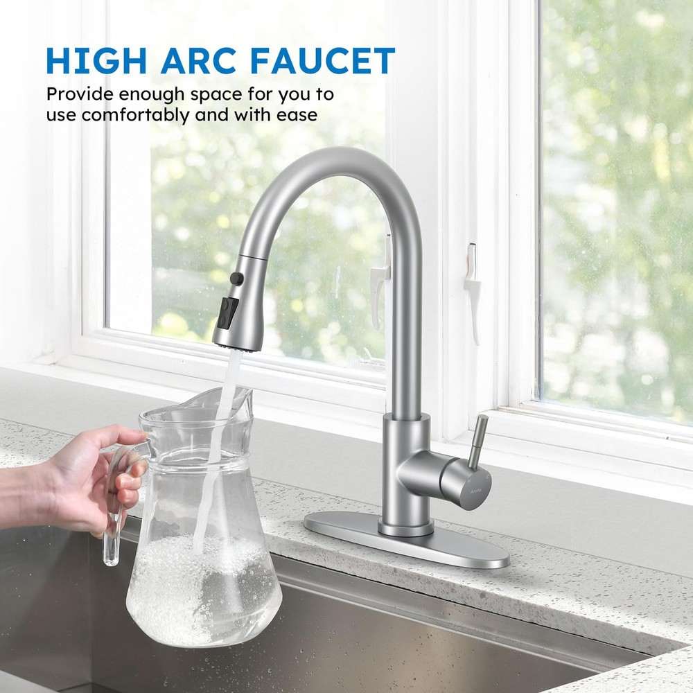 Multi-function kitchen sink faucet(STREAM, SPRAY, PAUSE) meets varying wash requirements, and the high arch gooseneck design makes it easy to rinse high pots and pans. The single handle design lets you control water temperature and flow volume easily. Three Modes for Versatility - Multi-function kitchen sink faucet(STREAM, SPRAY, PAUSE) meets varying wash requirements, and the high arch gooseneck design makes it easy to rinse high pots and pans 10 mins DIY - The pull-out and water hoses come pre-installed in the kitchen faucet. With everything you need in the box, finishing the installation is a breeze, saving your money on plumber fees Healthy and Durable - This kitchen faucet with pull-down sprayer is made with PEX inner hoses which are food-grade and odorless, preventing leaks and damage compared to PVC and EPDM Expanding Coverage - With an extended 24" pull-out faucet hose and a 360-degree swivel nozzle, this brushed nickel kitchen faucet provides wider reach at the sink for more convenience in the kitchen Built to Last - provides kitchen faucets made of high-quality stainless steel, including all metal connector parts and a premium ceramic valve that ensures high durability and stability