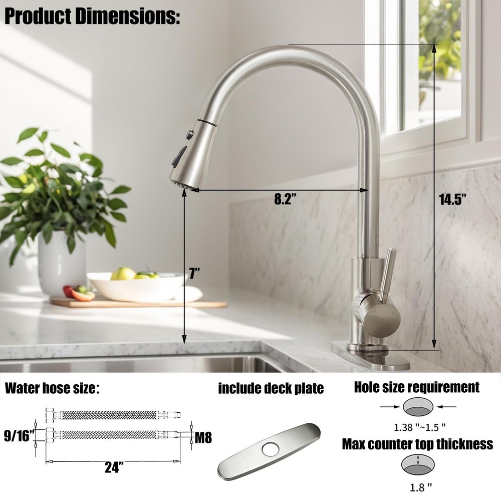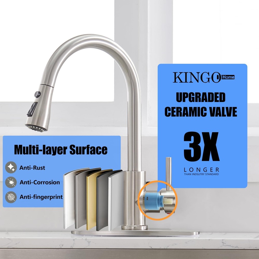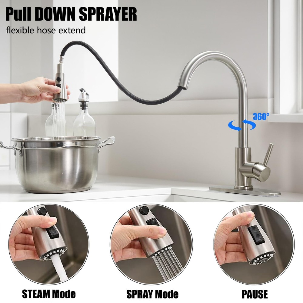 Kitchen Faucet with Pull Out Sprayer, Brushed Nickel Kitchen Faucets with Pull Down Sprayer, High Arc Single Handle Stainless Steel Sink Faucets 1 or 3 Hole, Kitchen Sink Faucets for Farmhouse Camper Laundry Rv Bar Multifunctional Sprayer: Pull out kitchen faucet with 3 setting modes: Stream, Spray, Pause. 360° rotation spray head, and a single handle for efficient sink coverage and effortless control. Reliable Quality: Commercial SUS 304 stainless steel construction forged products. It provides a superior anti-corrosion and anti-rust finish that prevents dirt such as fingerprints or water stains from adhering to the faucet surface.Flow Rate: 1.8 Gallons Per Minute, saving 20% water. Simple to Install: all mounting instruction included. The faucet is suitable for single hole or three hole sink, no plumber and special tools are required, follow the installation manual allows you to complete the DIY installation in about 20 minutes. Easy to clean: Stains of pull-down sprayer kitchen faucets can be wiped off with just one wipe, and faucets looks like new after long-term use, Elegant Faucet and reliable customer service: This sink faucet features a minimalist design suitable for any setting and comes with a three-year limited, free parts replacement. Buy with confidence and happy to contact anytime.