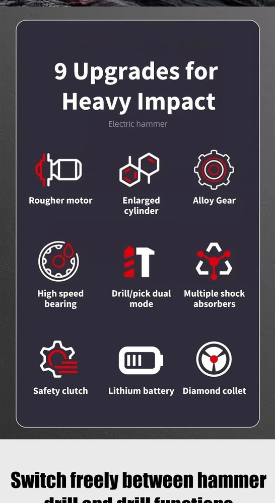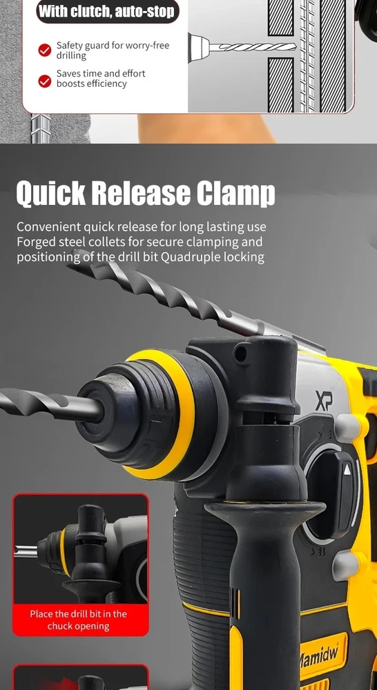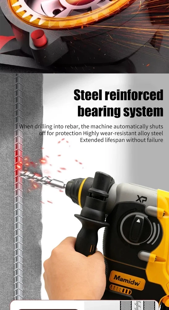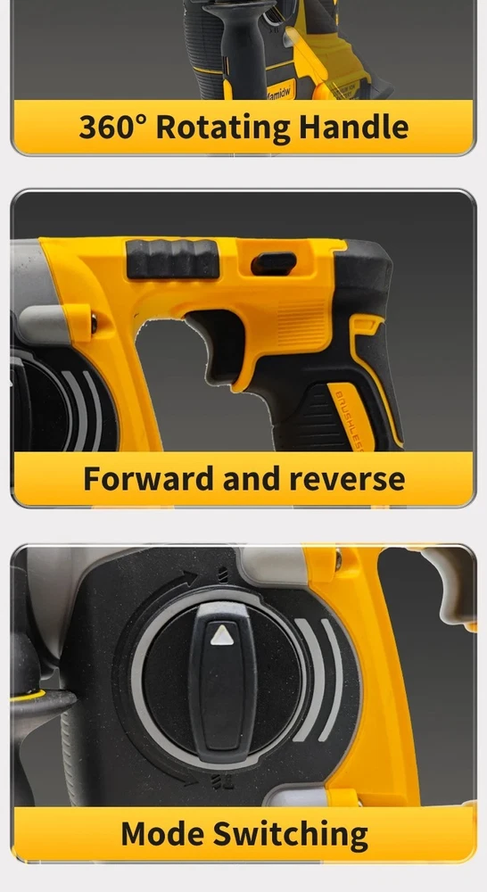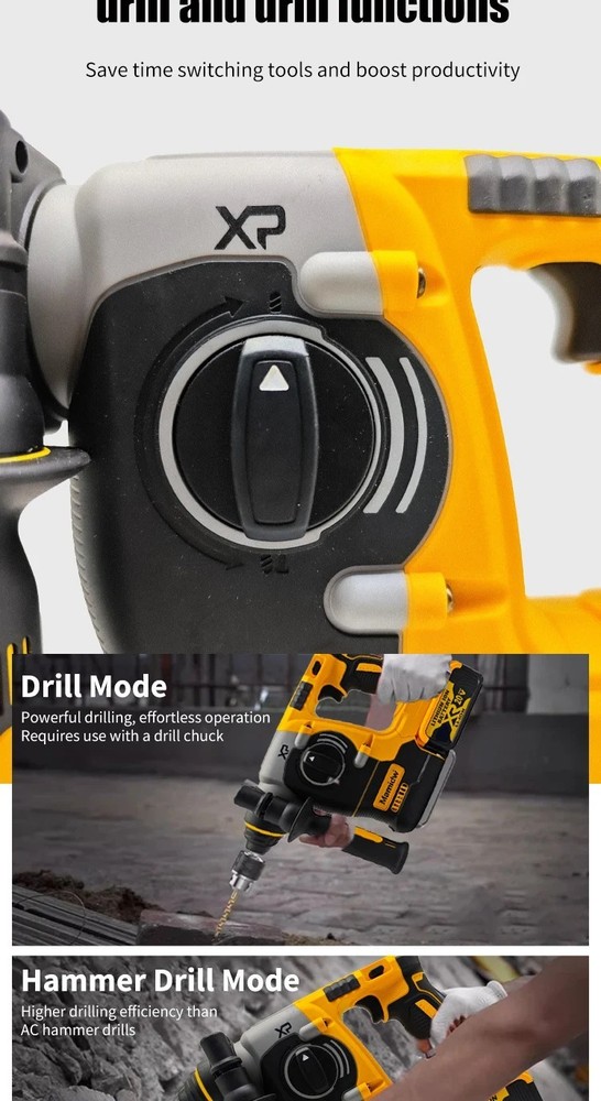 US SELLER Product Overview: Powerful cordless brushless rotary hammer drill designed for drilling and light demolition work. Compatible with DEWALT 20V batteries , this SDS hammer delivers strong impact energy for concrete, brick, and metal applications. Key Features: Brushless motor for higher efficiency & longer life 2 working modes: drilling & hammer drilling SDS chuck system for quick bit changes Cordless design — portable and easy to use Heavy-duty performance for concrete and masonry Ergonomic grip for better control Applications: Concrete drilling, wall installation, renovation work, metal & masonry tasks. Package Includes: 1 × Cordless SDS Rotary Hammer