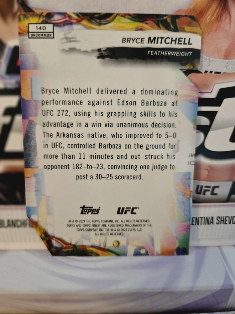 Elevate your UFC collection with the Bryce Mitchell Uncommon Die-Cut Refractor card from the 2024 Topps Finest series. With its limited print run of just 35, this card features a distinctive die-cut design that showcases the rising star's striking prowess, adding a unique piece of art to your sports memorabilia showcase. As part of the esteemed 2024 Topps Finest set, card number 19 captures the essence of Mixed Martial Arts with its high-quality craftsmanship and serial numbered exclusivity. Whether you're a die-hard fan of Bryce Mitchell or a collector of rare UFC trading cards, this particular piece stands out with its short print run and sleek parallel/variety finish.