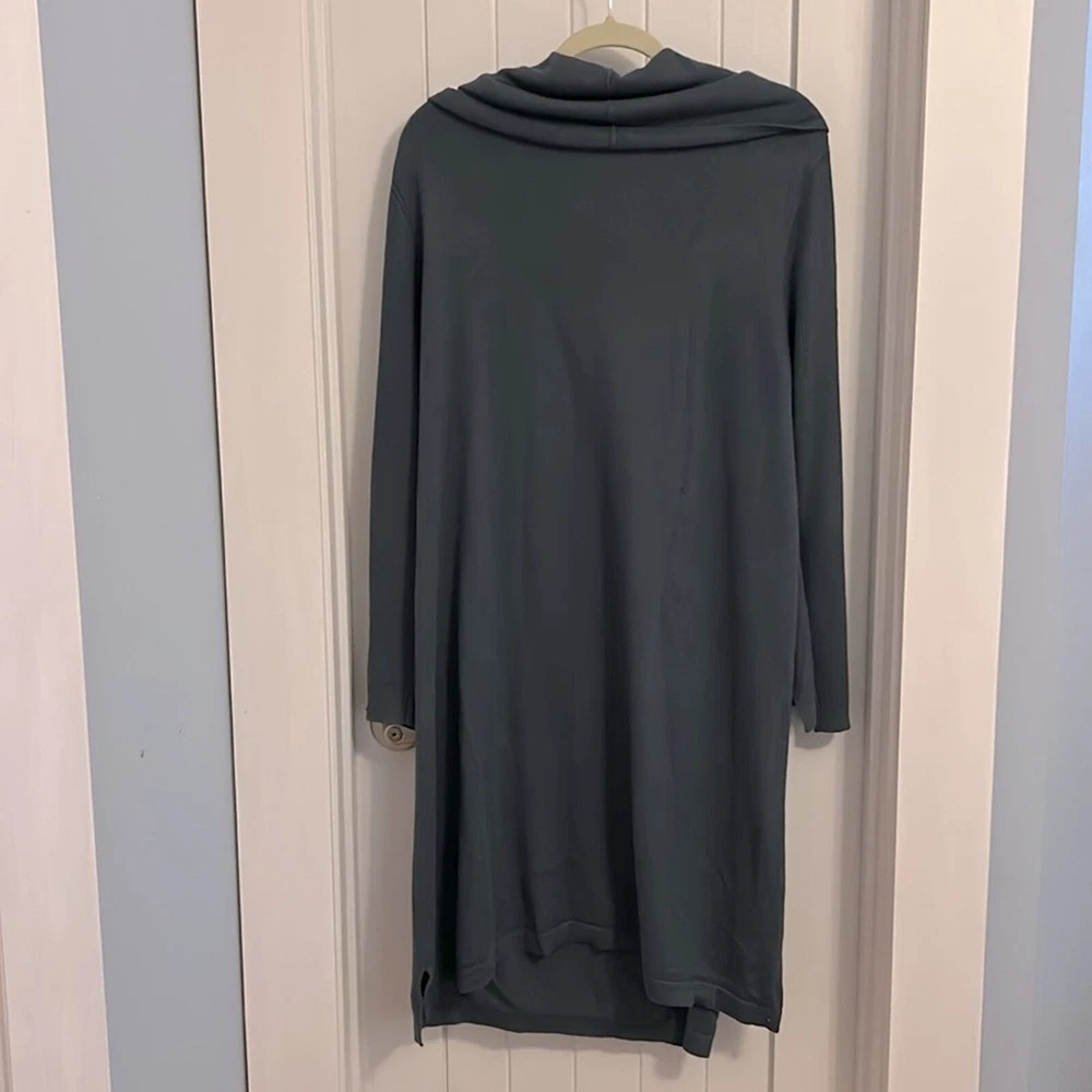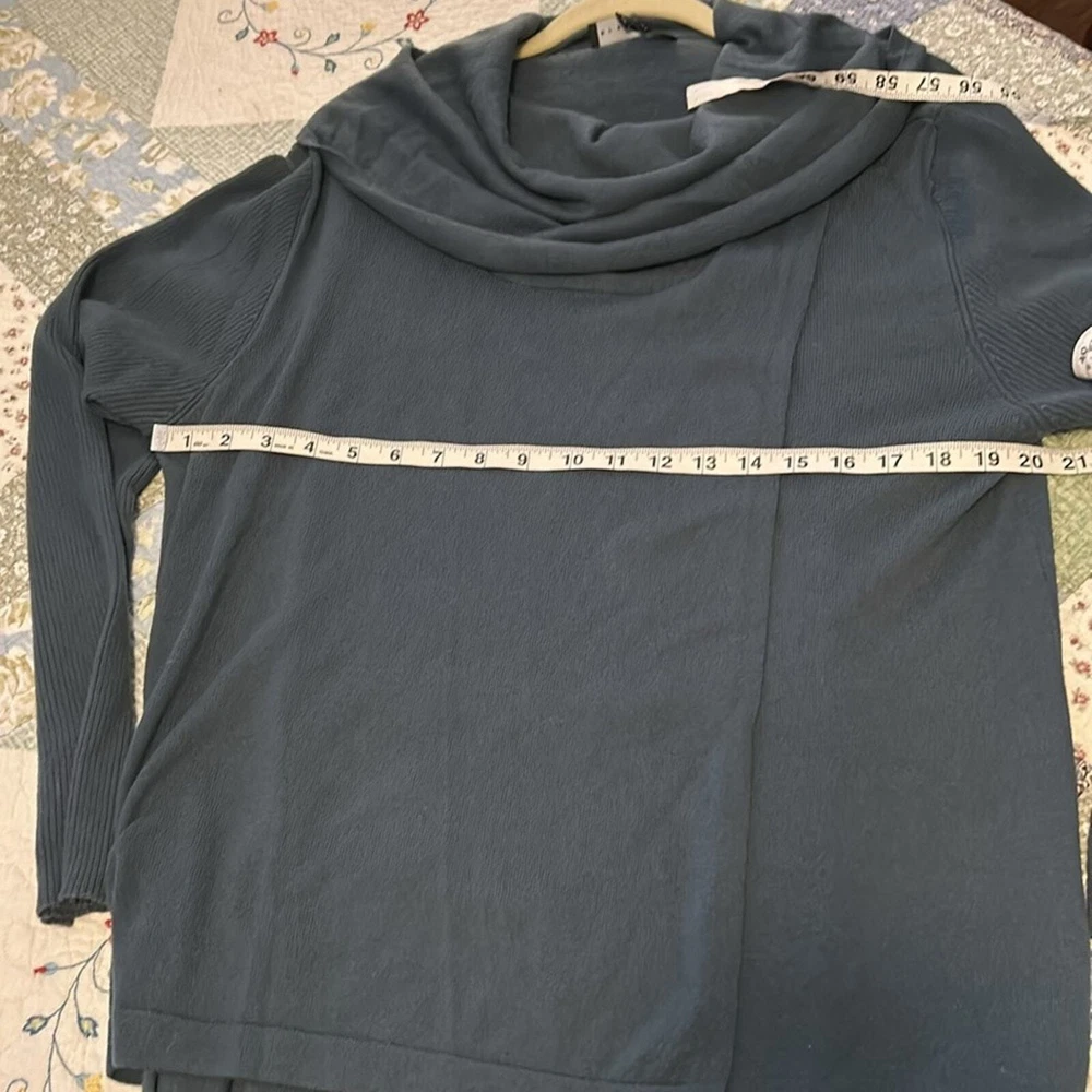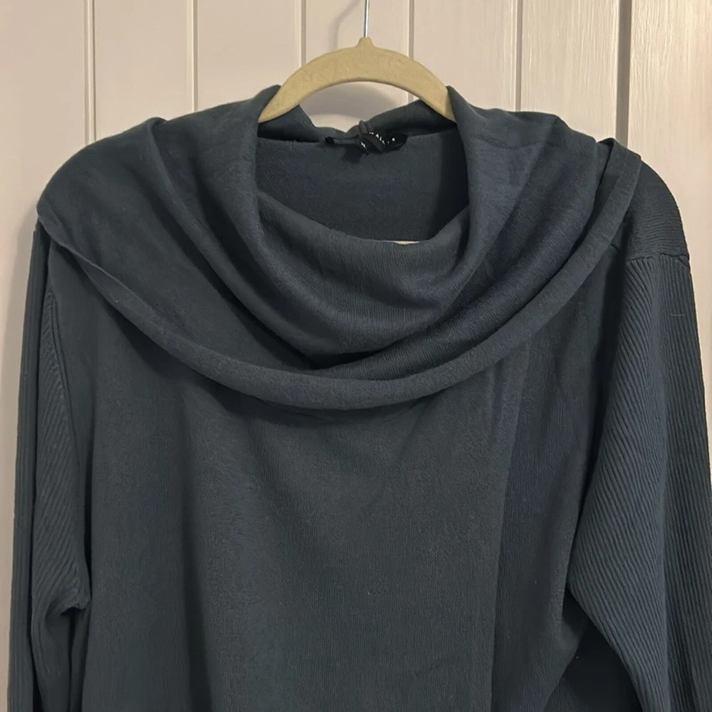 Bryn Walker Cotton Cashmere Cowl Neck Sweater Asymmetric, waist length in the front Longer tunic length in the back Ribbed long sleeves Deep muted green Size XL Measurements in photos