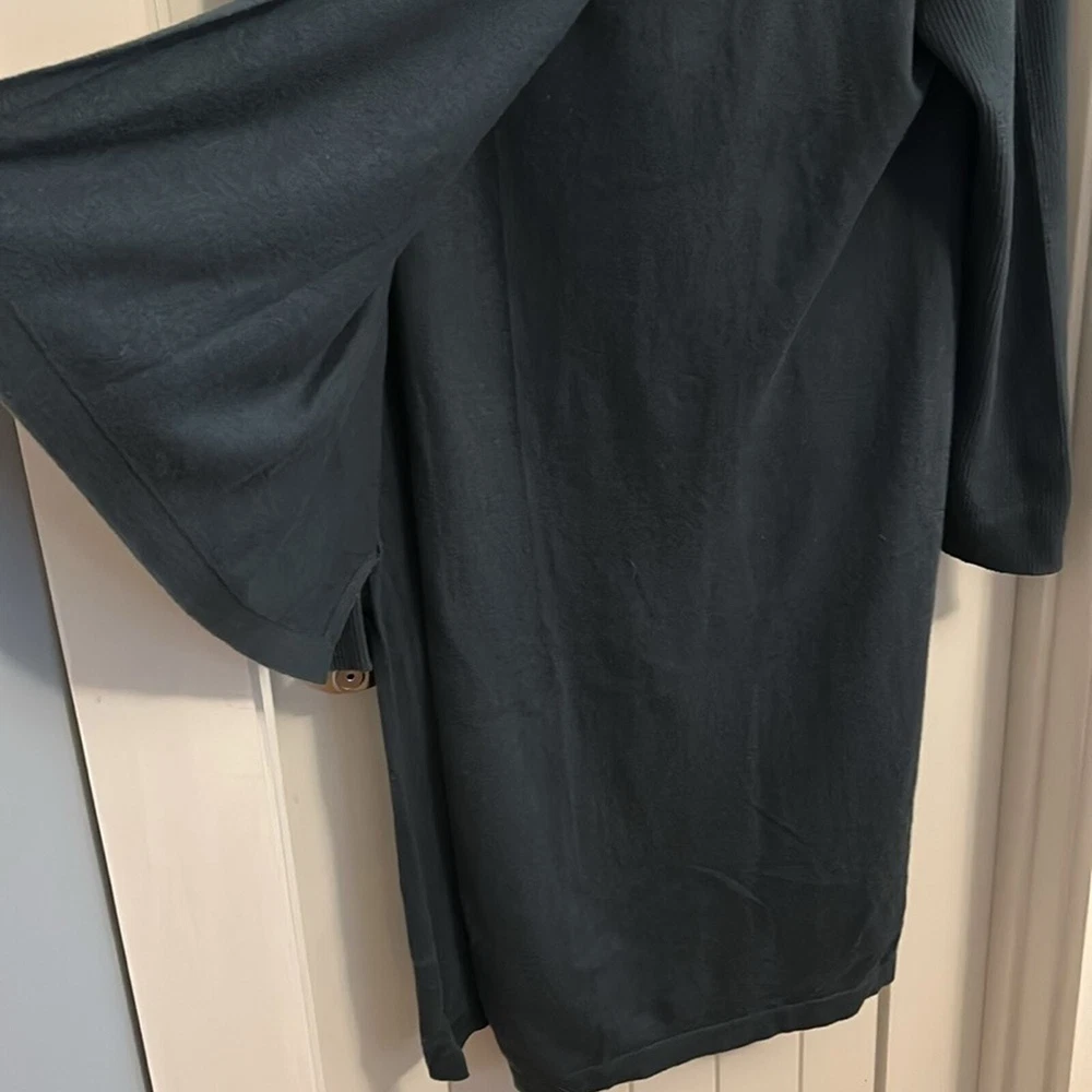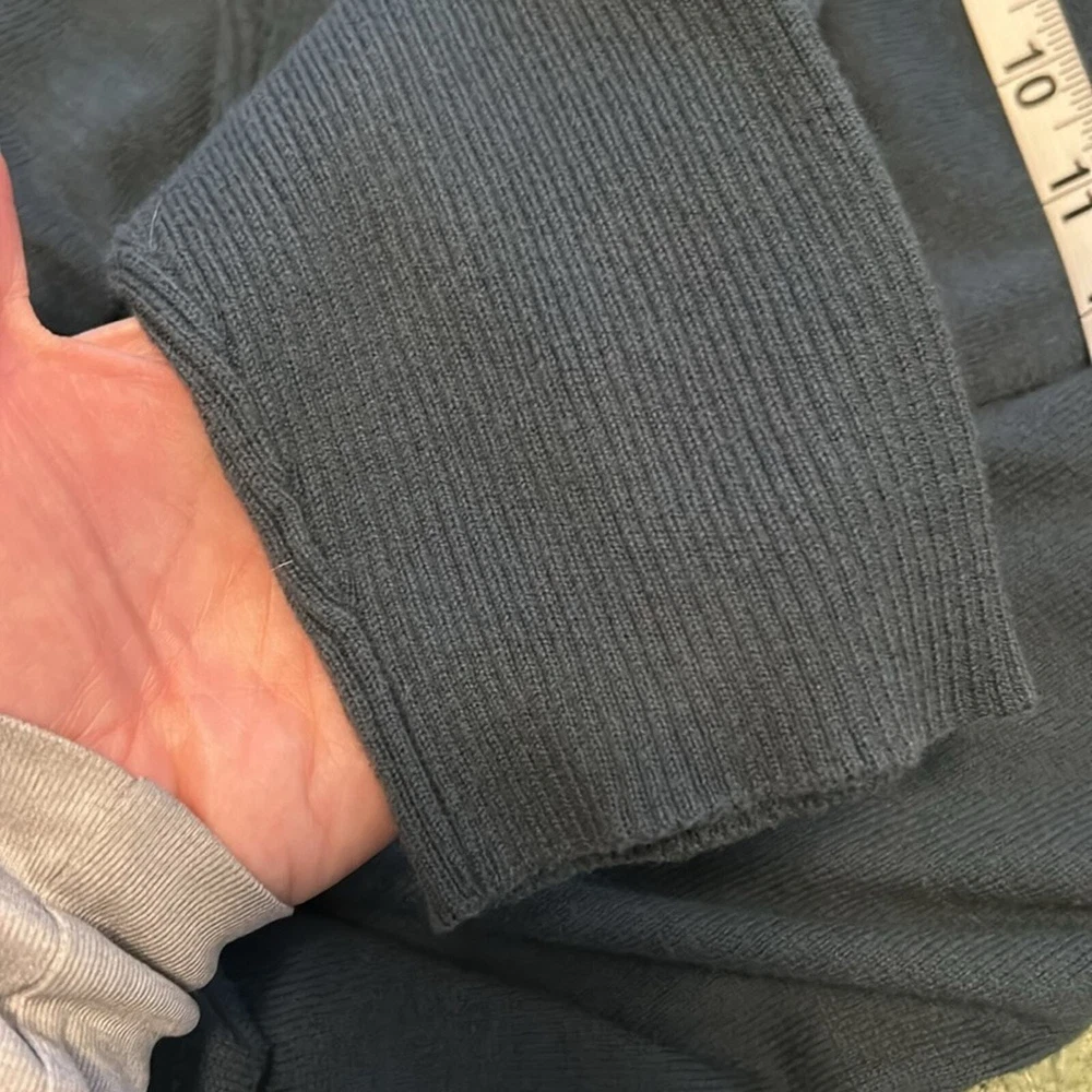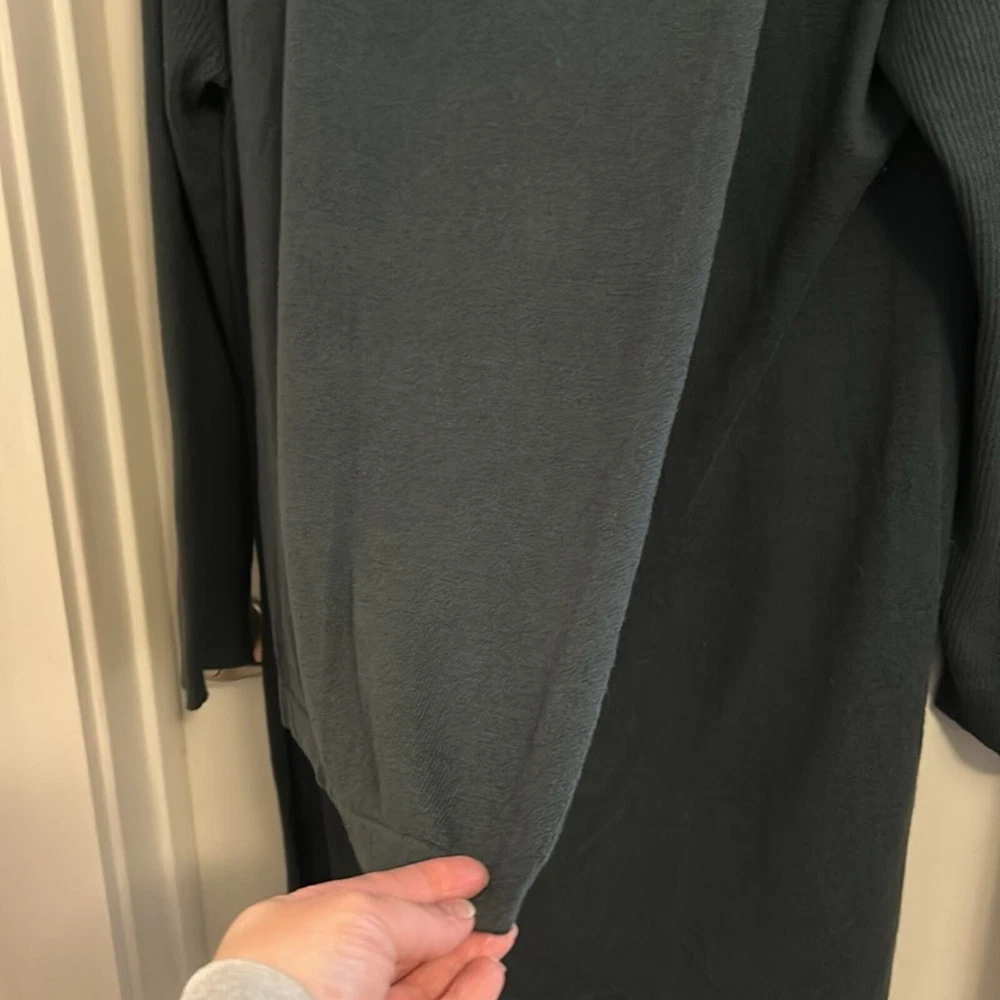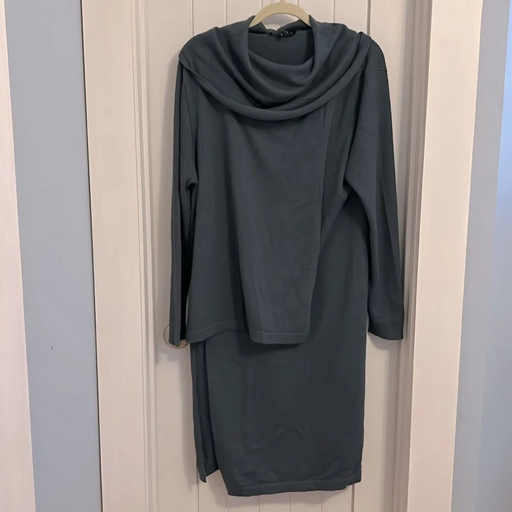 Bryn Walker Cotton Cashmere Cowl Neck Sweater Asymmetric, waist length in the front Longer tunic length in the back Ribbed long sleeves Deep muted green Size XL Measurements in photos