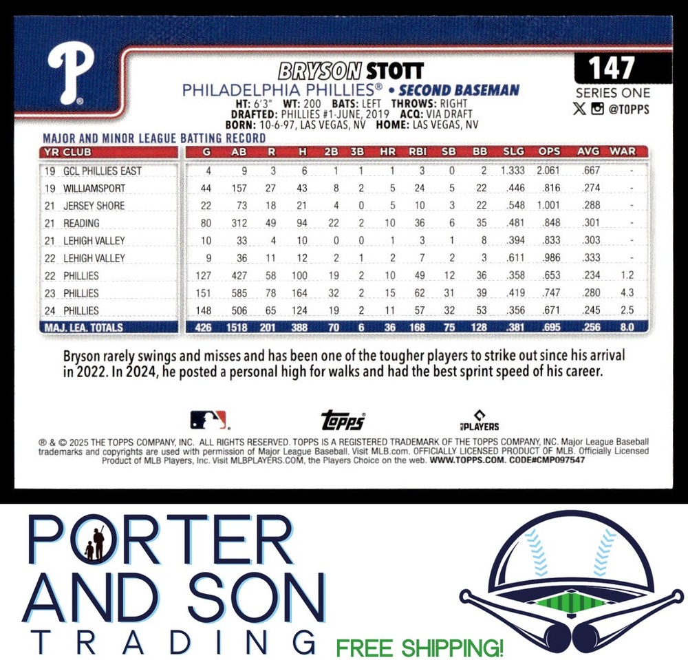 GREAT~ BRYSON STOTT 2025 TOPPS SERIES 1 #147 PHILADELPHIA PHILLIES BASEBALL CARD~~~~~~~~~GREAT SELLER~~~~~~~~~FAST SHIPPING~~~~~~~~~~~~THANK YOU