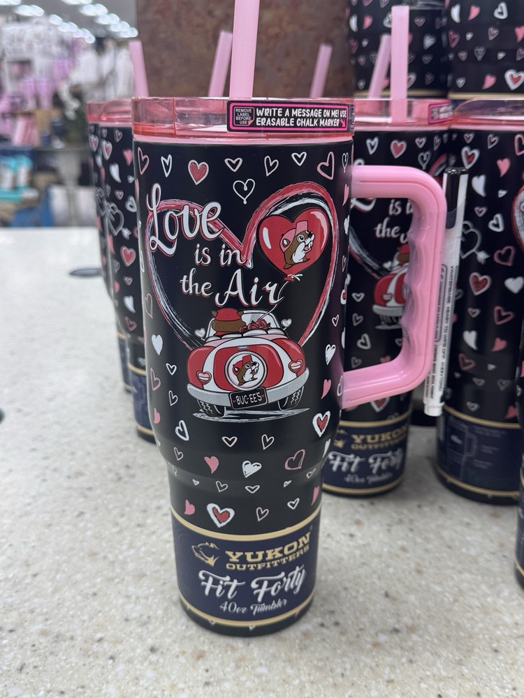 This is a Yukon Outfitters Buc-ee themed 40 oz Valentine's Day tumbler set. The tumbler features a "Love is in the Air" theme and includes a cup lid, straw, and is made of stainless steel, silicone, and BPA-free plastic. It is suitable for hot beverages, insulated, and has a handle for easy carrying. This limited edition tumbler is ideal for teens, boys, girls, kids, and adults looking for a festive drinkware option. Also includes a liquid chalk marker to write with perfect for future valentines days as it as no year on it