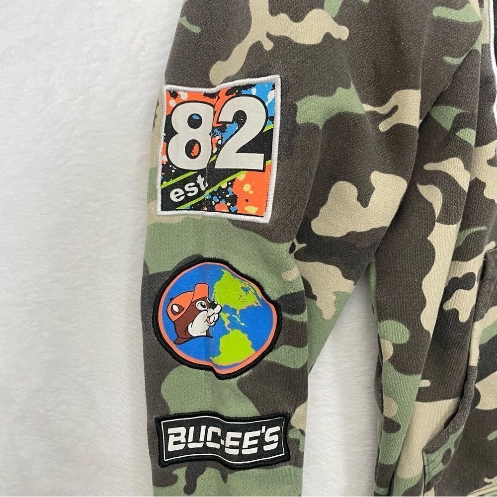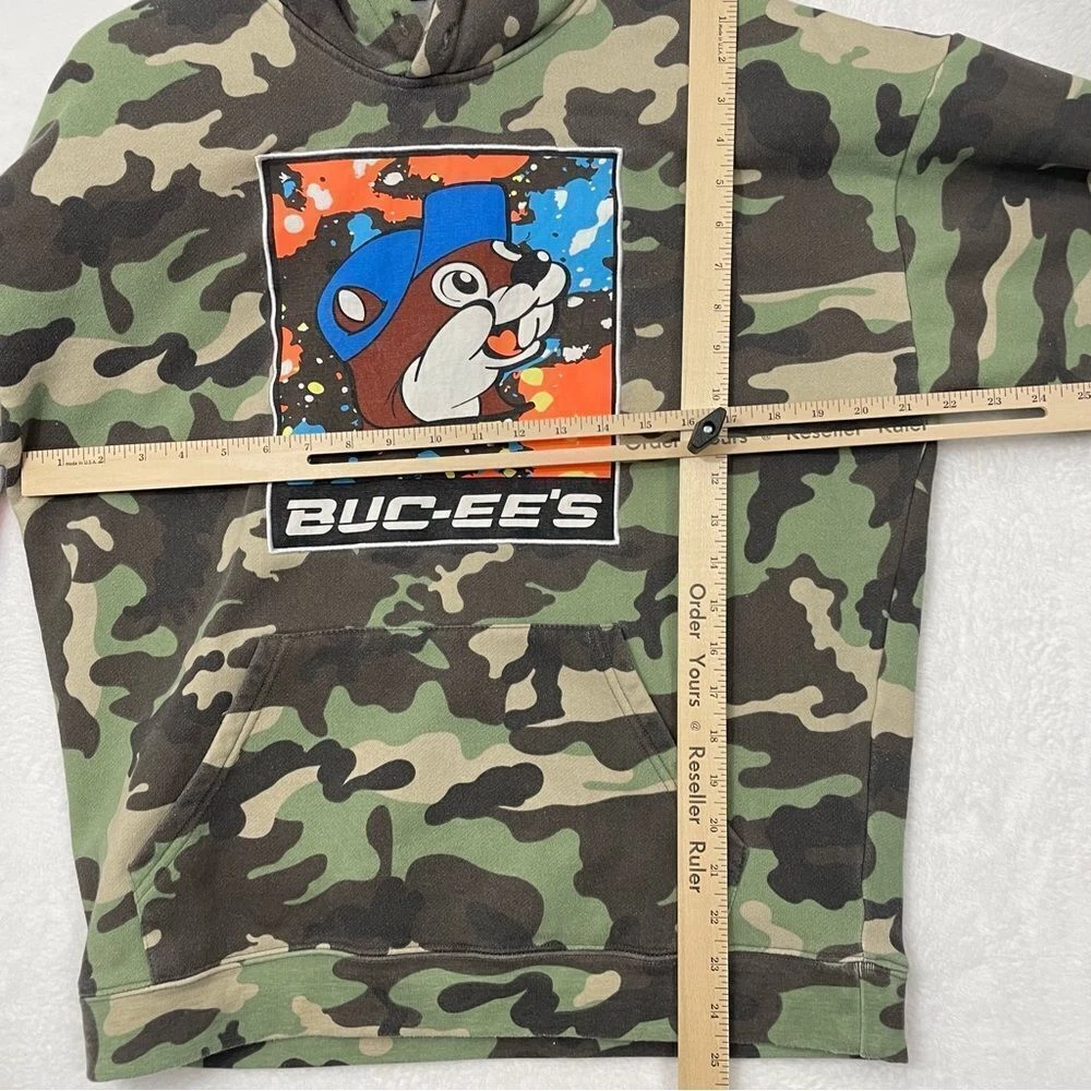 Buc-ee's Camo Pullover Youth Size Large Sweatshirt Hoodie Souvenir Beaver Country Fun bright graphics in front and on left arm sleeve. *Previously owned. Some light pilling noted and drawstrings to hoodie are missing. No holes, stains or rips. Clean, non smoking. Sold as seen in pictures. Feel free to reach out with any questions prior to purchase. Thank You!