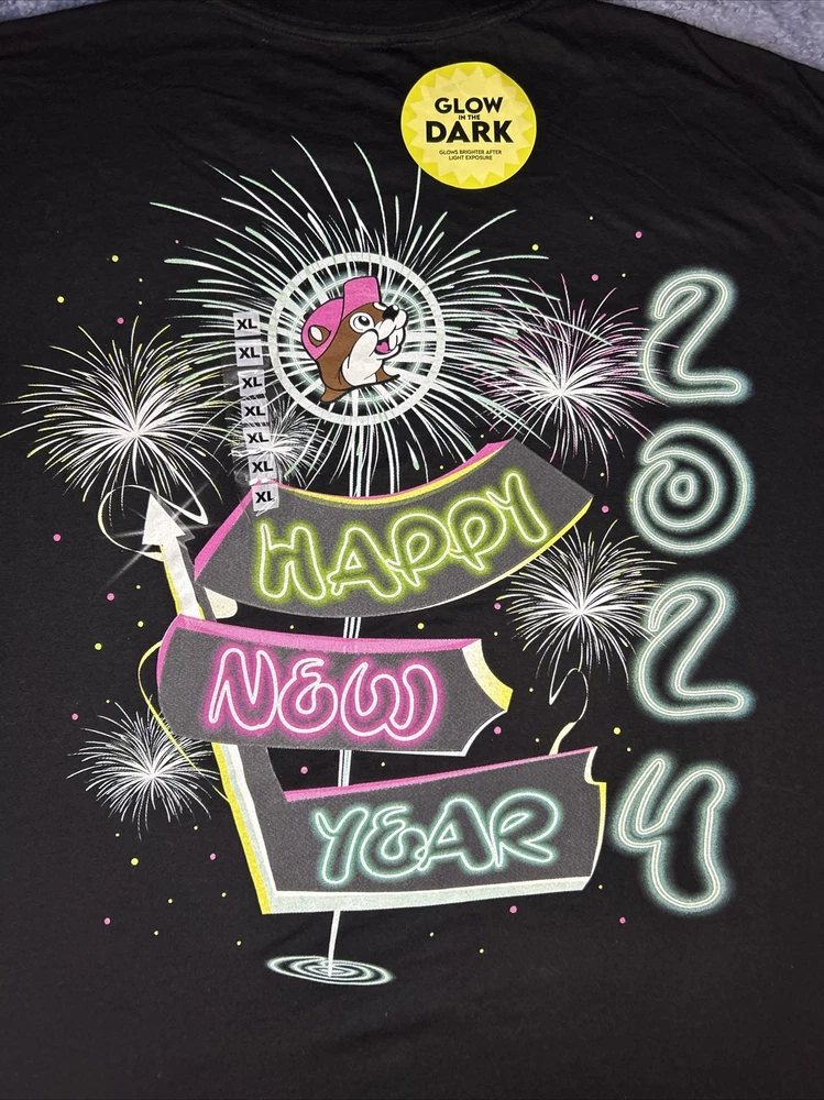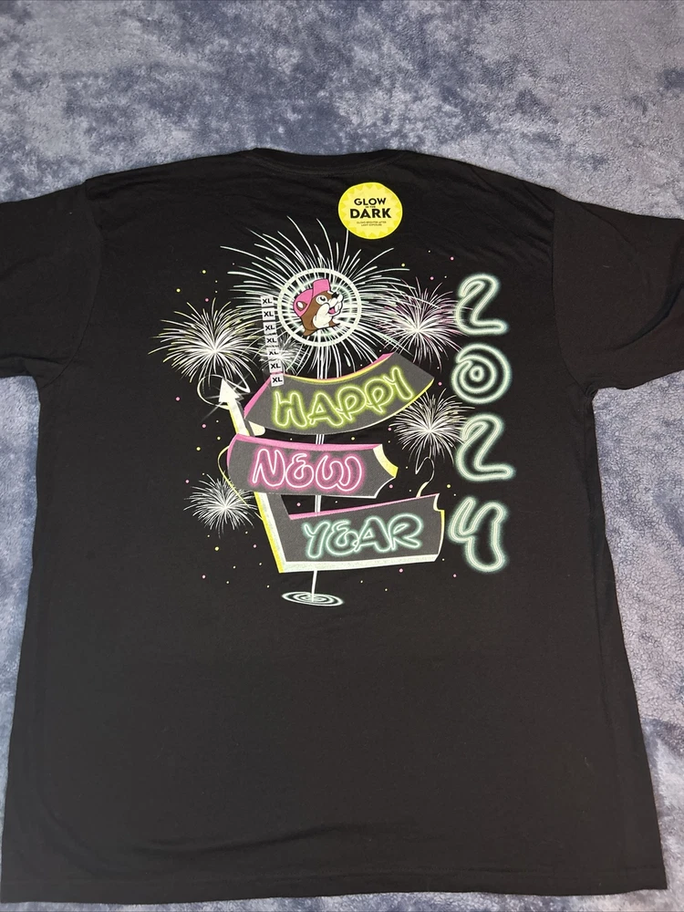 Bucees New Years 2024 Black Tee Shirt Adult Size XLarge Glow In The Dark buc ees