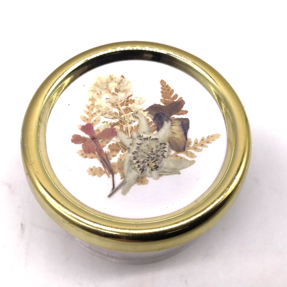 Bucherer Dried Flowers Lid Music Box Plays Swiss Jodel from Switzerland. Beautiful pressed dried flower arrangement on the lid protected by an acrylic top. The music box plays “Swiss “Jodel. There is a crack on the side of the lid that looks like a seam.