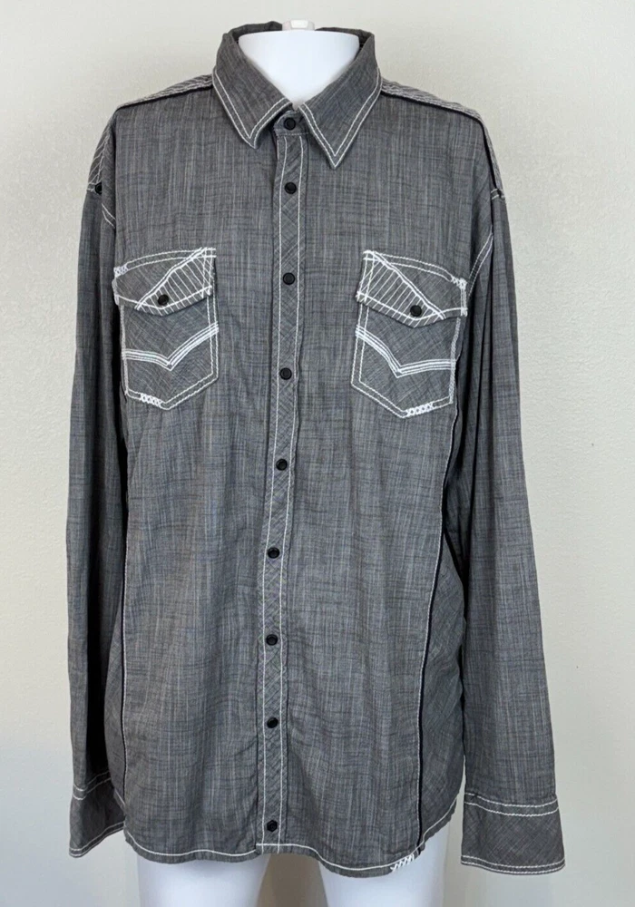 Gorgeous Buckle Black Athletic Fit charcoal gray stretch long sleeve snap up shirt in men's 2XL. The shirt has beautiful white stitching and black trim. It is lightweight and perfect for any occasion. This shirt is in excellent condition. No rips, tears or stains. Features: • Style Profile: Cowboy, Western, Classic, Retro, Rock, Grunge • Black snap buttons, stretch, point collar, flip cuffs, black trim, white stitching, embroidery, 2 button pockets, lightweight. • Machine Washable • Chest: 50 in •Length: 32 in This is a previously owned and used item. It may have signs of wear and previous use. We offer combined shipping to help save you some money!! Simply reach out to me to apply discount PLEASE NOTE: All measurements are approximate and taken with garment laid flat. Please look closely at pictures for measurements before purchasing. If you're not sure about the size, lay flat a similar item of your own and measure that item to compare with our measurements and feel free to message us with any questions. Colors may differ slightly in shade from photos to actual item due to variances caused by photography lighting and monitors. We greatly appreciate your business! Please remember to leave positive feedback if you are happy with your purchase! Thanks for looking!