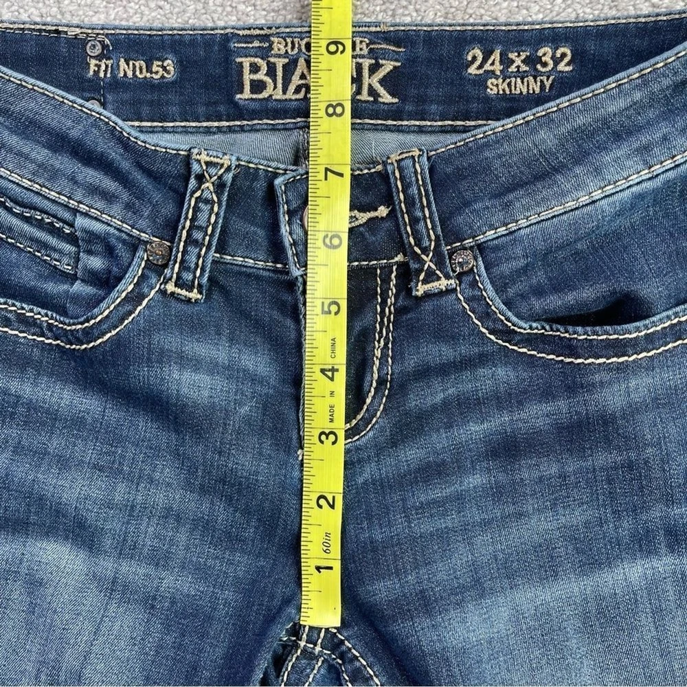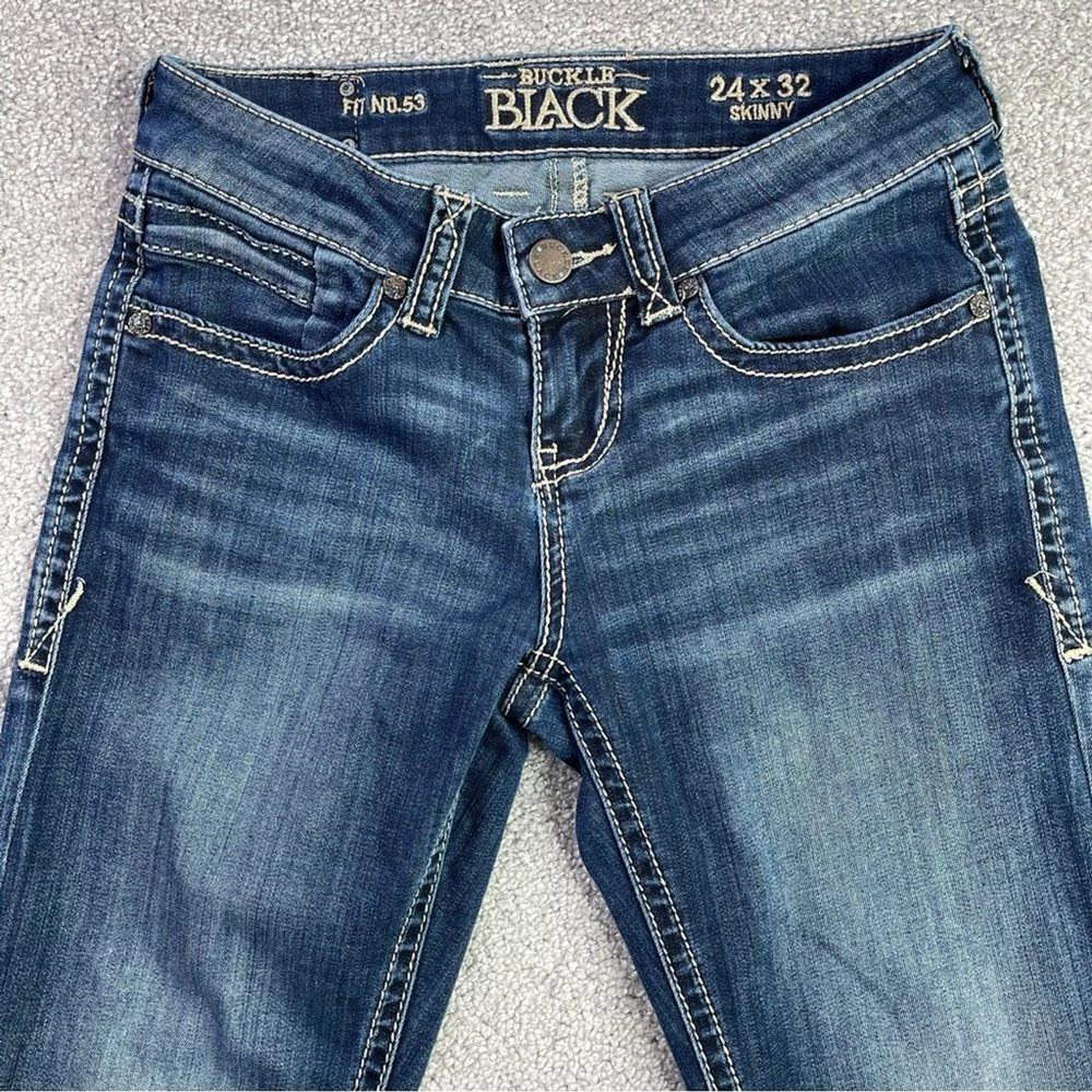 Rise: Low (6.5-8.5 in) Fabric Wash: Dark Color: Blue Fit: Regular Model: Buckle Black No. 53 Accents: Logo Country/Region of Manufacture: China Type: Jeans Handmade: No Brand: Buckle Material: Cotton Blend Department: Women Features: Stretch, Pockets Closure: Zip Size Type: Regular Style: Skinny Season: Winter, Summer, Spring, Fall Vintage: No Fabric Type: Denim Theme: Preppy, College, City, Festival, Grunge Inseam: 30 in Pattern: Solid Size: 24 Product Line: Buckle Bke Garment Care: Machine Washable Seller Notes: “In excellent, pre-owned condition with no flaws to note.” Waist Size: 24 in Personalize: No Pocket Type: 5-Pocket Design