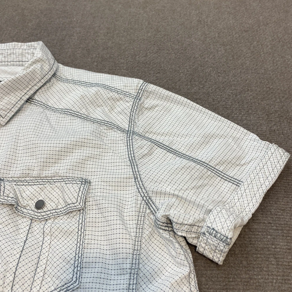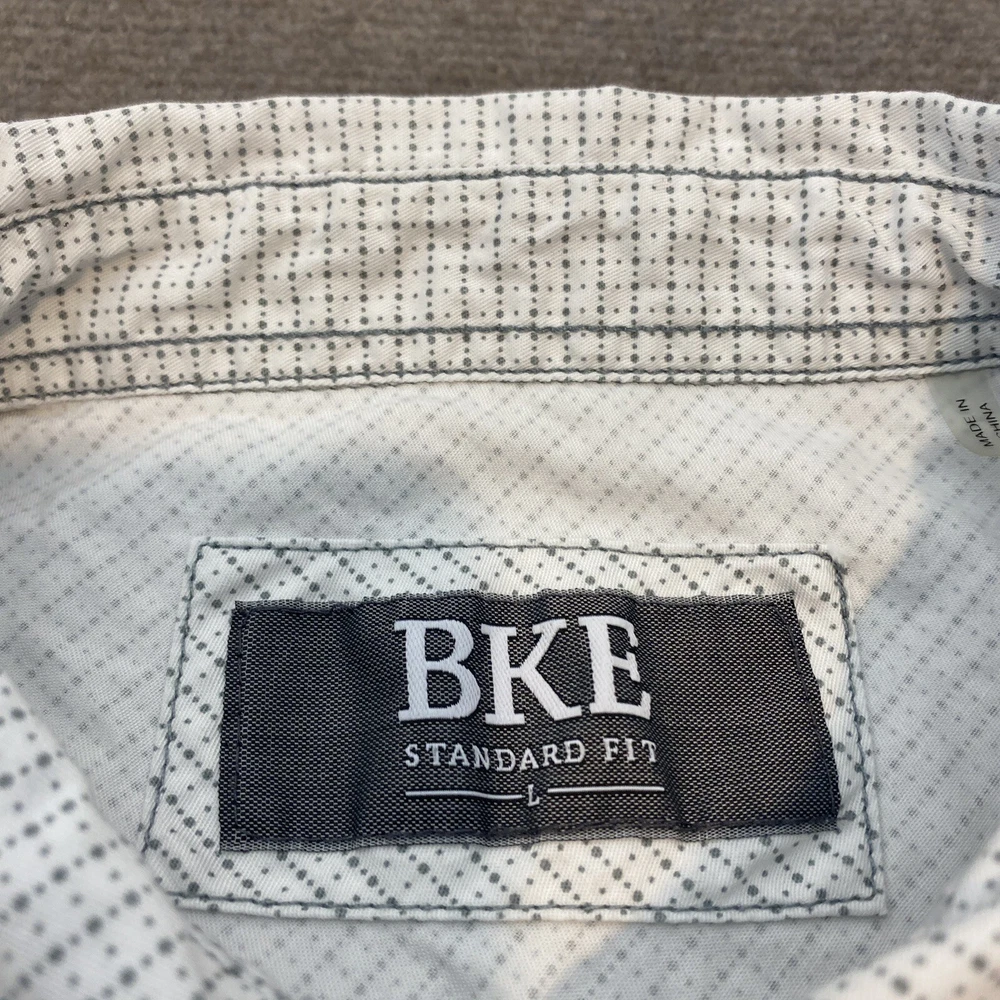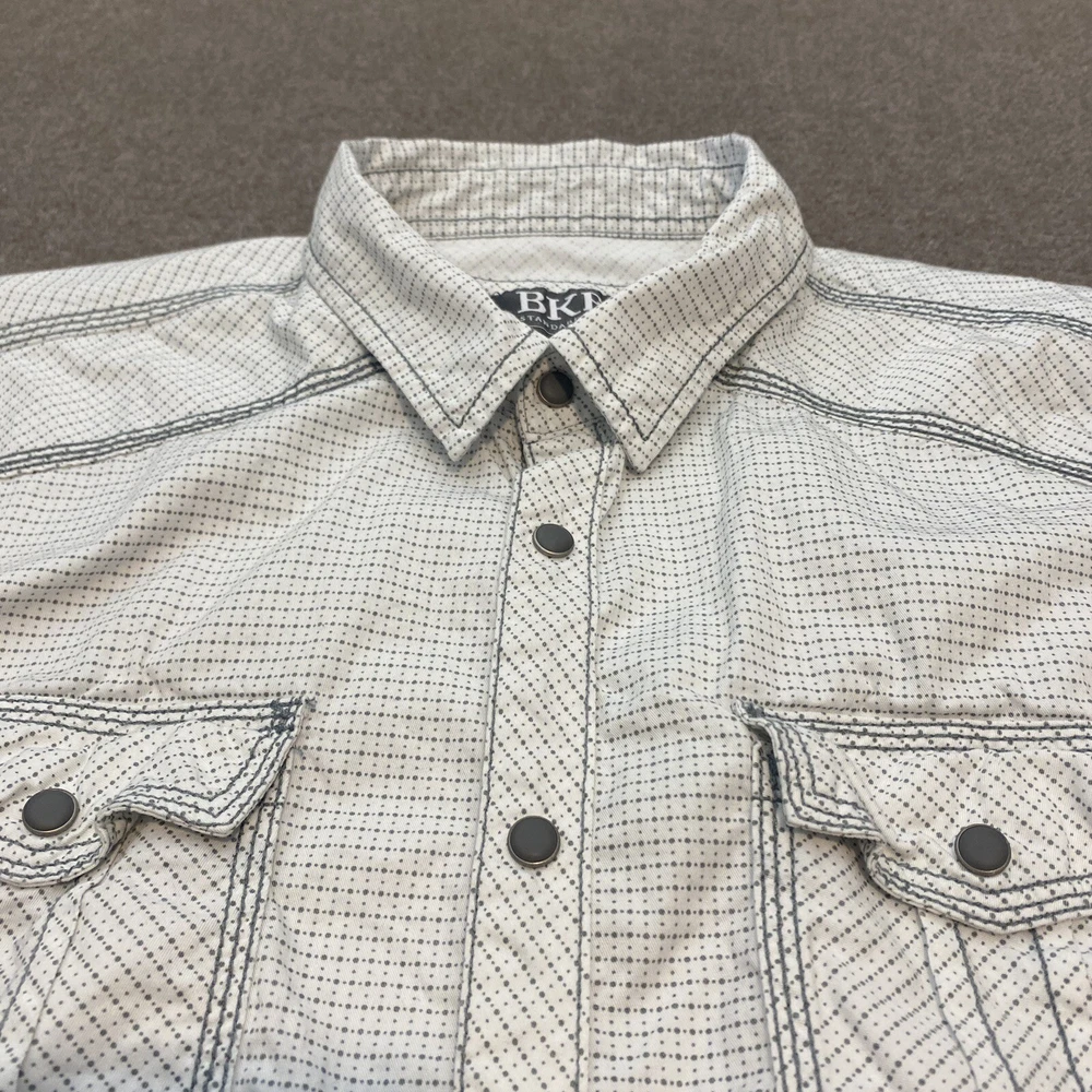 Fabric Type: Knit Color: Multicolor Occasion: Casual, Travel Fit: Classic Brand: Buckle Size: L Model: Pearl Snap Shirt Closure: Snap Vintage: No Material: Cotton Sleeve Length: Short Sleeve Department: Men Pattern: Polka Dot Product Line: BKE Buckle Collar Style: Point Country/Region of Manufacture: China Accents: Button Size Type: Regular Features: All Seasons, Stretch Character: BKE Neckline: Collared Theme: Western Type: Button-Up